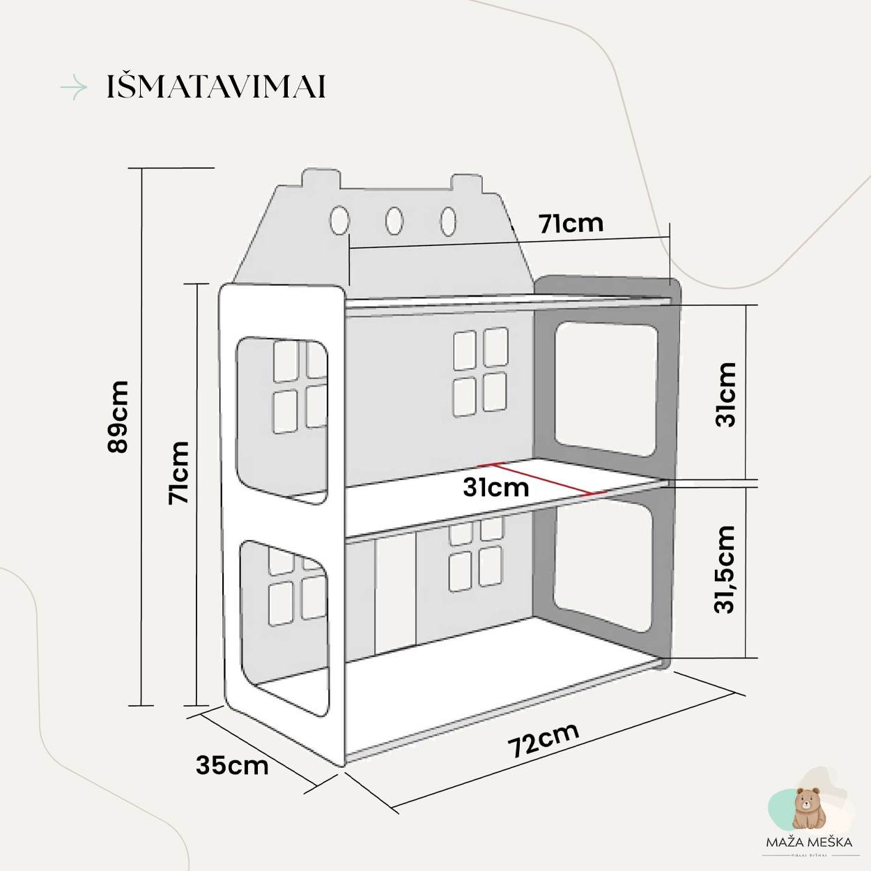 - Išmatavimai: ilgis 72 cm, gylis 35 cm, aukštis 89 cm, lentynų aukštis 31.5 cm ir 30 cm