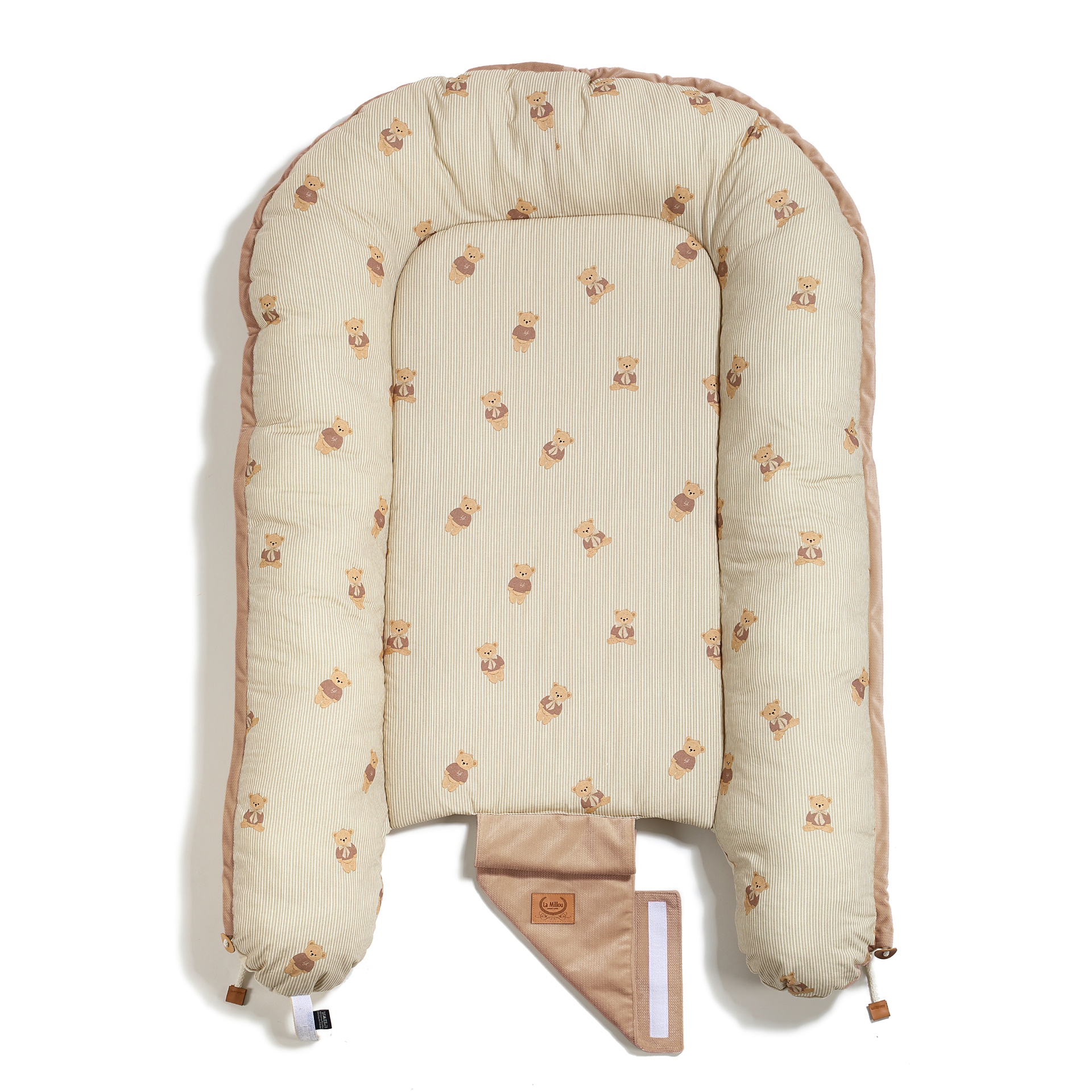 Šonai pripildyti minkštomis, hipoalerginėmis silikoninėmis granulėmis, kurios suteikia papildomo minkštumo ir saugumo. Lizdelio apačioje įsiūta elastinė vilna leidžia jį skalbti skalbimo mašinoje, nesijaudinant, kad vidinės dalys pasislinks. Lizdelį galima reguliuoti apačioje su raišteliu, todėl dydį galima pritaikyti pagal kūdikio amžių. Vyresniems vaikams lizdelis gali virsti draugiška žaidimų zona, kurioje vaikas gali nevaržomai judėti. Raištelis papildomai užsegamas saugumo juostele, todėl jis visiškai saugus mažyliui.