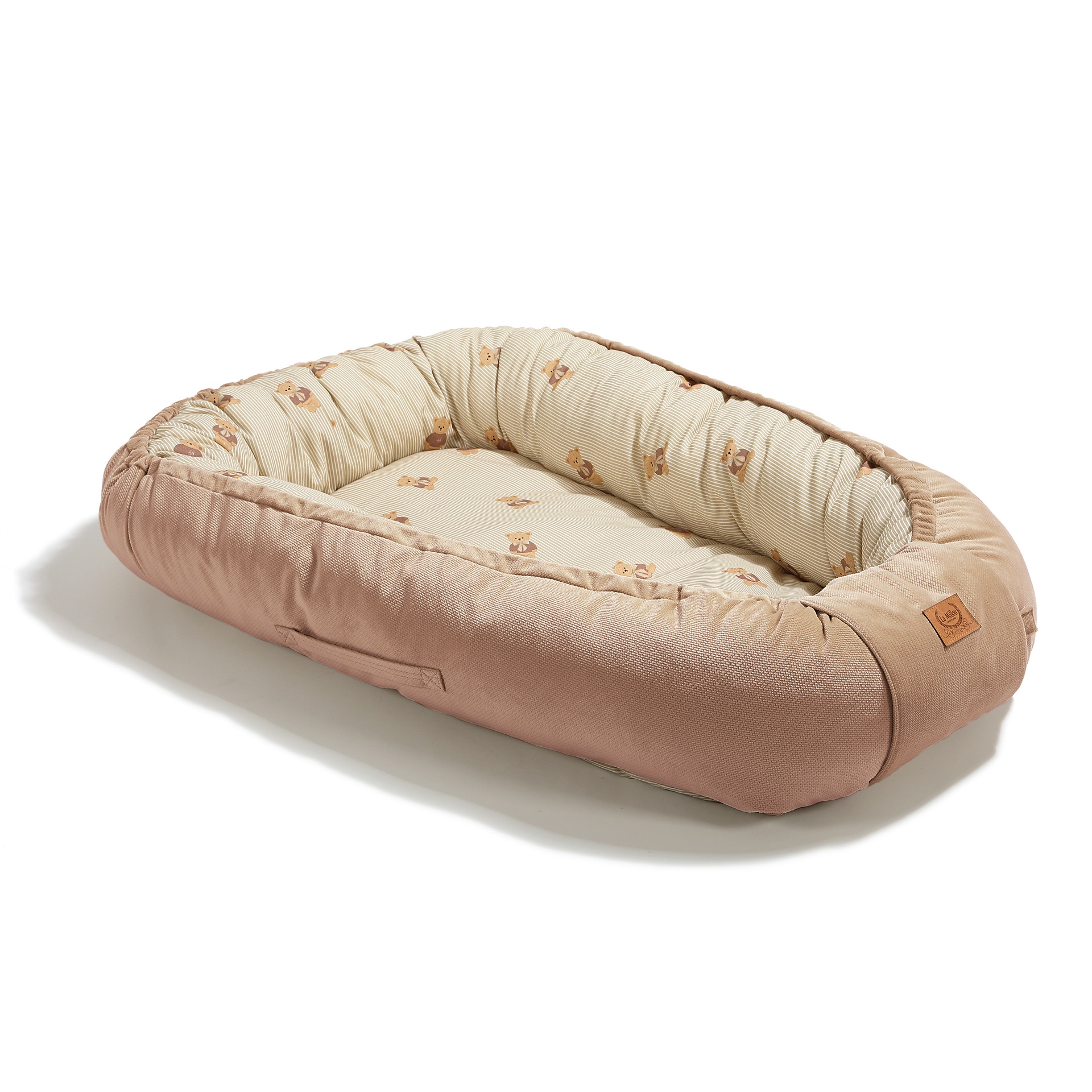 Aksominis Lizdelis yra prieinamas dviejų dydžių: Normal ir Grande. Normal versija kompaktiška, puikiai tinka mažesnėms lovelėms ar tėvų lovai. Grande versija, esant išplėstam apačios užsegimui, tinka lovoms nuo 60×120 cm ir net kelių metų vaikams suteikia jaukią vietą žaidimams ir poilsiui. ️