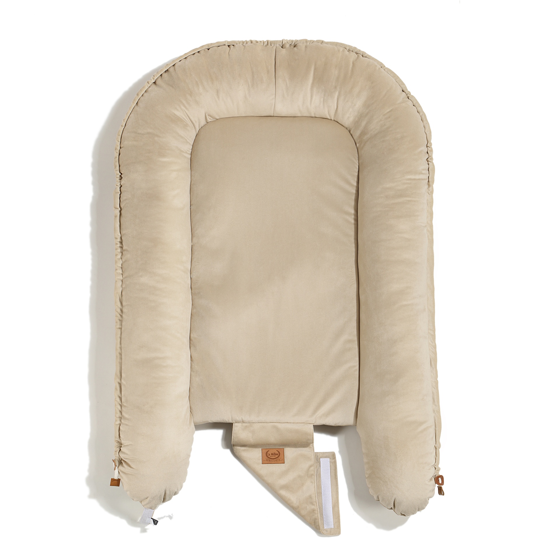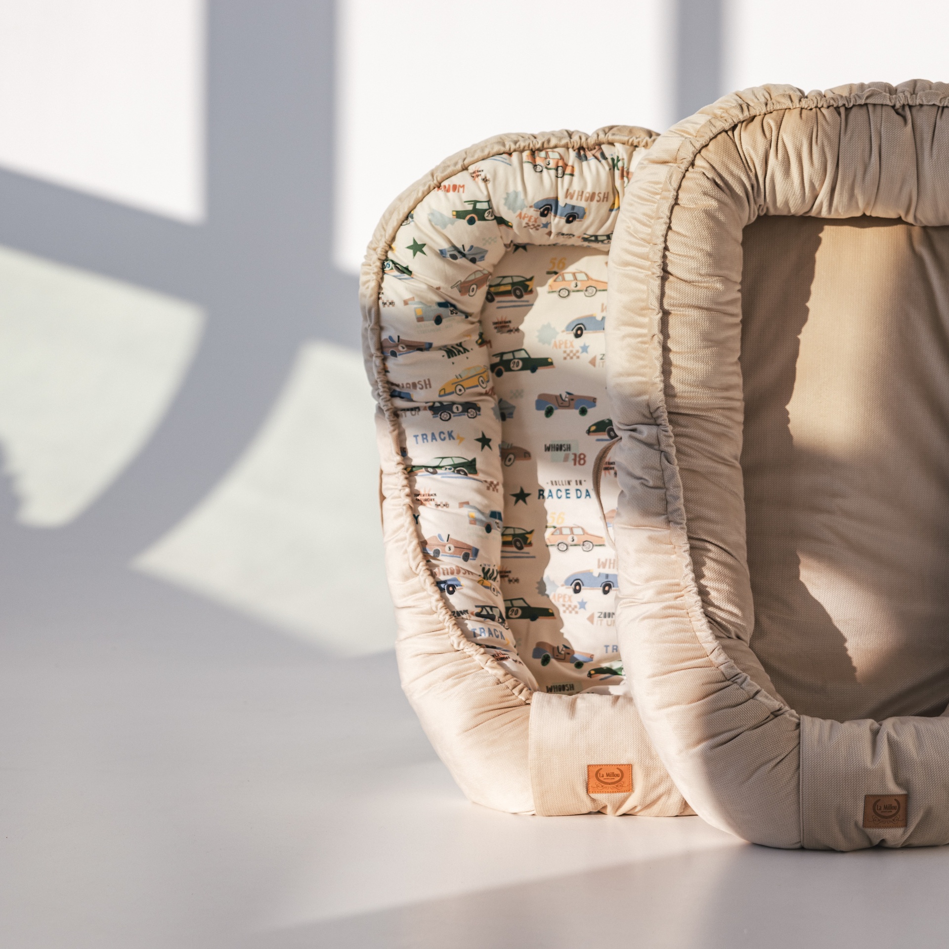 Šonai pripildyti minkštomis, hipoalerginėmis silikoninėmis granulėmis, kurios suteikia papildomo minkštumo ir saugumo. Lizdelio apačioje įsiūta elastinė vilna leidžia jį skalbti skalbimo mašinoje, nesijaudinant, kad vidinės dalys pasislinks. Lizdelį galima reguliuoti apačioje su raišteliu, todėl dydį galima pritaikyti pagal kūdikio amžių. Vyresniems vaikams lizdelis gali virsti draugiška žaidimų zona, kurioje vaikas gali nevaržomai judėti. Raištelis papildomai užsegamas saugumo juostele, todėl jis visiškai saugus mažyliui.