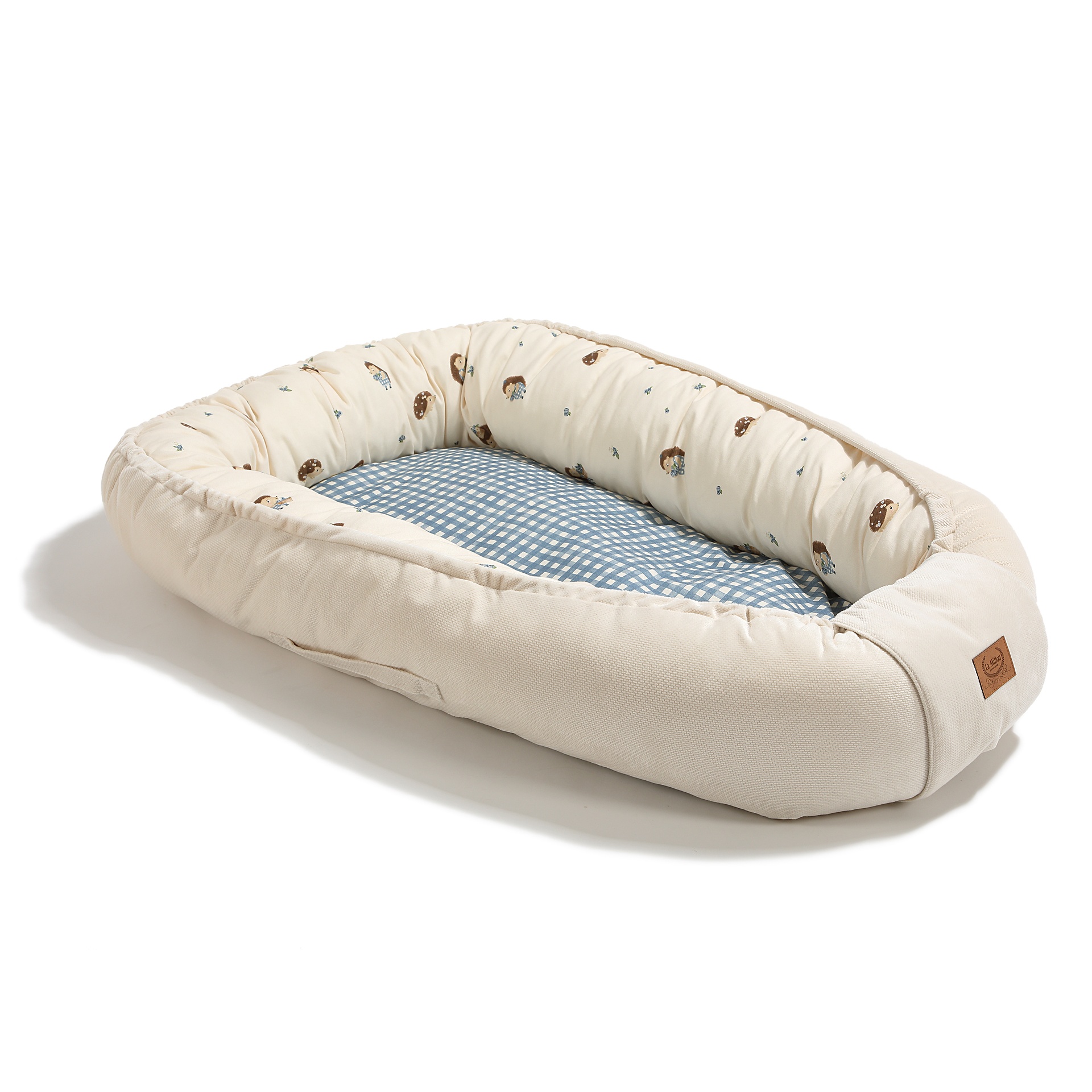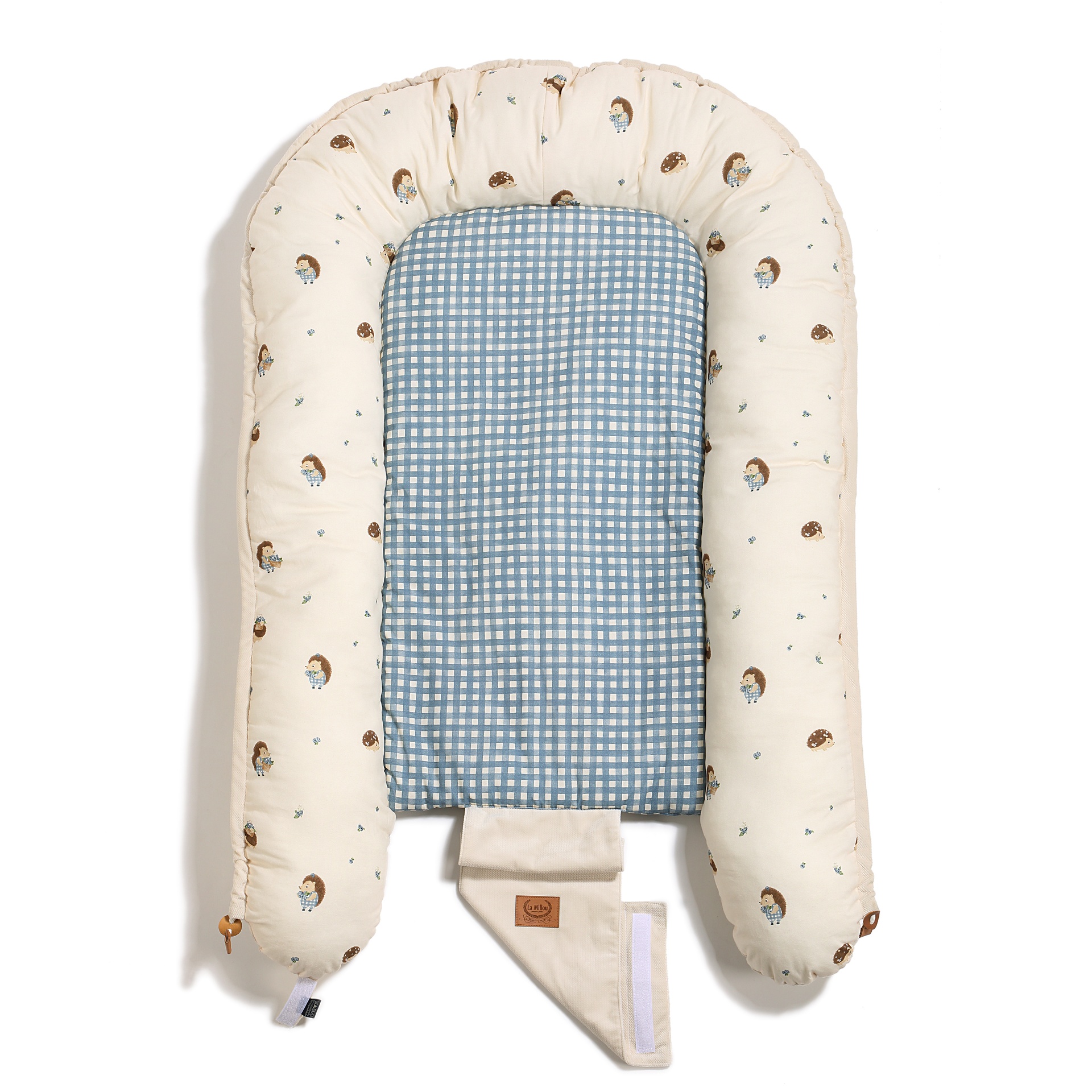 Šonai pripildyti minkštomis, hipoalerginėmis silikoninėmis granulėmis, kurios suteikia papildomo minkštumo ir saugumo. Lizdelio apačioje įsiūta elastinė vilna leidžia jį skalbti skalbimo mašinoje, nesijaudinant, kad vidinės dalys pasislinks. Lizdelį galima reguliuoti apačioje su raišteliu, todėl dydį galima pritaikyti pagal kūdikio amžių. Vyresniems vaikams lizdelis gali virsti draugiška žaidimų zona, kurioje vaikas gali nevaržomai judėti. Raištelis papildomai užsegamas saugumo juostele, todėl jis visiškai saugus mažyliui.