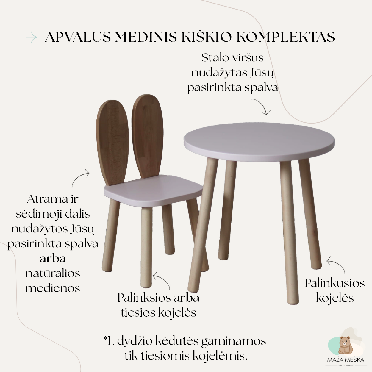 | Staliuko ir kėdutės kojų spalva | Natūralios, medinės, Pasirinktos spalvos, Pusiau baltos, Pusiau spalvotos – pasirinktos spalvos |