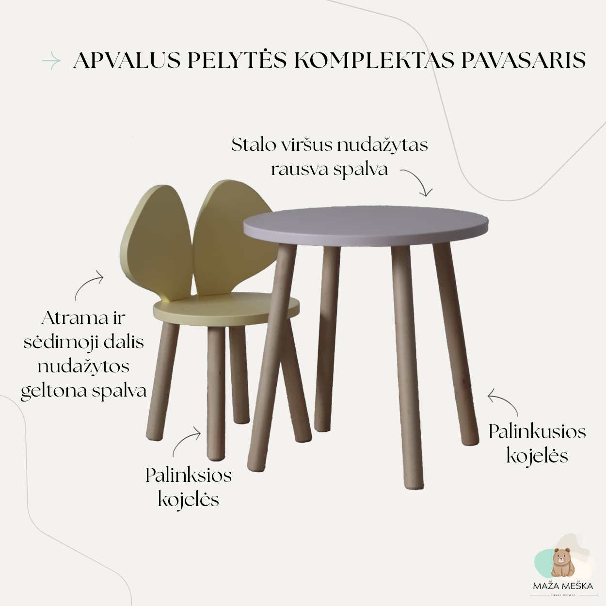 APVALUS MEDINIS PELYTĖS KOMPLEKTAS „PAVASARIS“ atkeliauja rausvu stalviršiu ir natūralios medienos kojelėmis. Kėdutės atrama ir sėdimoji dalis priderintos geltonos spalvos, tam, kad atspindėtų pavasario jaukumą. Taip pat galite kojelėms uždėti baltas „kojines“. Staliukas ir kėdutės galimos tik palinkusiomis kojelėmis! Staliuko ir kėdutės aukštį galite pasirinkti pagal savo pageidavimus.