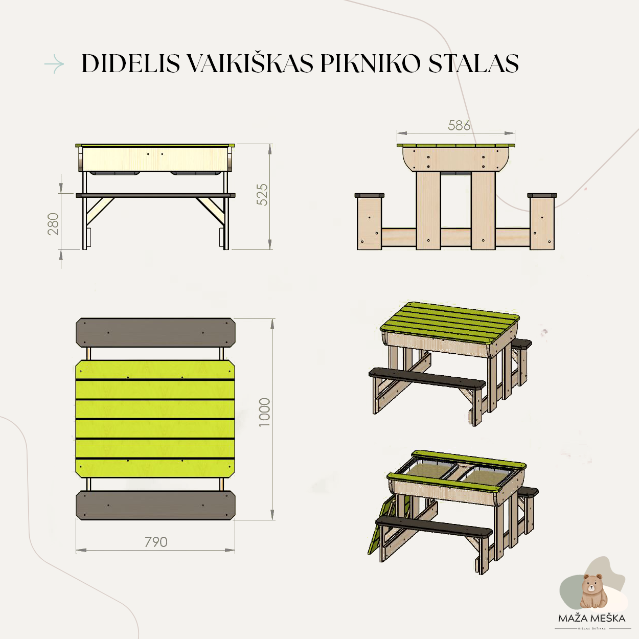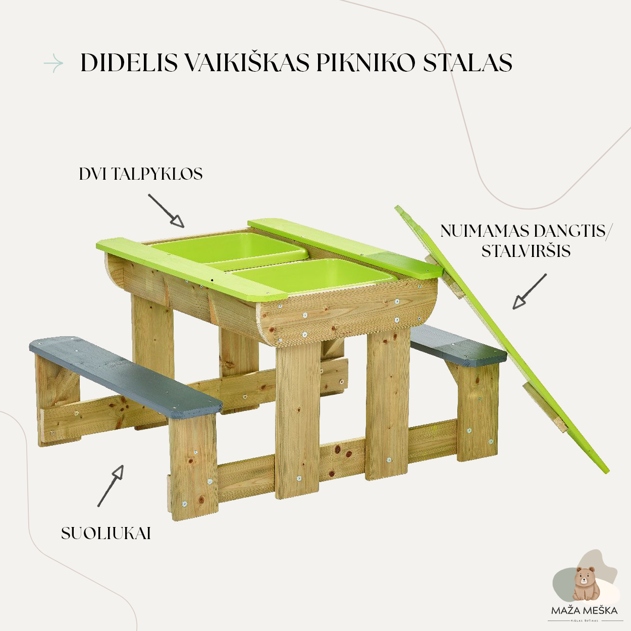 Didelis Vaikiškas Pikniko Stalas su Smėlio ir Vandens Indais – kūrybiškam žaidimui lauke! Mūsų daugiafunkcis pikniko stalas su suoliukais – tai ne tik stalas, bet visa žaidimų erdvė mažiesiems kūrėjams! Čia vaikai gali piešti, lipdyti smėlio pilis, kurti rankdarbius ar tiesiog mėgautis pikniku gryname ore.