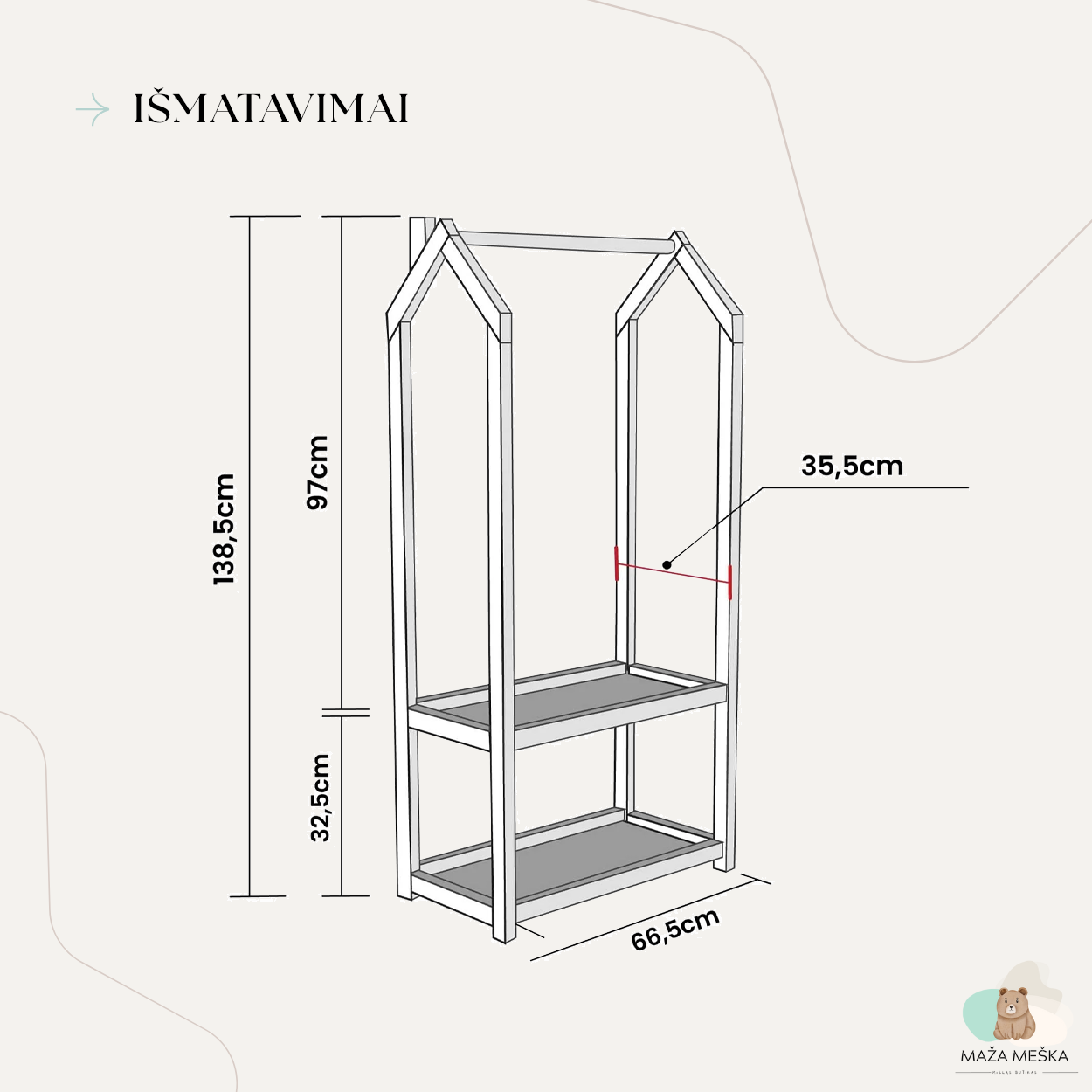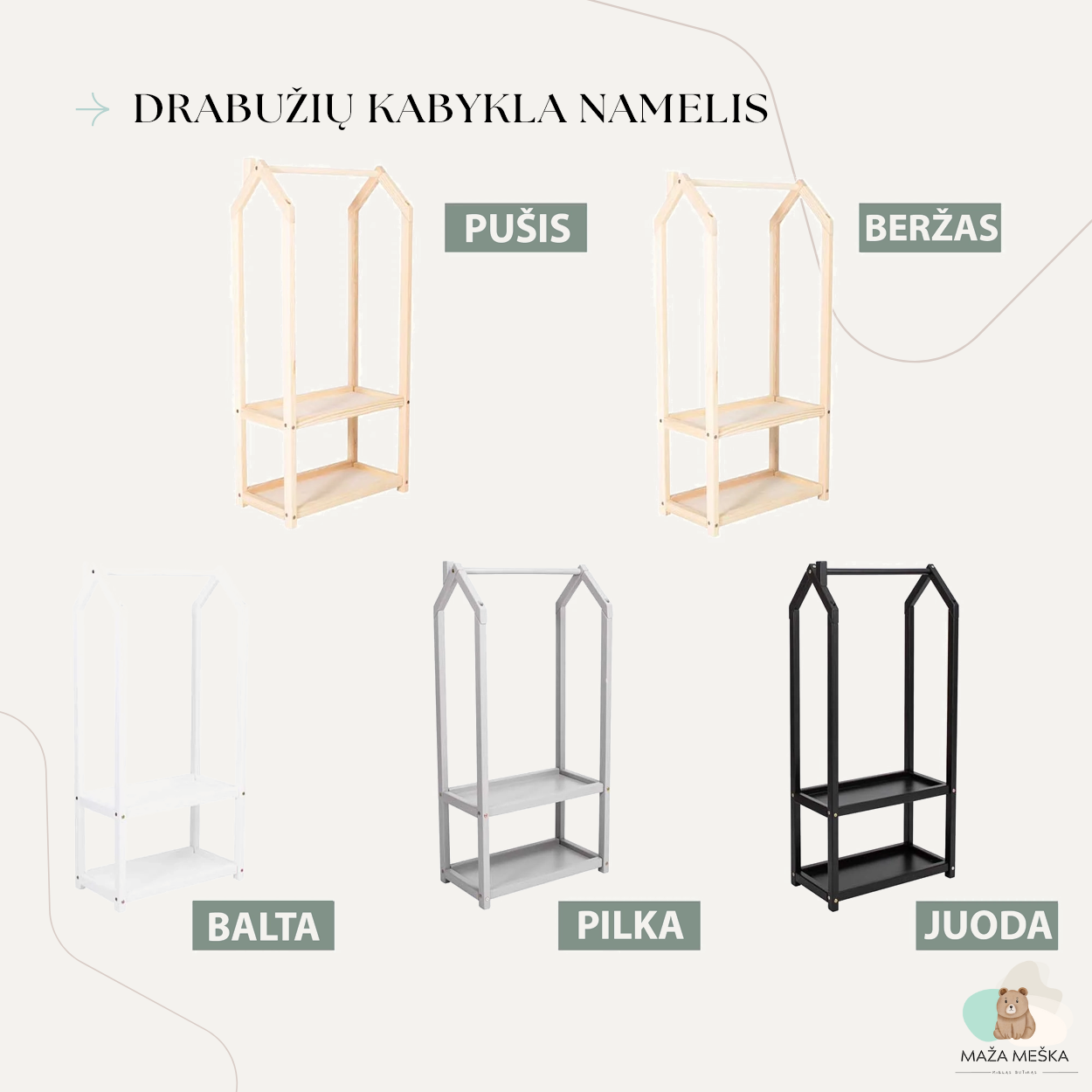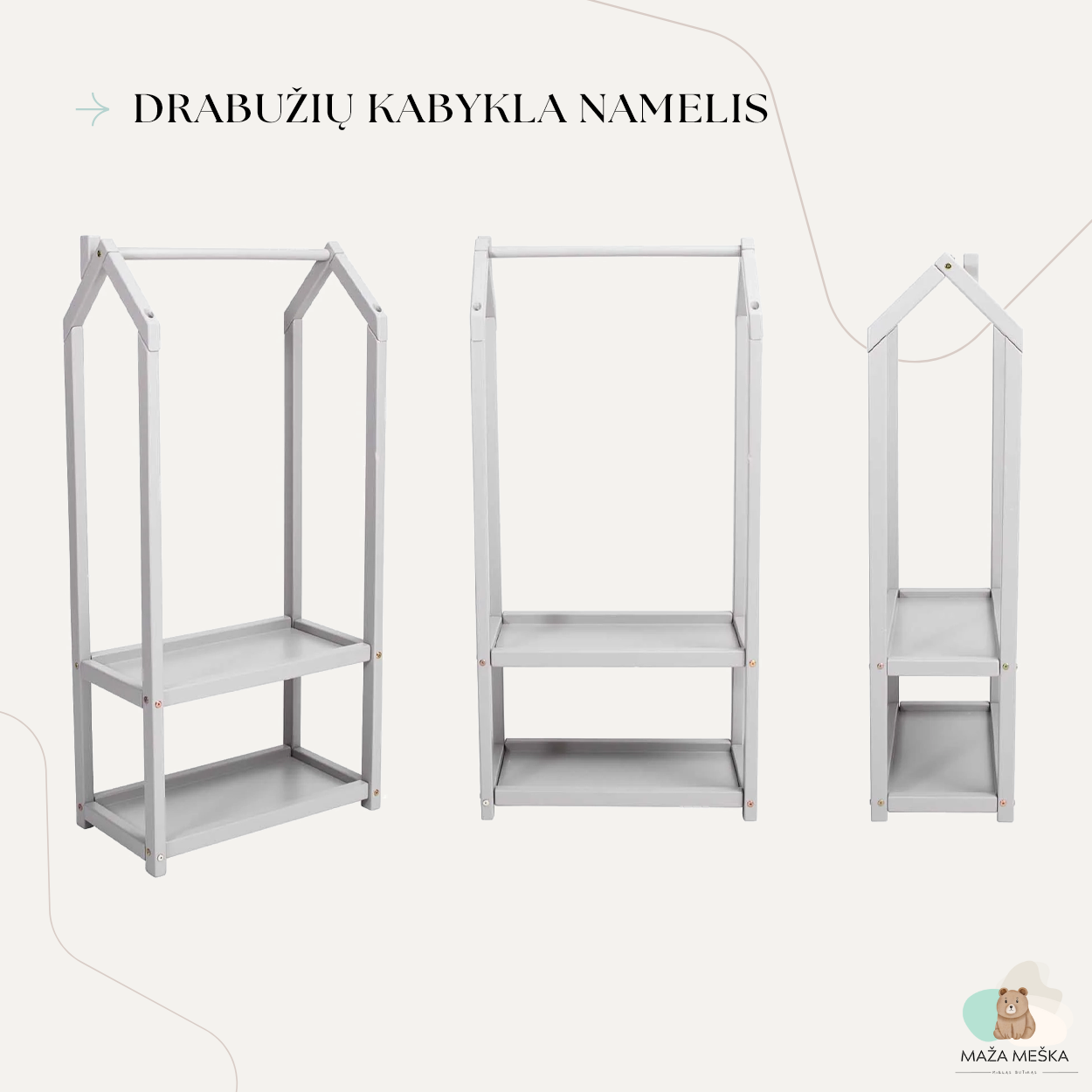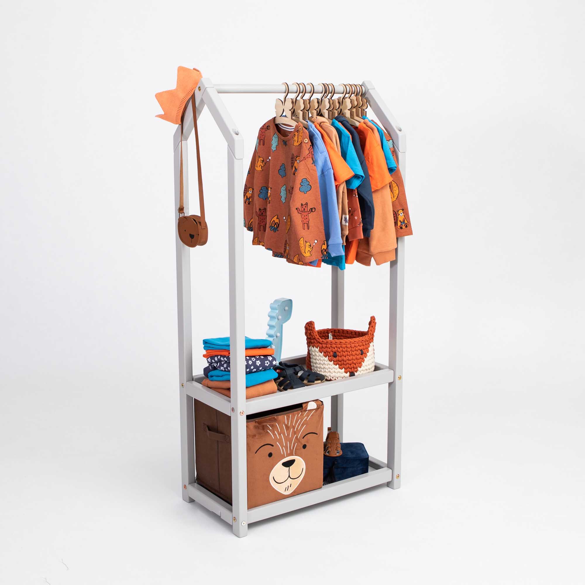 Šioje kabyklėlėje vaikai ne tik galės tvarkingai laikyti savo drabužius, bet ir džiaugsis galimybe patys išsirinkti, ką apsirengti. Bet tai dar ne viskas! Kabykla-namelis apačioje turi erdvią lentynėlę, kuri taps tikru mažųjų lobynėliu – čia tilps jų mylimi žaislai, knygelės ar batukai. Tai ne tik drabužių kabykla, bet ir kūrybiškumo erdvė! Vaikai gali paversti šią kabyklą nameliu lėlėms, parduotuve ar net maža slėptuve savo mažiems turtams. Ji tampa universalia žaidimų vieta, kuri leidžia vaikams kurti savo pasaulį ir įsijausti į įvairius vaidmenis.