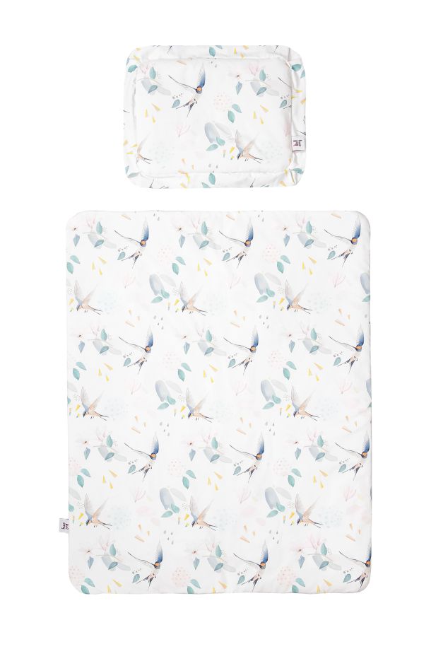 Patalynė pagaminta iš 100 % aukštos kokybės medvilnės su OEKO-TEX Standard 100 sertifikatu – tai reiškia, kad audinys yra saugus ir be kenksmingų medžiagų. Medvilnės audinys yra švelnus, kvėpuojantis, pralaidus orui – puikiai tinkamas jautriai kūdikio odai. Šio komplekto užpildas – puri, elastinga ir hipoalerginė silikoninė vata, padedanti reguliuoti šilumą ir drėgmę – mažylis visada miegos patogiai, nesijaus nei per karšta, nei per šalta.