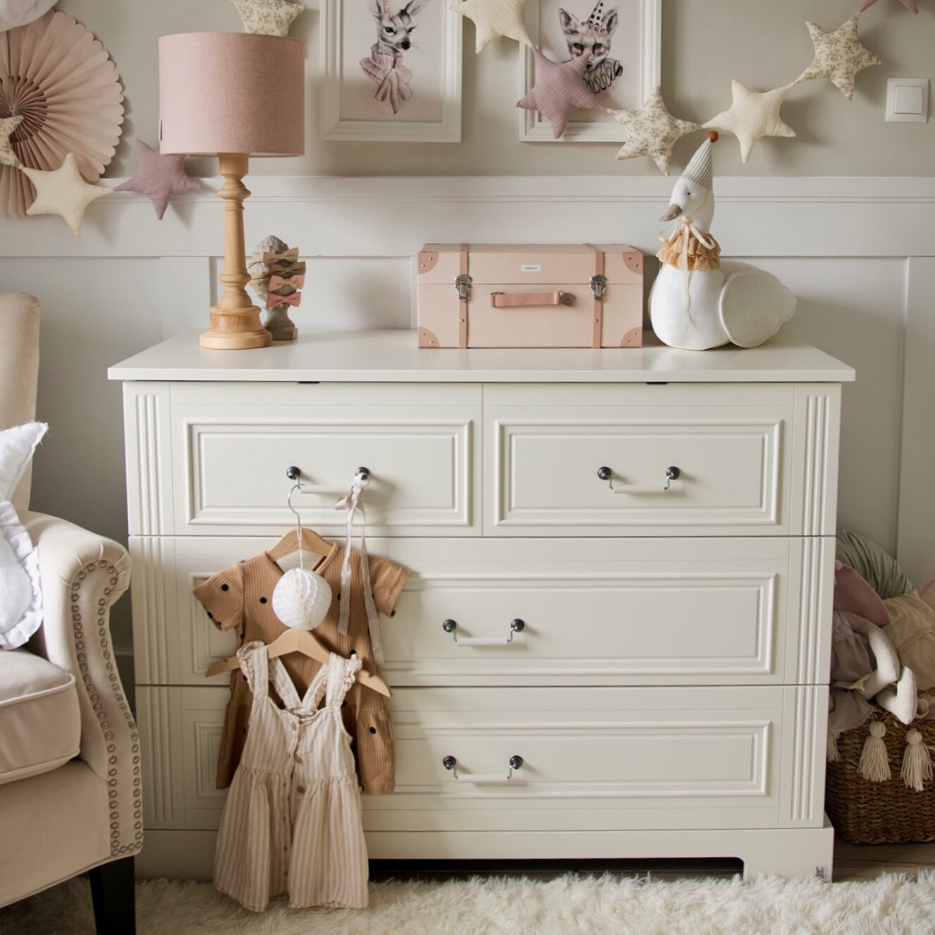 IDĖ Elegantiška Balta Komoda Vaiko Kambariui – tai klasikinio stiliaus komoda, derinanti estetiką, funkcionalumą ir ilgaamžiškumą. Sukurta su meile tiek vaikų kambariui, tiek tėvų miegamajam, ši 4 stalčių komoda atitinka net išrankiausių tėvų poreikius. 🤍