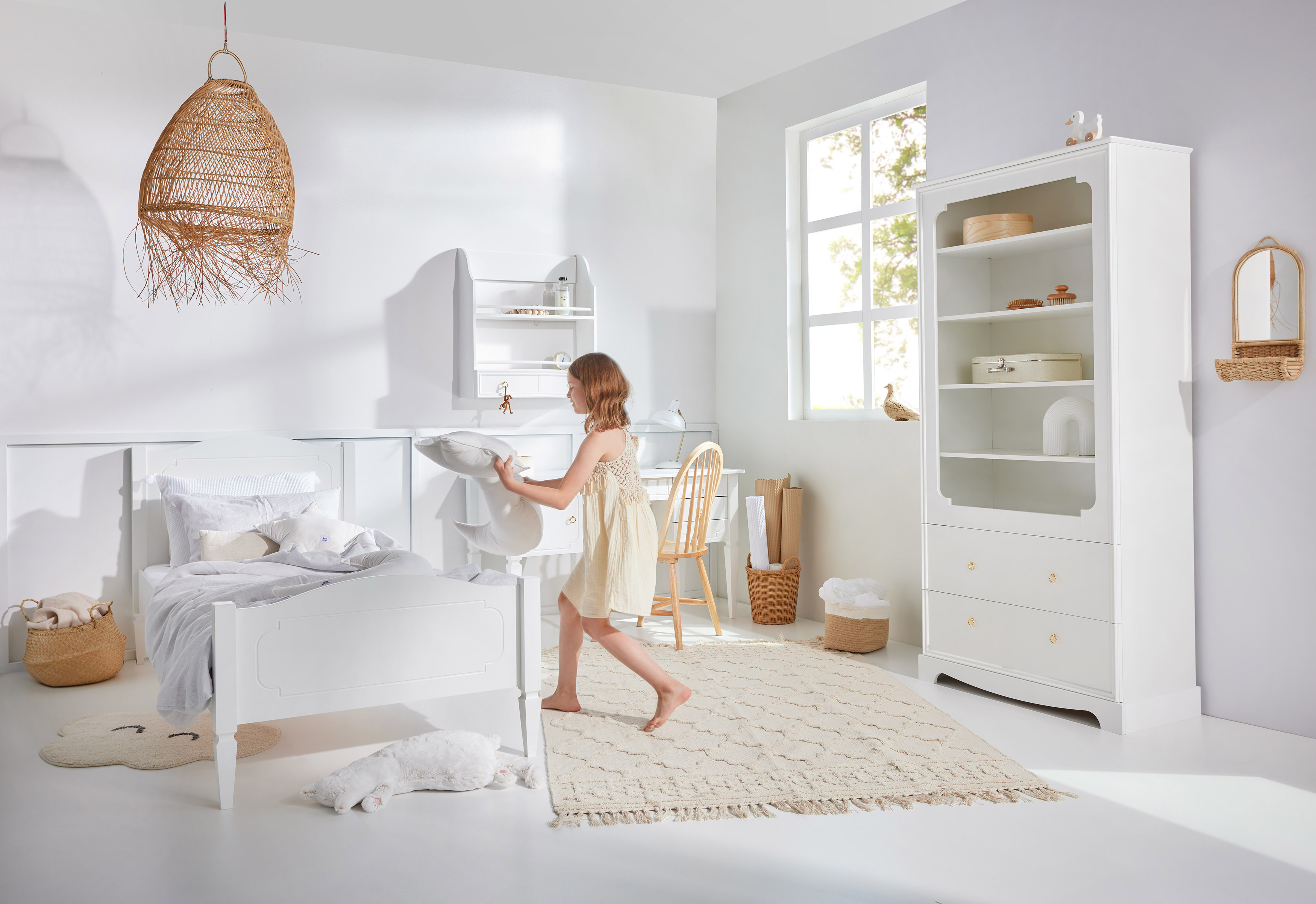 Baltos spalvos atspalvis (NCS S 0505-R70B) yra subtilus ir nesenstantis – puikiai dera tiek romantiškuose, tiek moderniuose interjeruose. Rekomenduojama tvirtinti prie sienos – dėl aukščio ir vaikų saugumo.