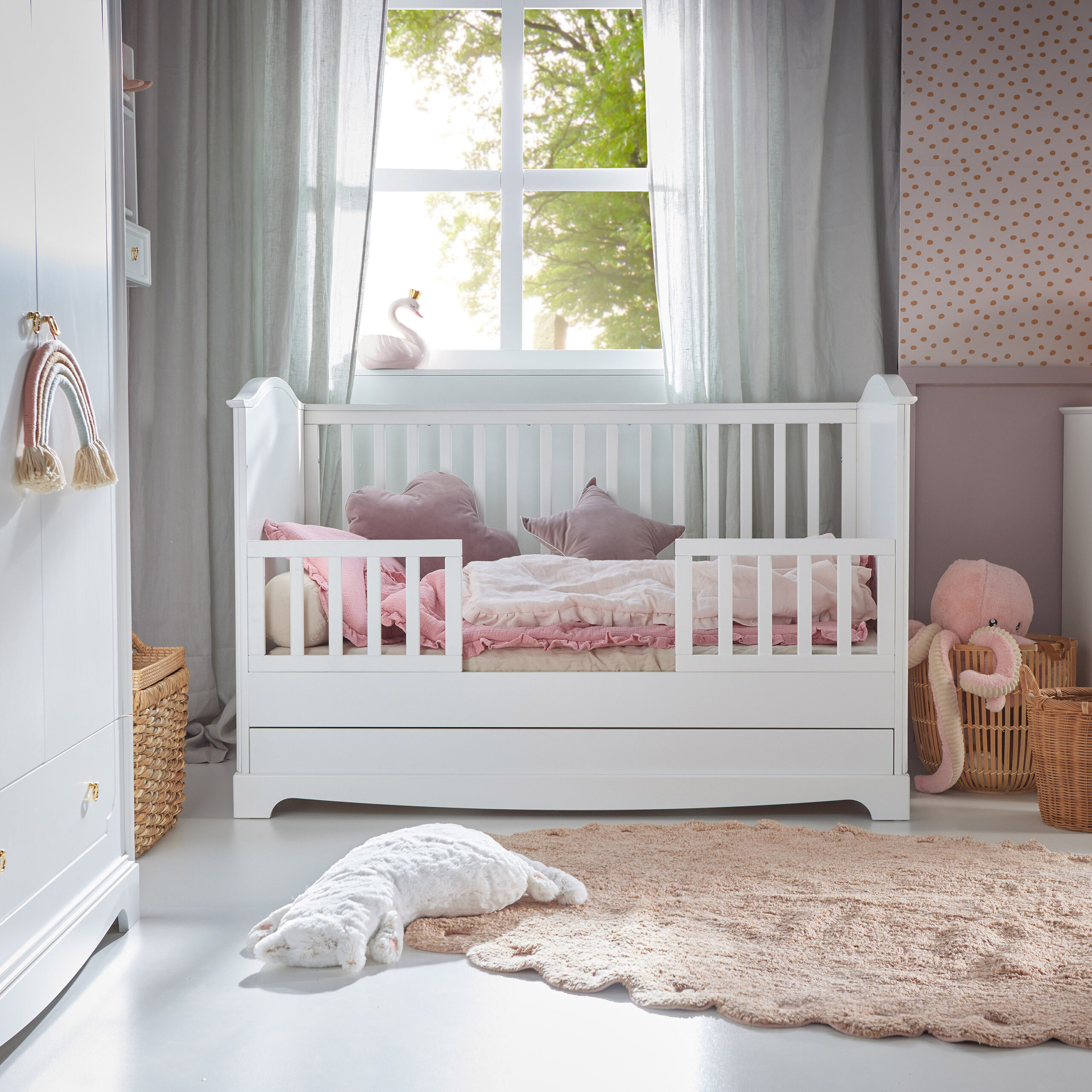 Vienoje pusėje esančios trys išimamos grotelės leidžia vaikui savarankiškai įlipti ar išlipti iš lovos. Paaugus mažyliui, priekinį rėmą galima visiškai nuimti ir lovytę paversti į sofą, o papildomai galima įsigyti ir apsauginį bortelį nuo iškritimo (pasirinktinai). 🛏️