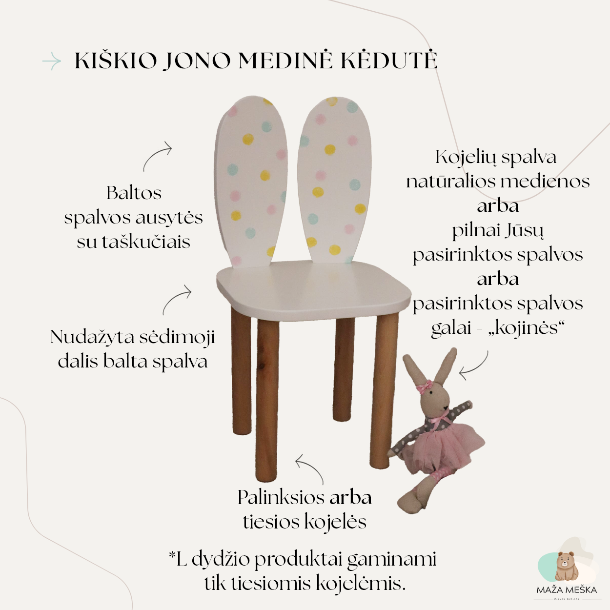 | Staliuko ir kėdutės kojų spalva | Natūralios, medinės, Pasirinktos spalvos, Pusiau baltos, Pusiau spalvotos – pasirinktos spalvos |