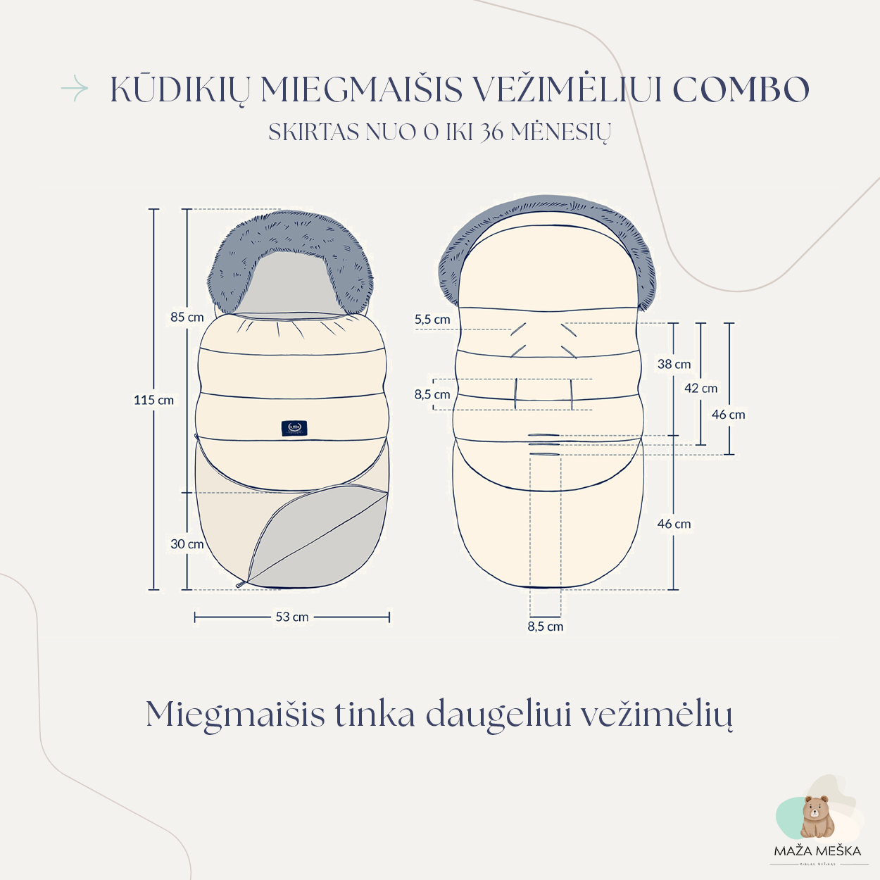 Kūdikių miegmaišis vežimėliui Combo GINGER – tai modulinis žiemos miegmaišis, sukurtas jūsų mažyliui nuo gimimo iki 3 metų. Jis yra universalus ir pritaikytas tiek lopšiui, tiek vežimėliui, o prireikus gali būti naudojamas kaip miegmaišis rogutėms. Šiltas, jaukus ir lengvas – idealus pasirinkimas šaltoms žiemos dienoms.