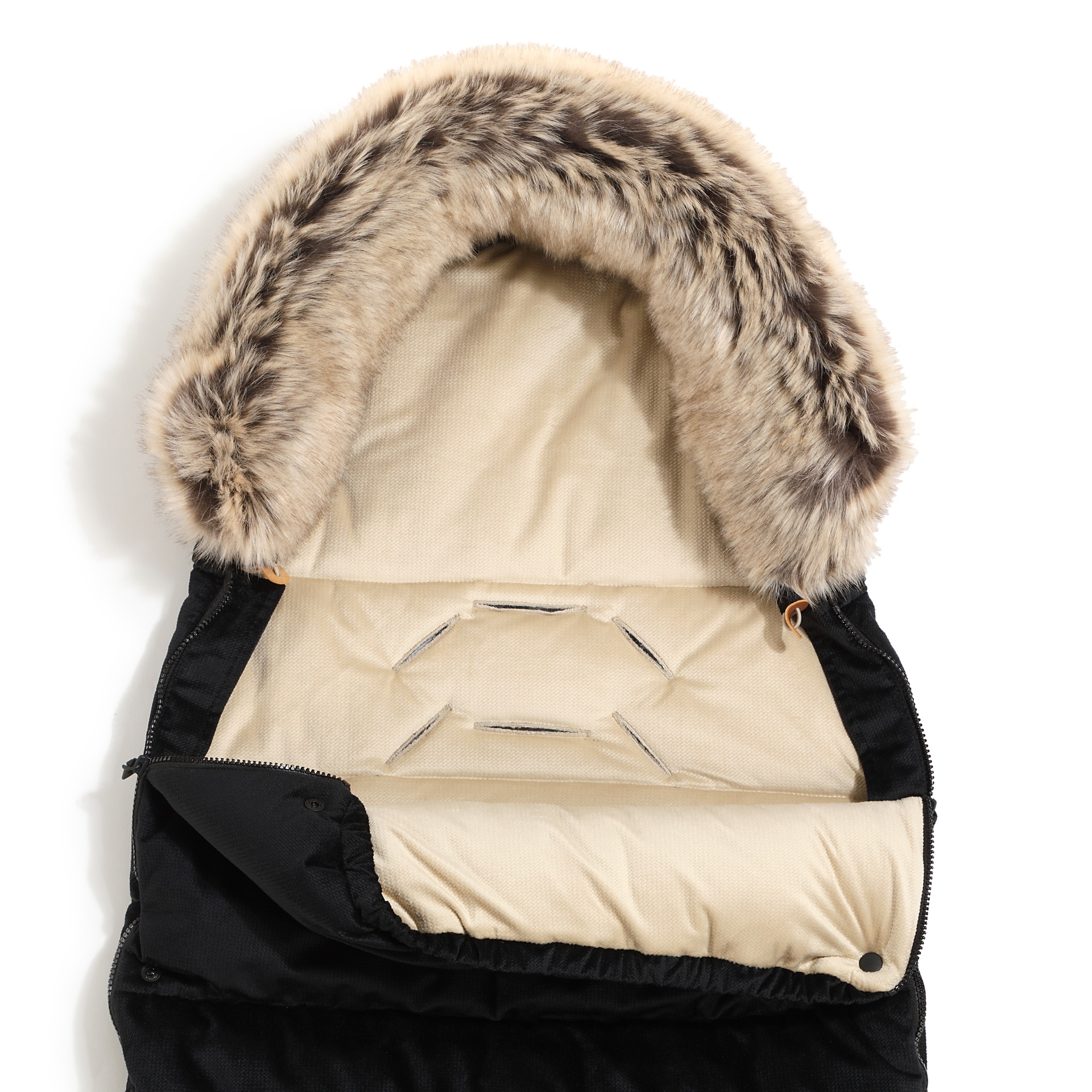 Miegmaišis pritaikytas daugumai vežimėlių su 5 taškų saugos sistema, o viršuje įsiūtas audinys neleidžia miegmaišiui slysti naudojimo metu. Reguliuojama gobtuvo dalis suteikia papildomą šilumą galvai ir baigta nuimamu kailiu.