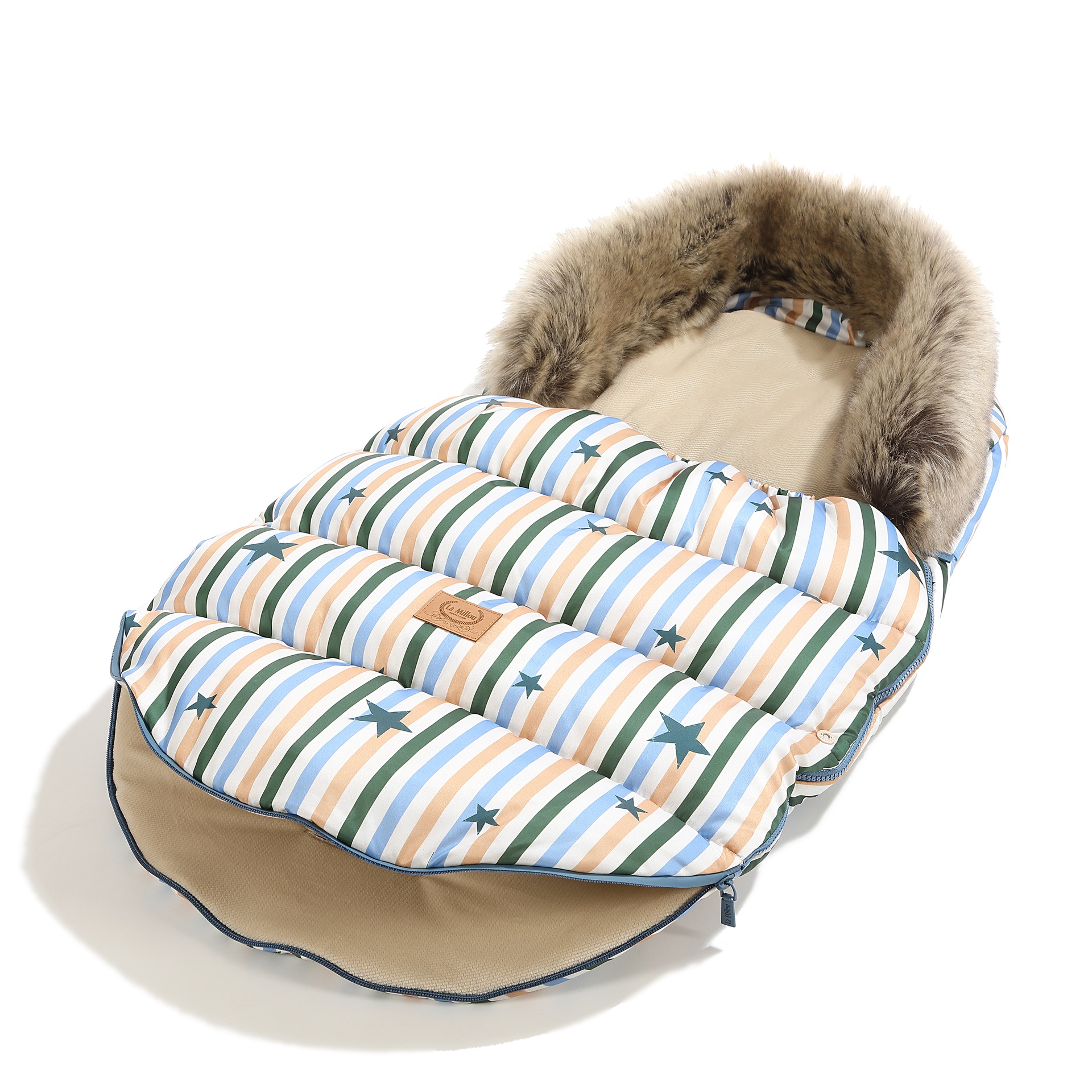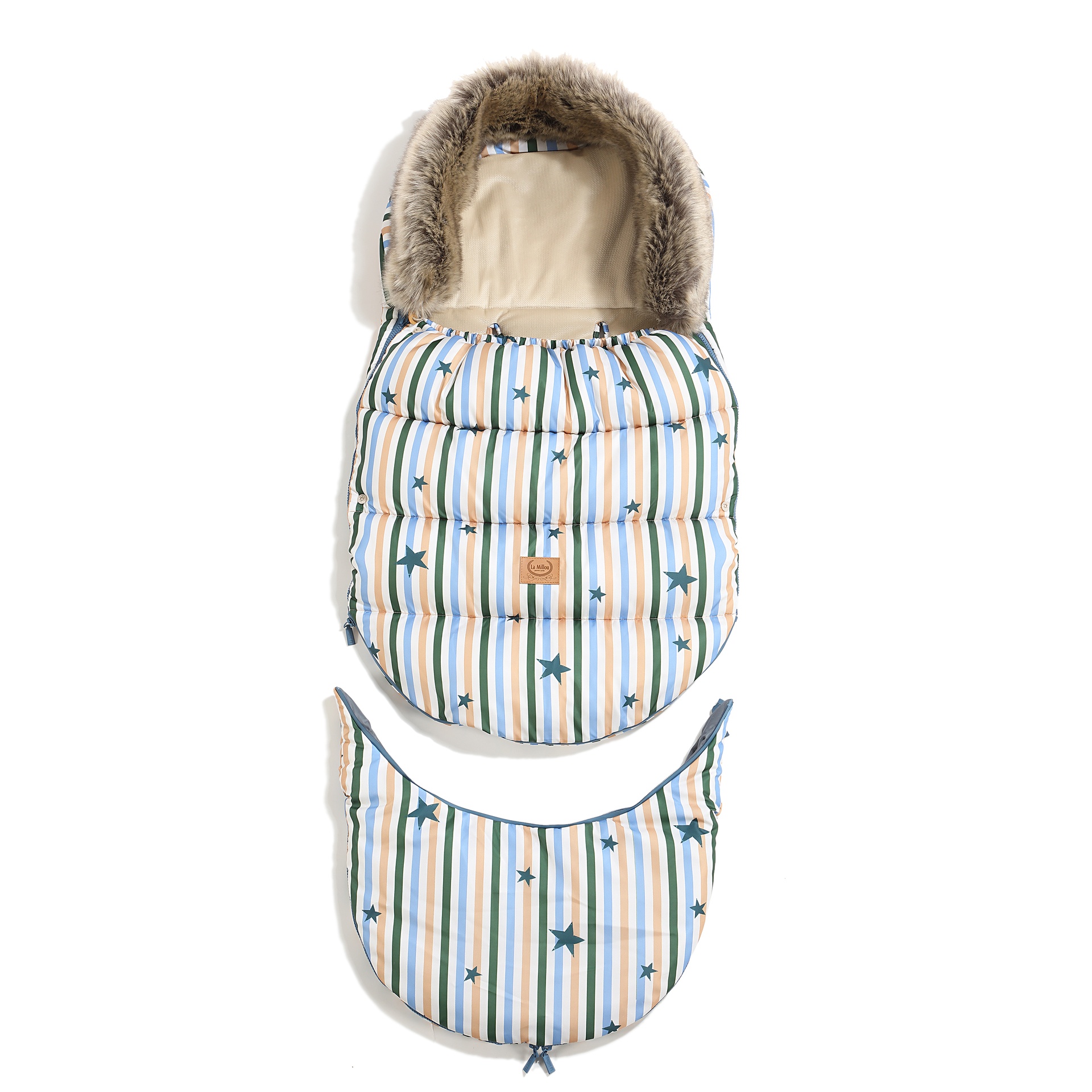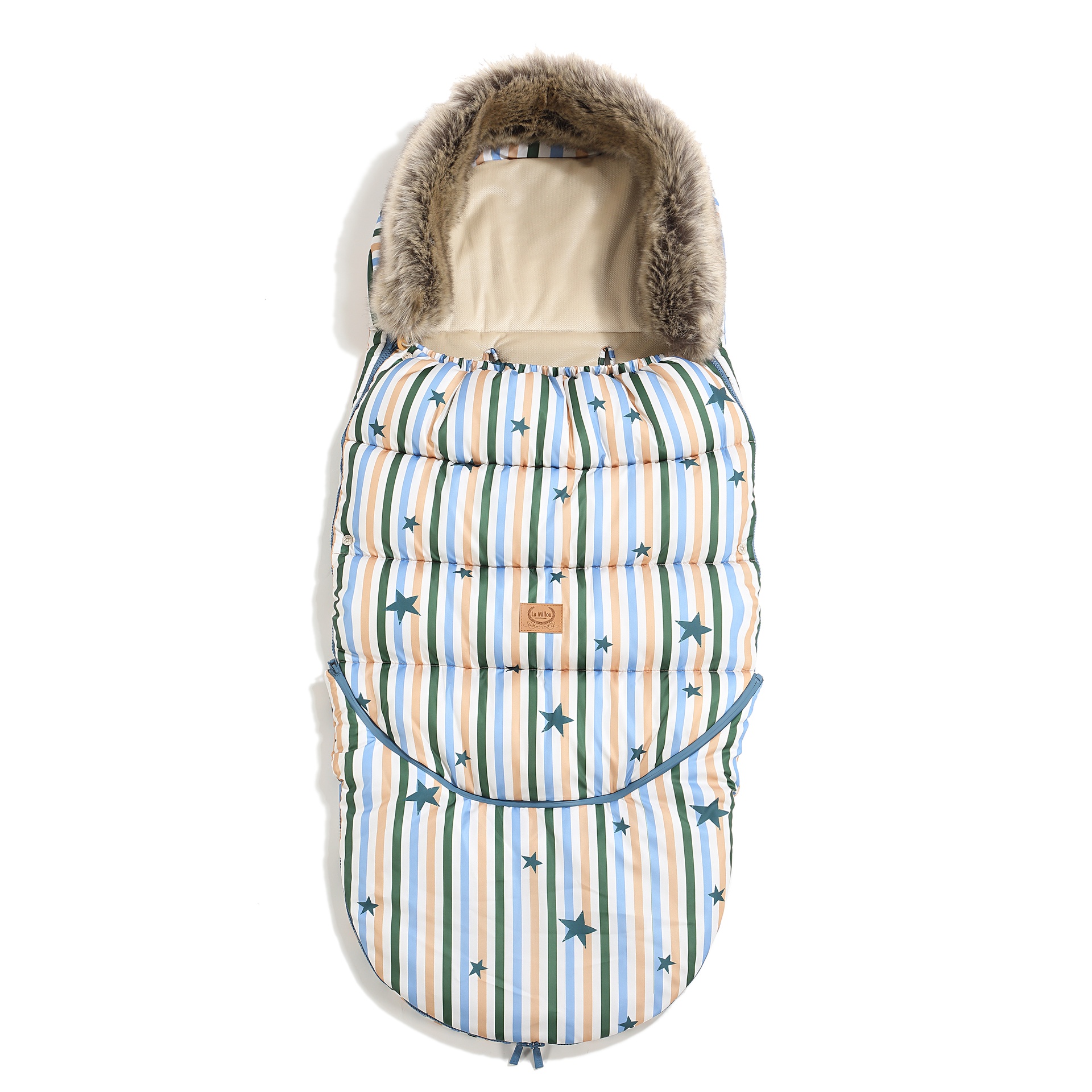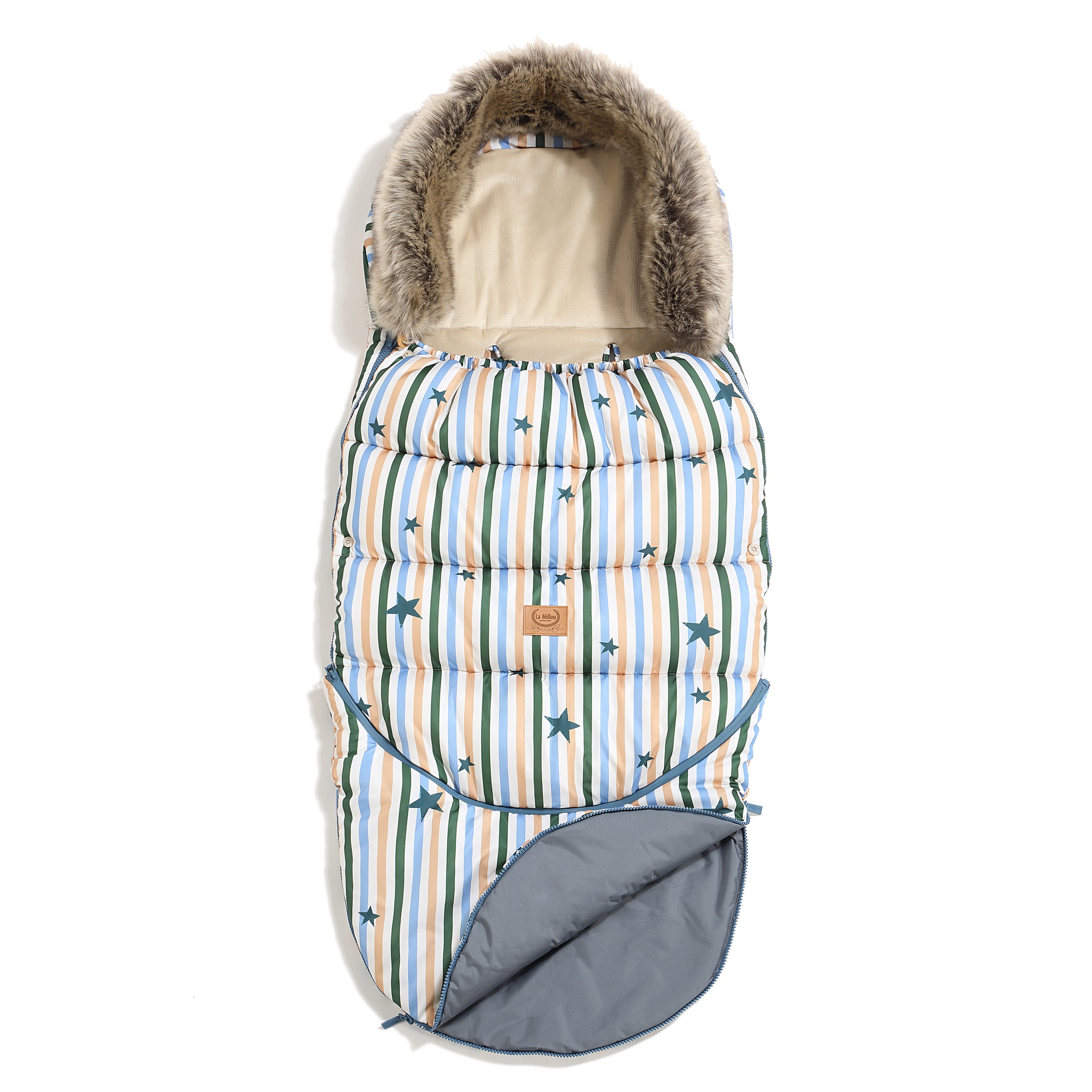 Miegmaišis pritaikytas daugumai vežimėlių su 5 taškų saugos sistema, o viršuje įsiūtas audinys neleidžia miegmaišiui slysti naudojimo metu. Reguliuojama gobtuvo dalis suteikia papildomą šilumą galvai ir baigta nuimamu kailiu.