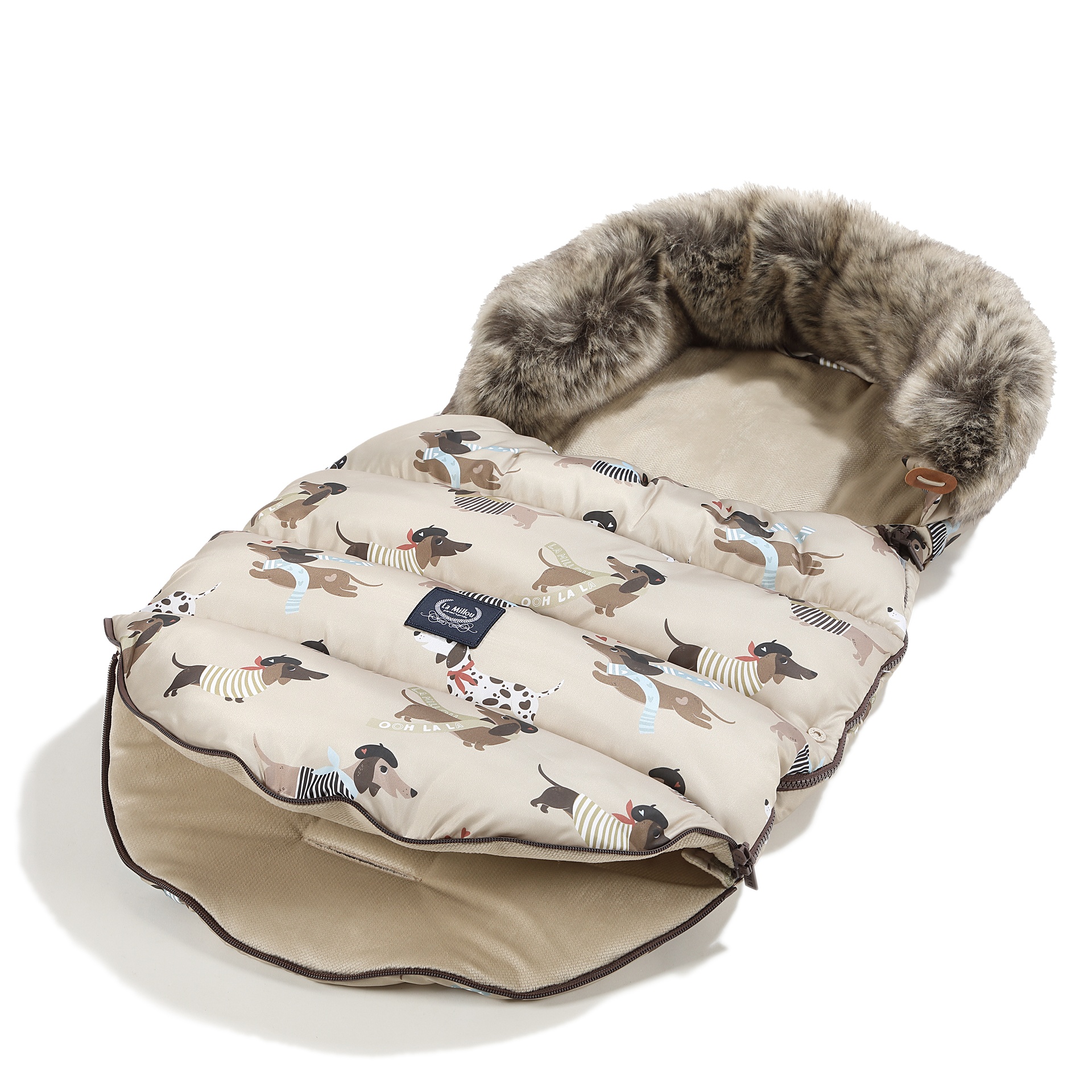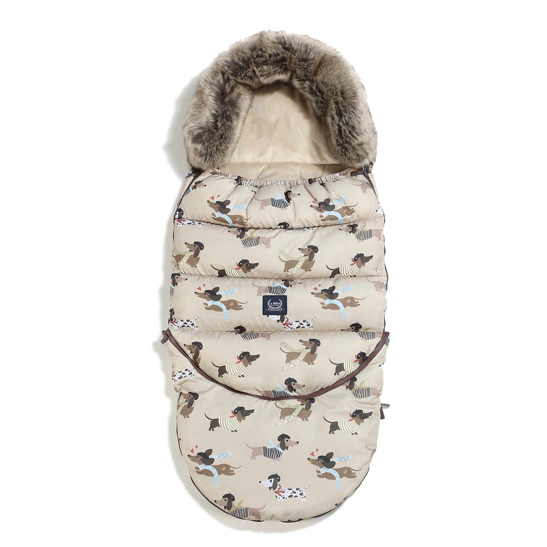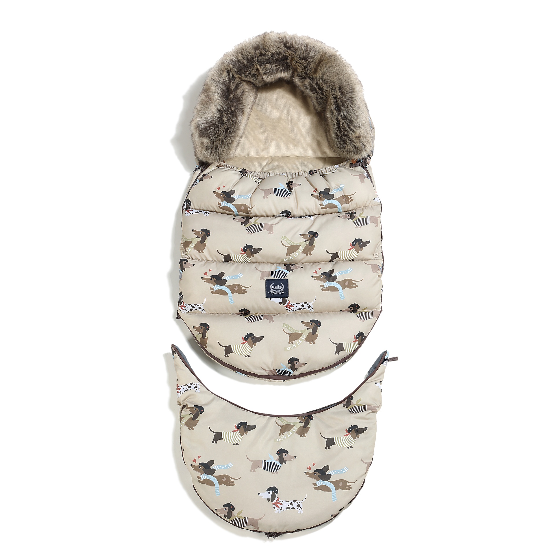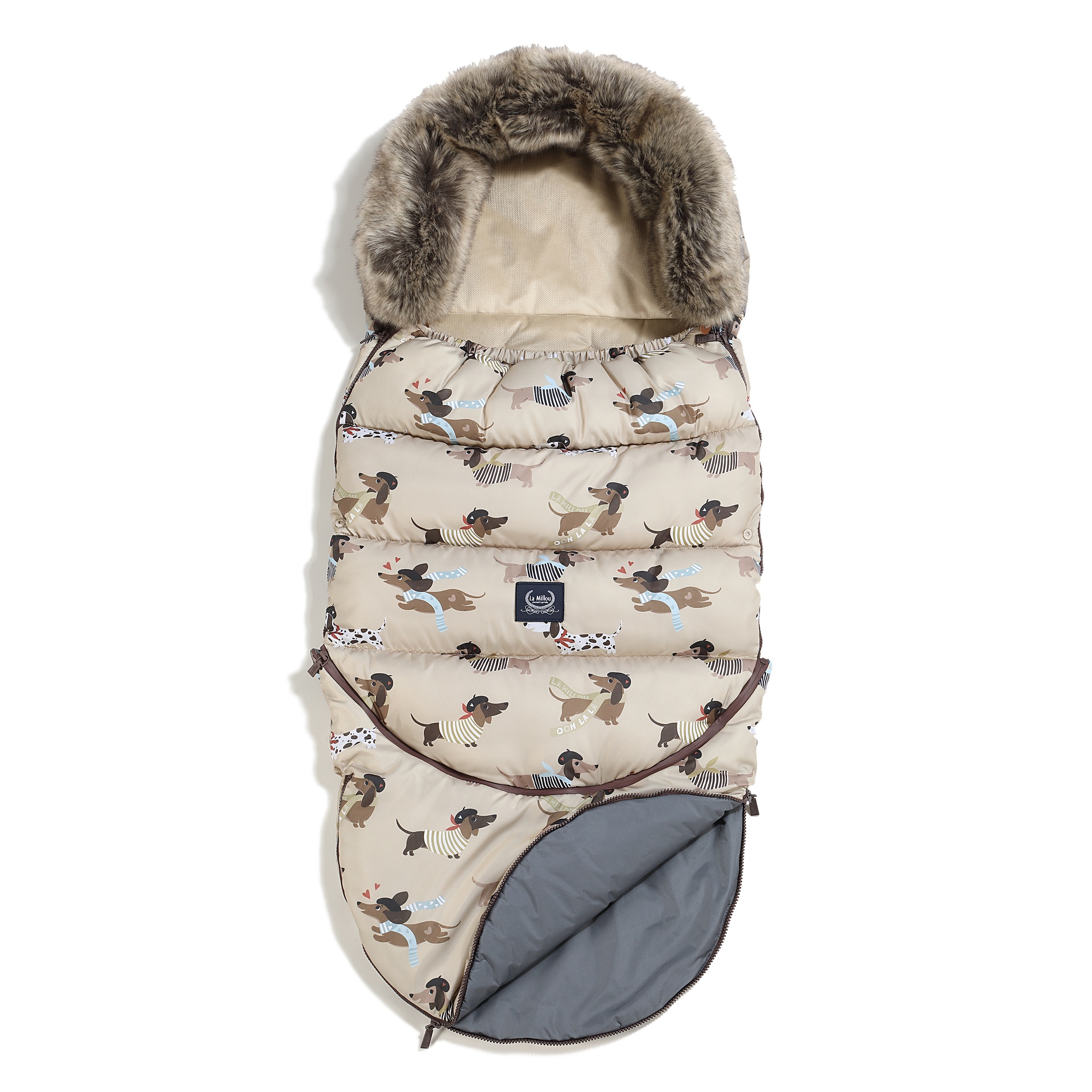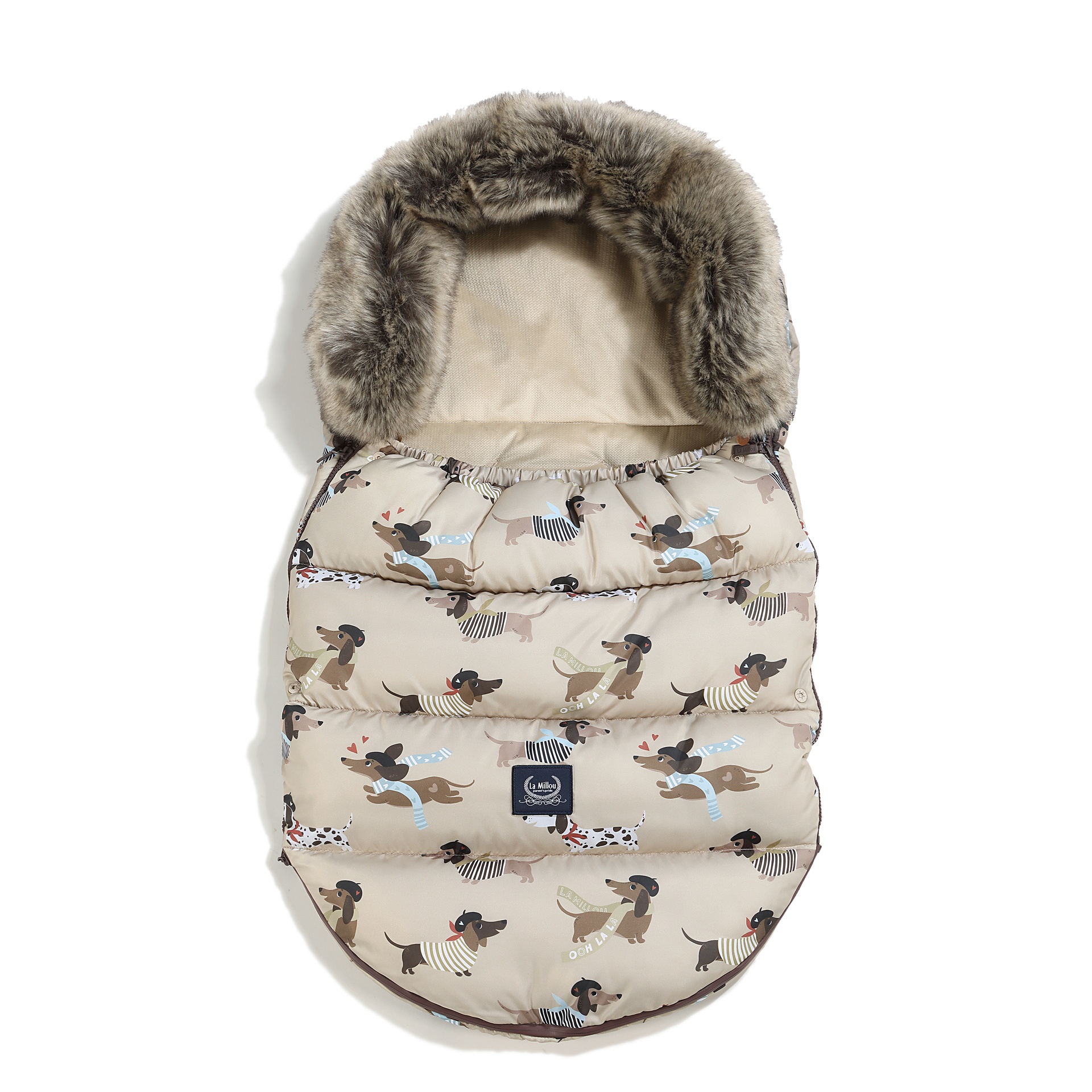Miegmaišis pritaikytas daugumai vežimėlių su 5 taškų saugos sistema, o viršuje įsiūtas audinys neleidžia miegmaišiui slysti naudojimo metu. Reguliuojama gobtuvo dalis suteikia papildomą šilumą galvai ir baigta nuimamu kailiu.