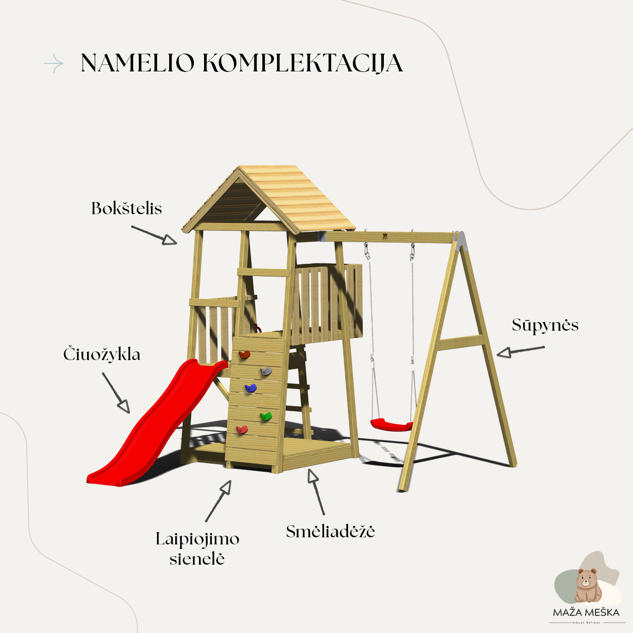 Žaidimų aikštelė skatina kūrybiškumą, fizinį aktyvumą ir laiką gryname ore. Vaikai gali nevaržomai žaisti, o tėvai būti ramūs dėl saugumo. Bokštas sustiprintas masyviomis 44 x 69 mm sijomis, o tvirtinimui pridedami 4 metaliniai inkarai.