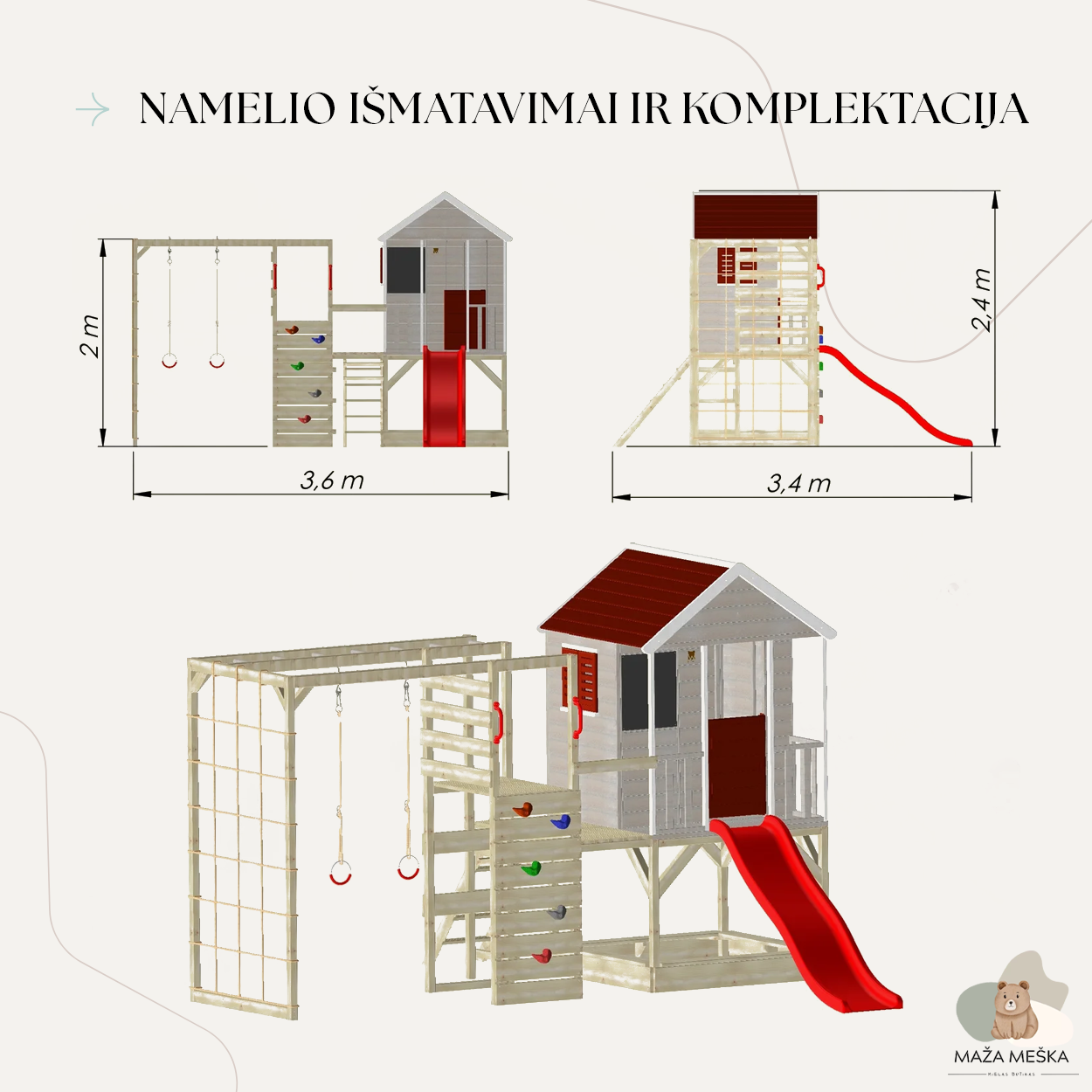Prie komplekto prijungtas sportinis priedas, skatinantis aktyvų judėjimą. Vaikai galės laipioti siena, virvių tinklu, kabėti ant žiedų ir kopti kopėtėlėmis. Yra dvi platformos: viena 90 cm, kita – 120 cm aukščio.