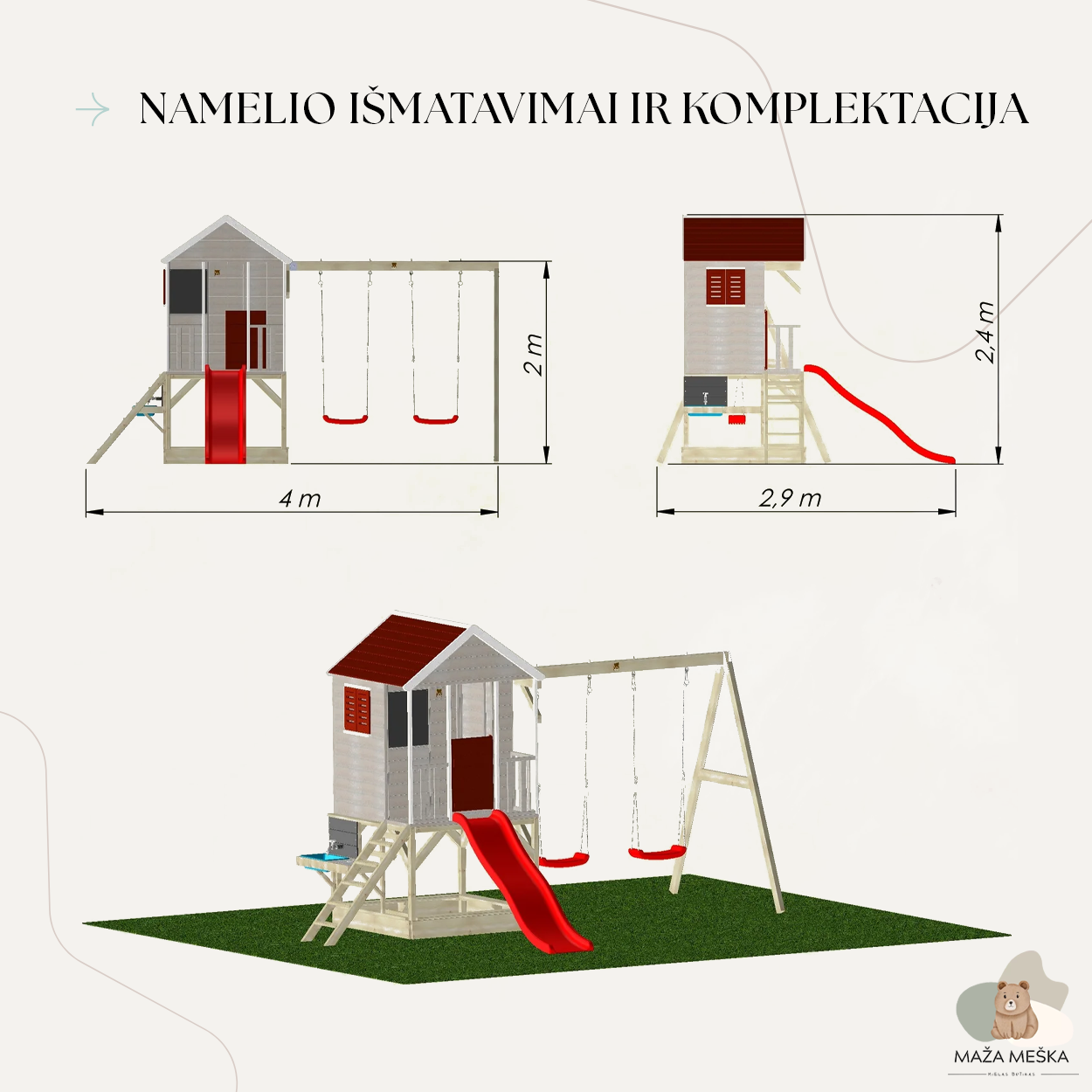 Lauko Žaidimų Namelis Vaikams „Karolis“ – nuotykių ir kūrybos pasaulis jūsų vaikams! Šis modulinis žaidimų namelis suteikia vietą žaidimams ir fantazijoms. Langai su žaliuzėmis, terasa ir lentyna – viskas, ko reikia smagiems žaidimams. 175 cm ilgio plastikinė čiuožykla ir 200 cm aukščio dvivietės sūpynės suteiks dar daugiau adrenalino!