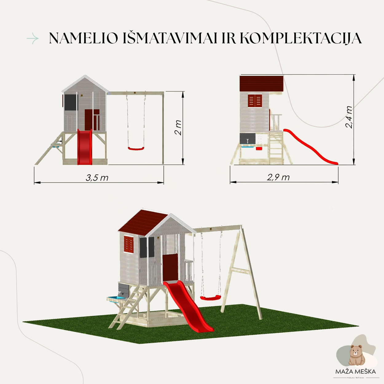 Lauko žaidimų namelis „Mantas“ – tai nuotykių kupina vaikų žaidimų oazė, kurioje mažųjų vaizduotė gali skleistis be jokių ribų! Pastatytas ant 90 cm aukščio platformos, šis modulinis namelis kviečia į kūrybingą žaidimų pasaulį, kuriame kiekviena diena tampa nauju nuotykiu. Čia vaikai gali leistis nuo čiuožyklos, suptis, piešti ant juodos lentos, žaisti smėlyje, o netikėtai užklupus įkvėpimui – pasimėgauti „virtuvės šefo“ vaidmeniu!