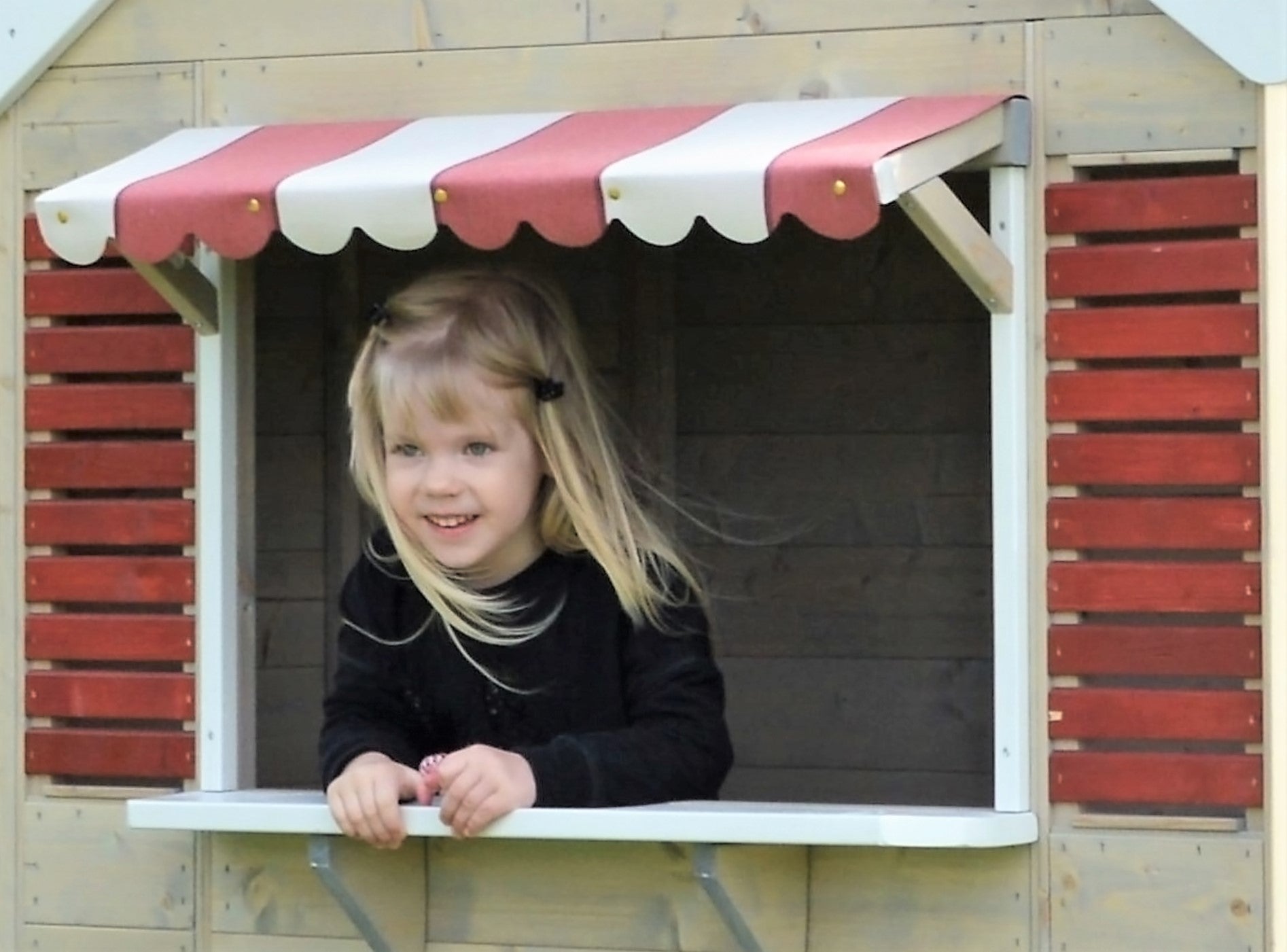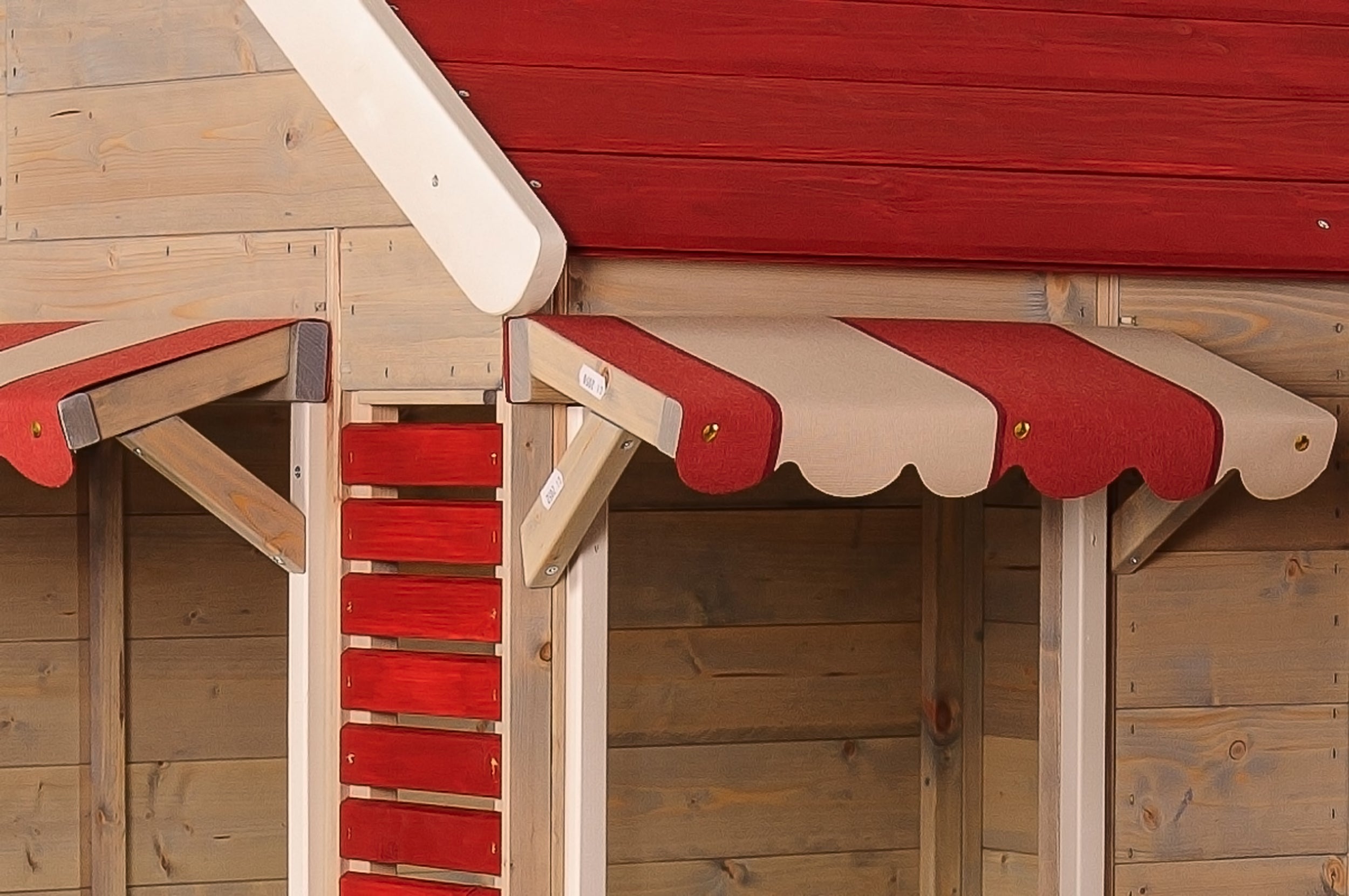 Stogas atsparus drėgmei. Komplekte – durys su langeliu, vitrinos su užuolaidėlėmis, markizės, grindys bei visa reikalinga montavimo informacija. Viduje patogu žaisti ne vienam vaikui.