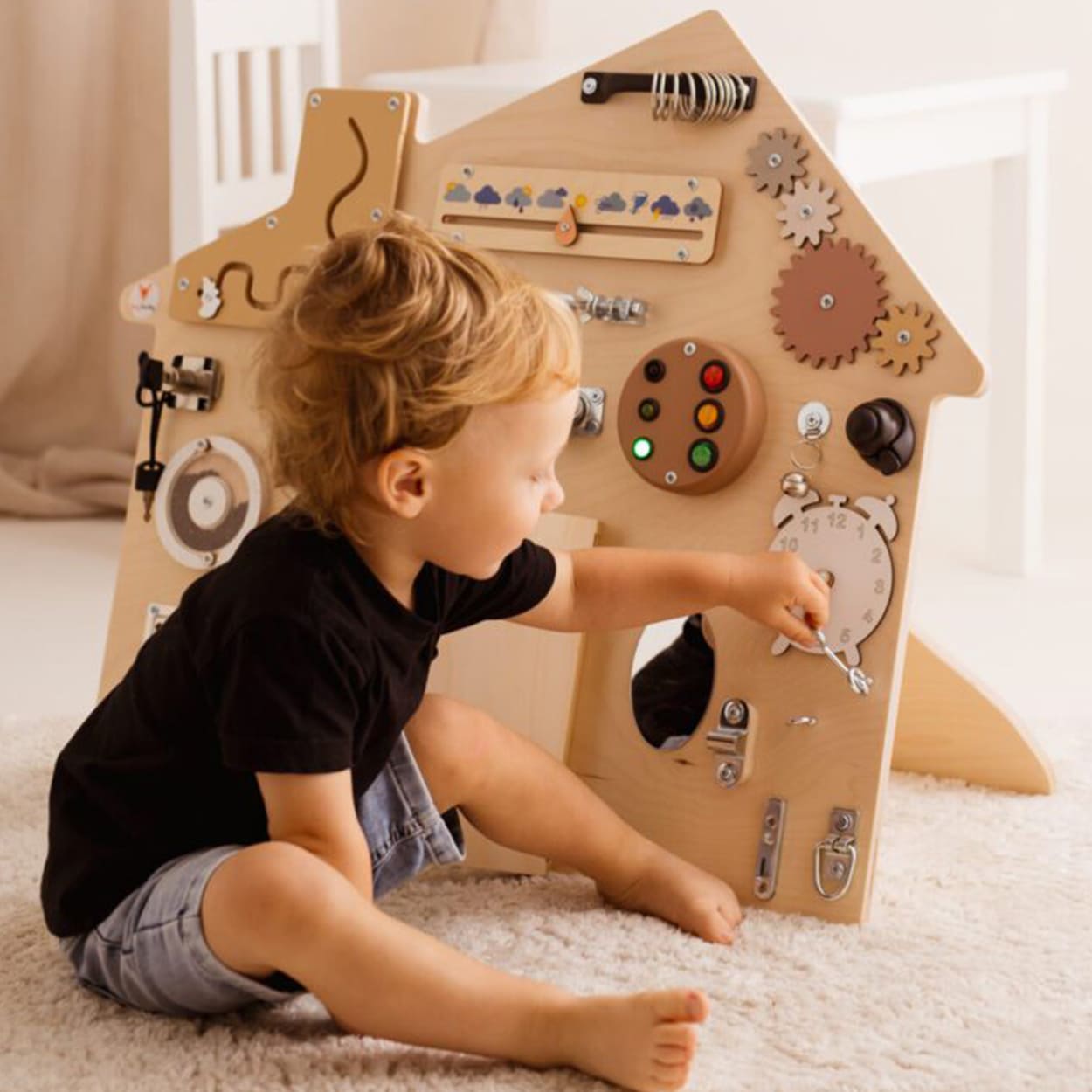 Vaikas gali sukti ratukus, atverti dureles, stebėti laiką ar „pasitikrinti orą“. Kiekviena detalė primena kasdienius veiksmus – nuo apsirengimo iki išėjimo iš namų.