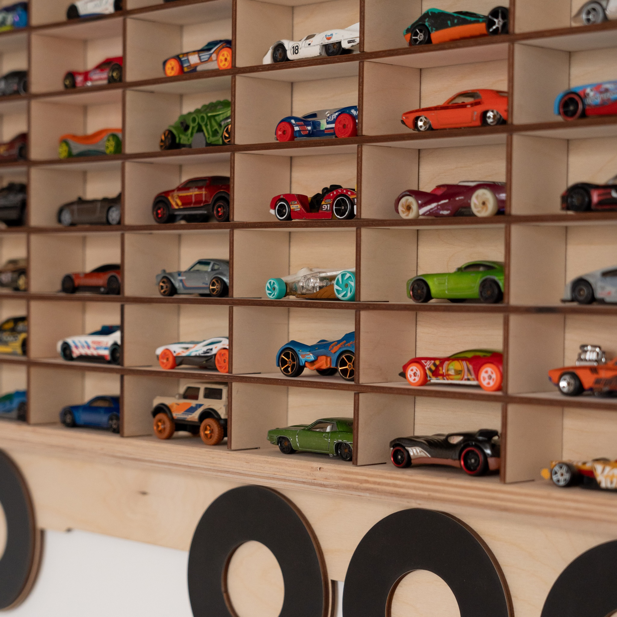 Ši medinė lentynėlė sukurta taip, kad kiekviena mašinėlė turėtų savo vietą. Tvarkingai išdėstytos atskiros ertmės leidžia lengvai rasti norimą automobilį, greitai sudėti kolekciją ir palaikyti tvarką be pastangų. Lentyna talpina net iki 56 mašinėlių, todėl puikiai tiks ir didesniems kolekcionieriams.