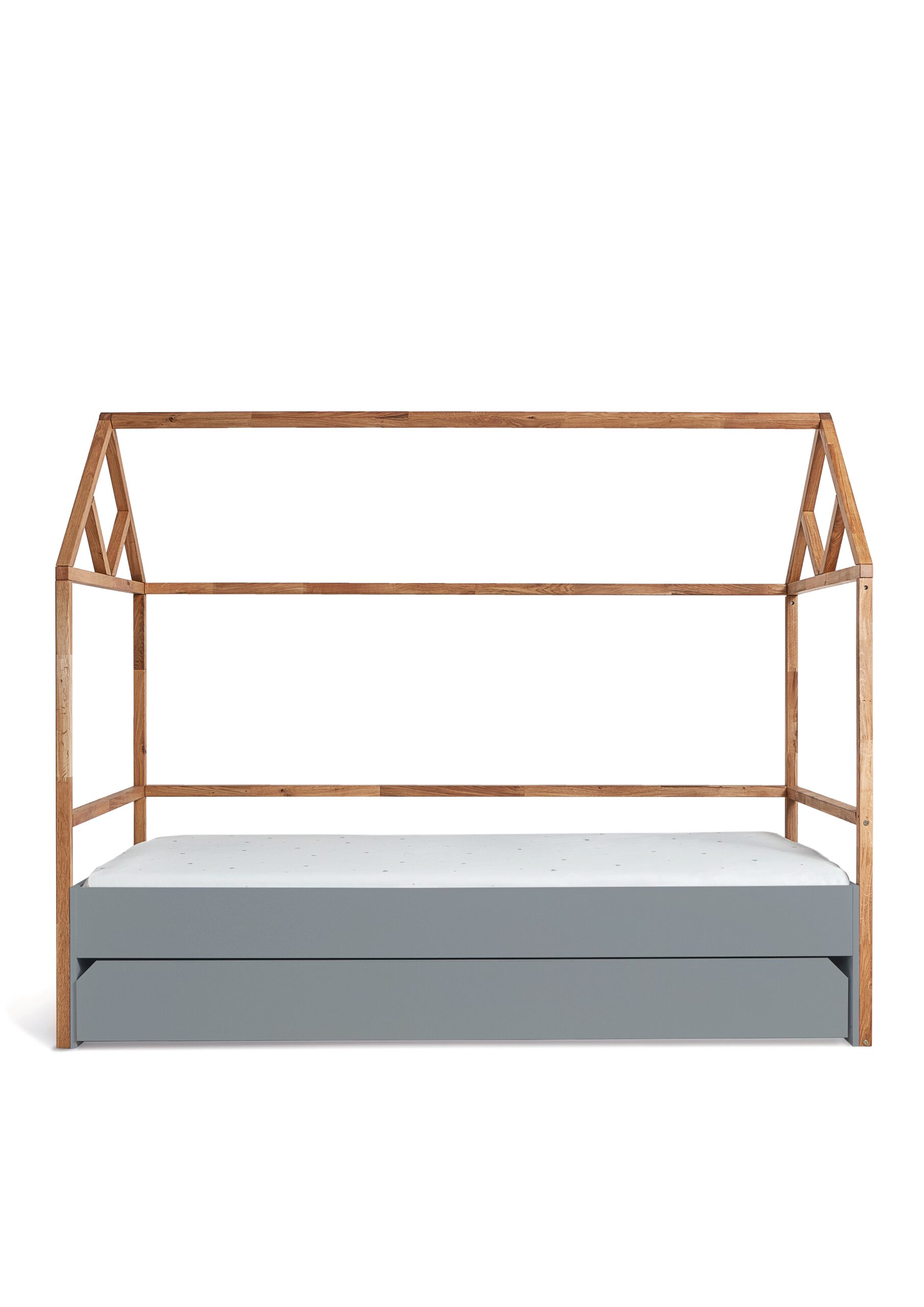 Išskirtinį vizualinį akcentą sukuria natūralaus ąžuolo namelio formos rėmas. Jis ne tik estetiškas, bet ir funkcionalus – galite pakabinti lempučių girliandas, užuolaidėles ar kišeninius organizatorius. Trijų horizontalių skersinių dėka vaikas gali atsiremti pagalvėlėmis ir susikurti jaukų kampelį skaitymui ar poilsiui. 📚🌟