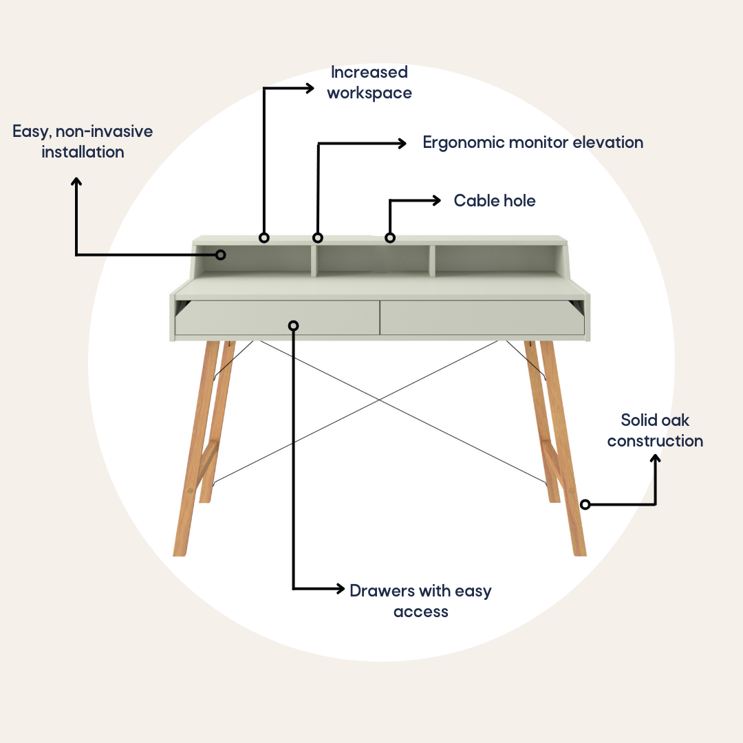 Daugiau vietos ir tvarkos – ant pakeltos lentynos patogu pasidėti sąsiuvinius, užrašų knygutes, rašiklius, planšetes ar net kambarinę gėlę. Viskas po ranka, bet ne ant pagrindinio stalo paviršiaus!
