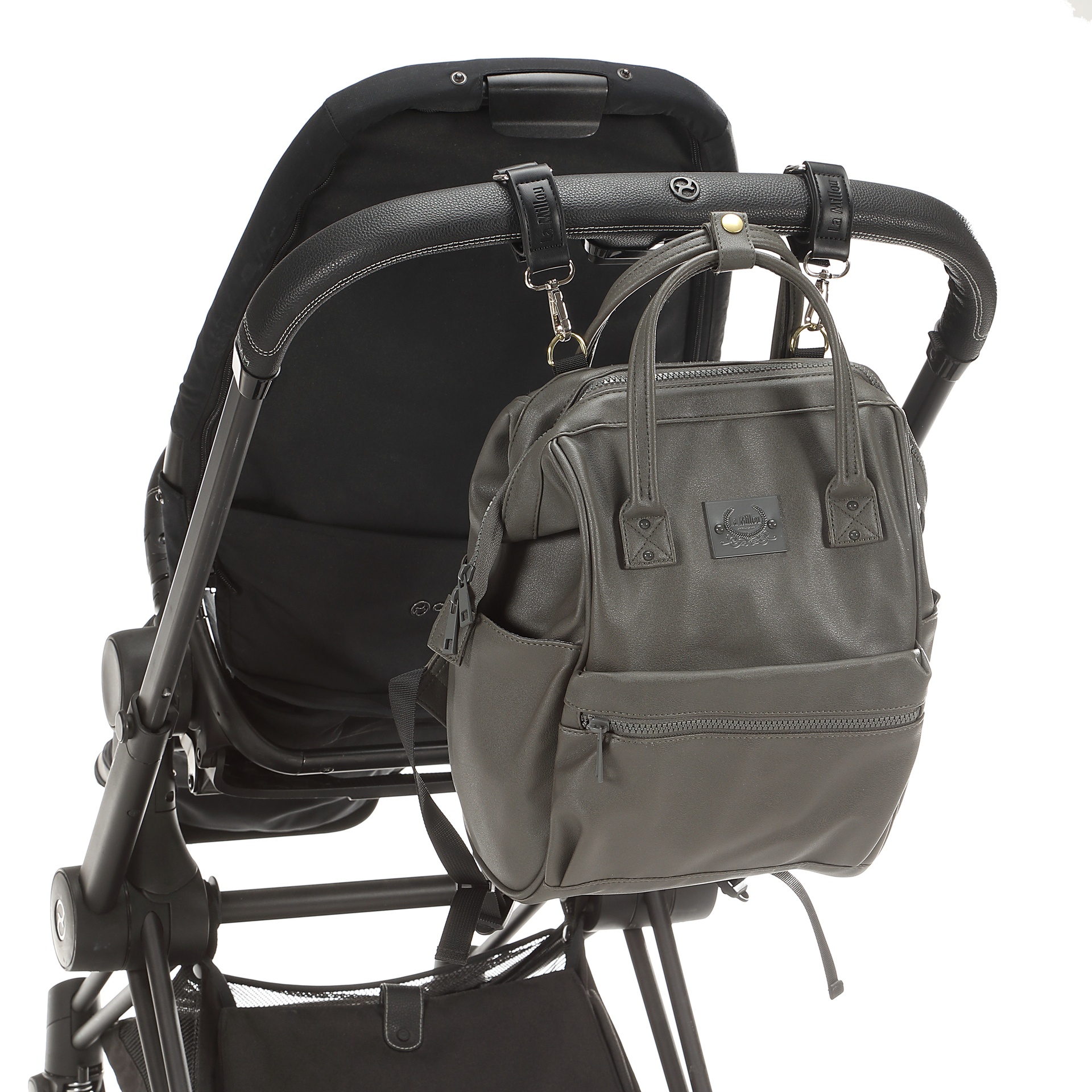 Kuprinė pritaikyta prie vežimėlio – jos rankenos turi specialų spaustuką, leidžiantį patogiai pakabinti kuprinę ant rankenos. Jei norite dar praktiškesnio sprendimo, galima pasirinkti specialius kabliukus.