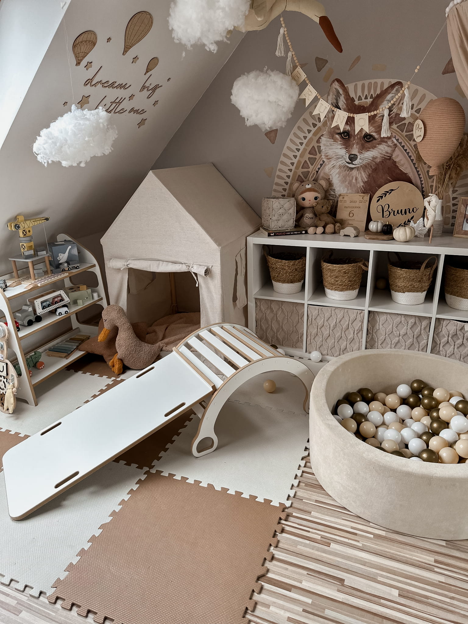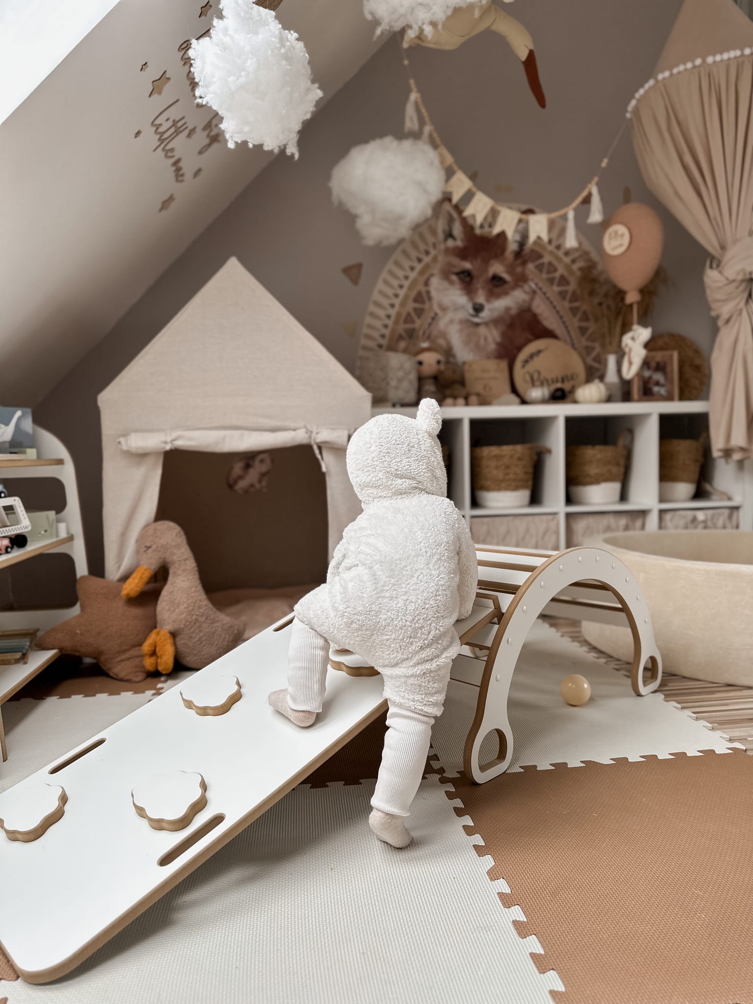 Universalus Montessori baldas – rokeris, čiuožykla ir laipynė.