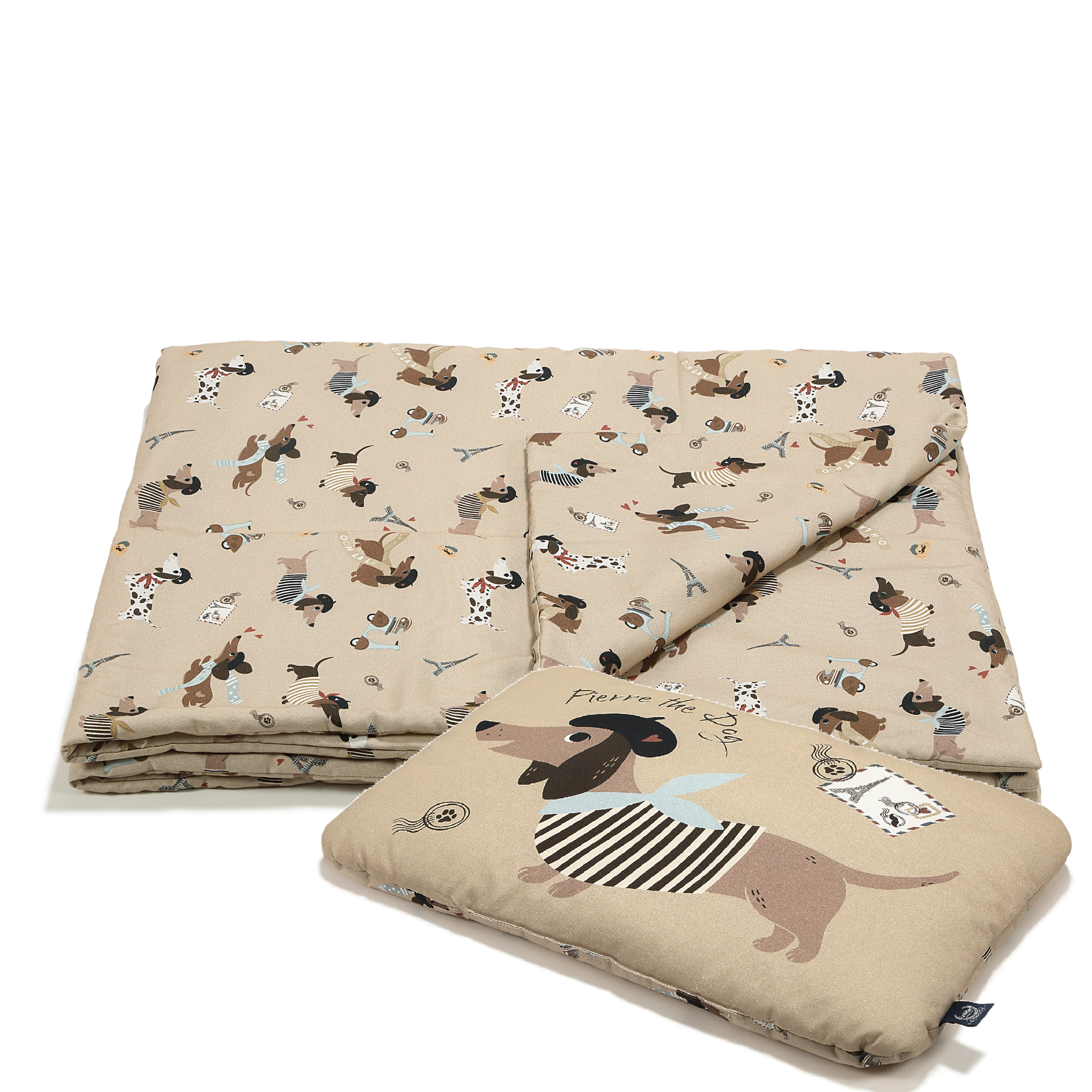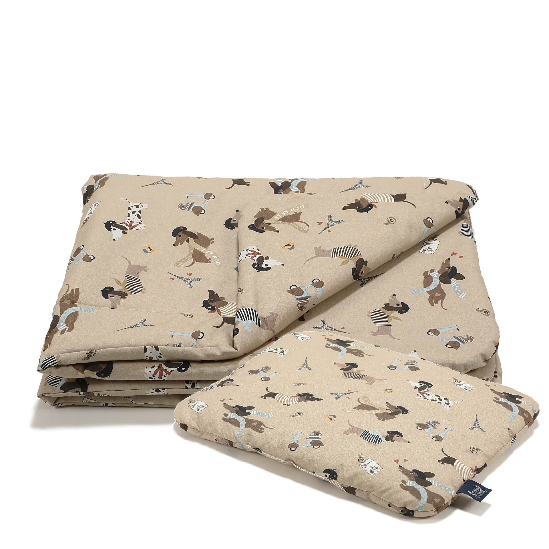 Rinkinys puikiai tinka naudoti namuose, darželyje ar kelionėse. Antklodė yra minkšta, šilta ir lengva, o pagalvė suteikia tinkamą atramą miegant. Patalynės dizainas elegantiškas, minimalistinis, todėl tinka įvairaus interjero kambariams.