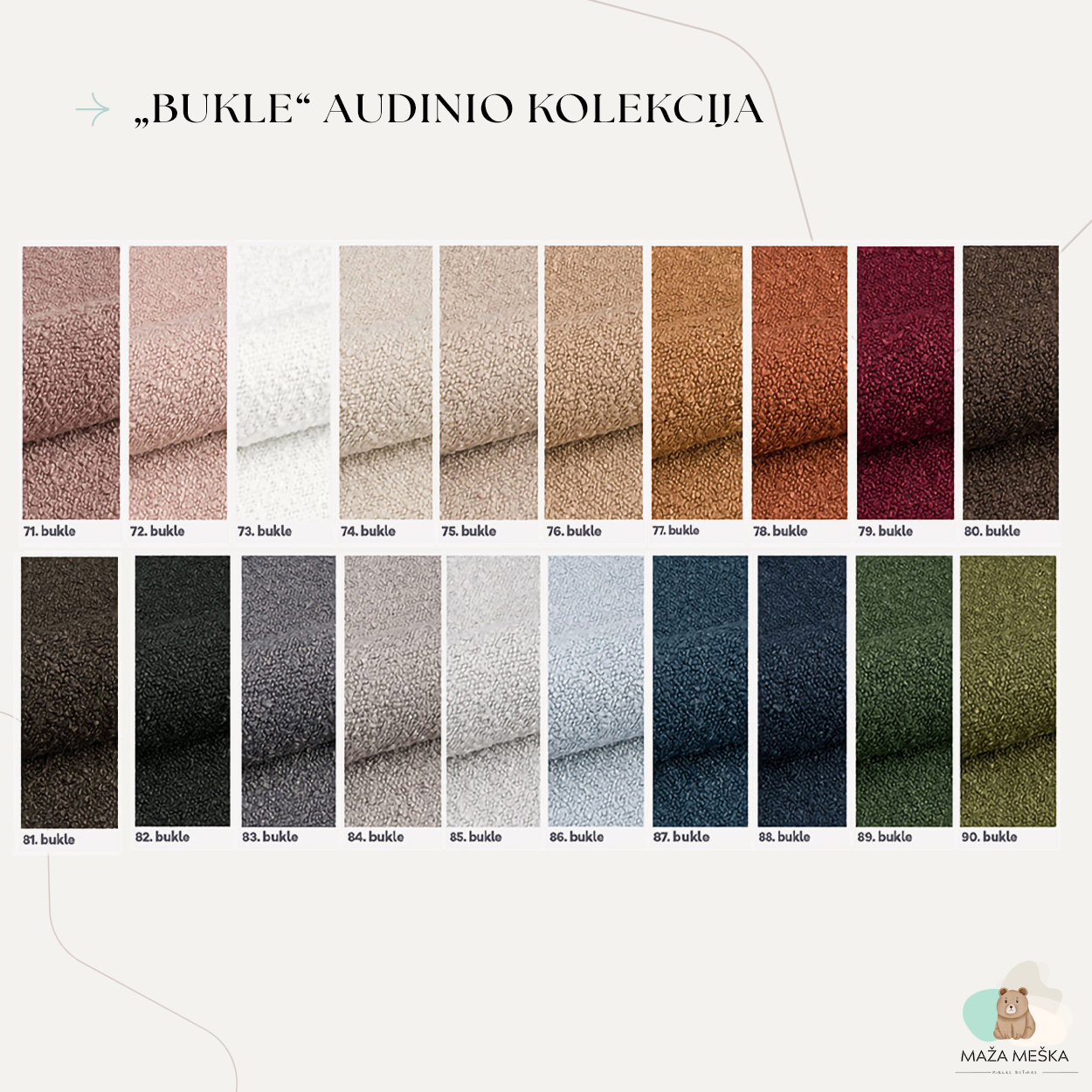 BUKLE KOLEKCIJA (audinys su mezginiu) – struktūrinis, neapdorotas, minkštas, tačiau ne itin švelnus.