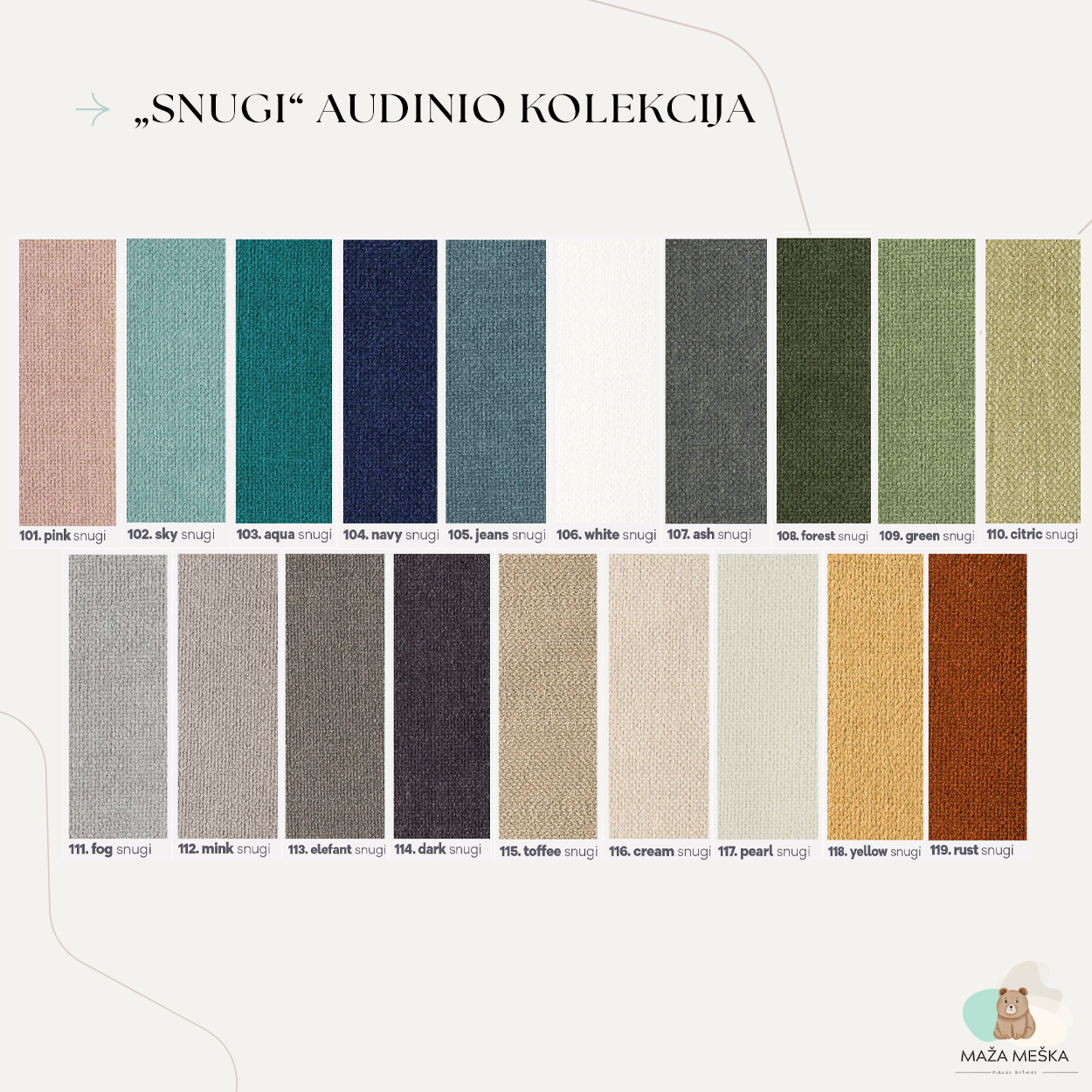 SNUGI KOLEKCIJA (šenilinis audinys) – storas, tankus, tarp aksomo ir struktūrinio audinio.