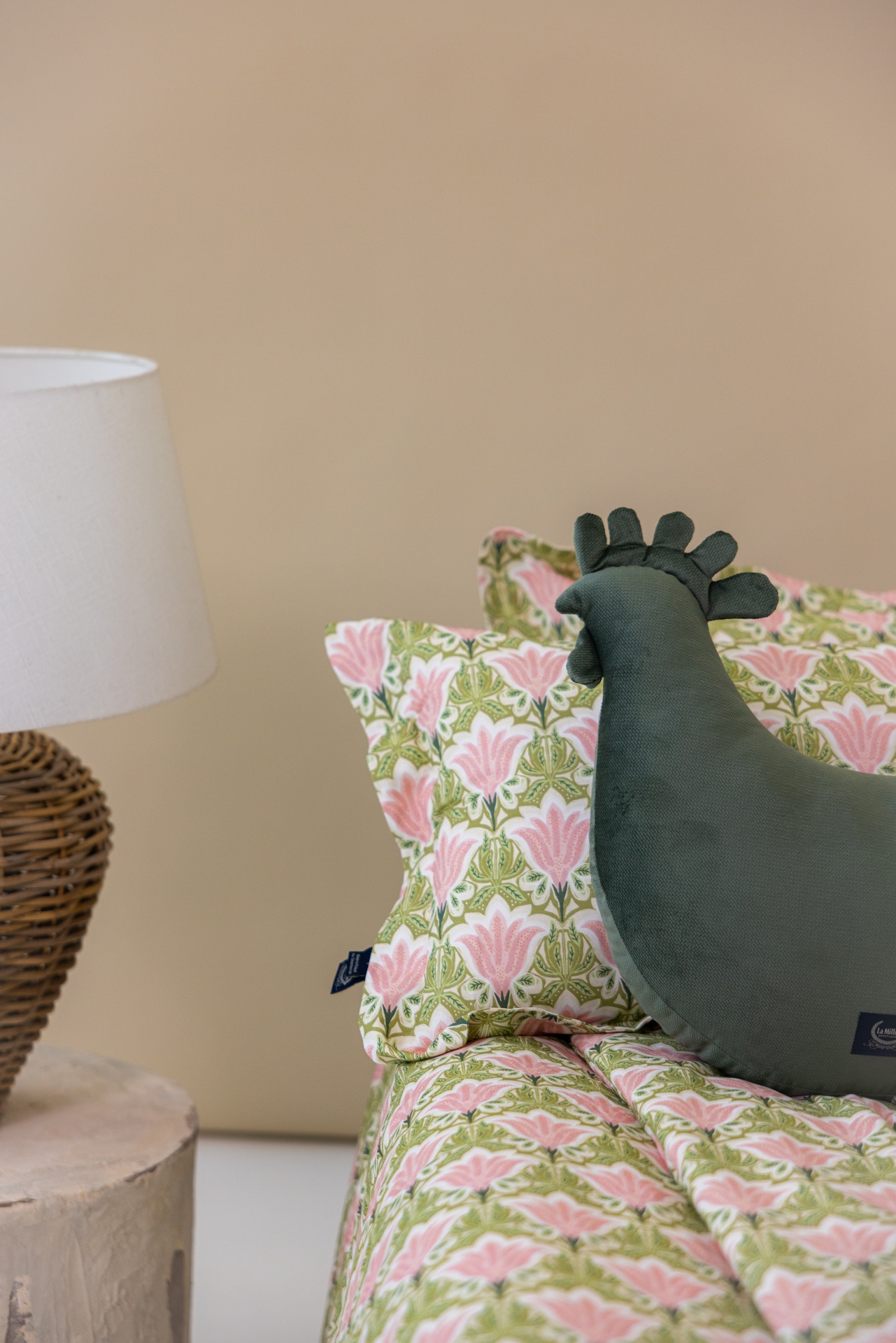 Pagalvėlė pagaminta iš aukštos kokybės, švelnaus aksomo, kuris malonus liesti ir estetiškai atrodo bet kurioje aplinkoje. Viduje naudojamas sertifikuotas, hipoalerginis poliesterio kamuoliukų užpildas, kuris suteikia pagalvėlei išskirtinį elastingumą. Tai leidžia pagalvėlei puikiai prisitaikyti prie kūno formų, suteikiant maksimalų komfortą tiek miego metu, tiek laikant kūdikį ant rankų. Aksominė medžiaga yra lengvai prižiūrima, atspari deformacijai ir išlaiko spalvą net po daugybės skalbimų.