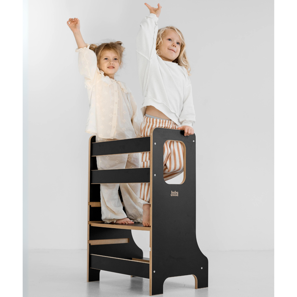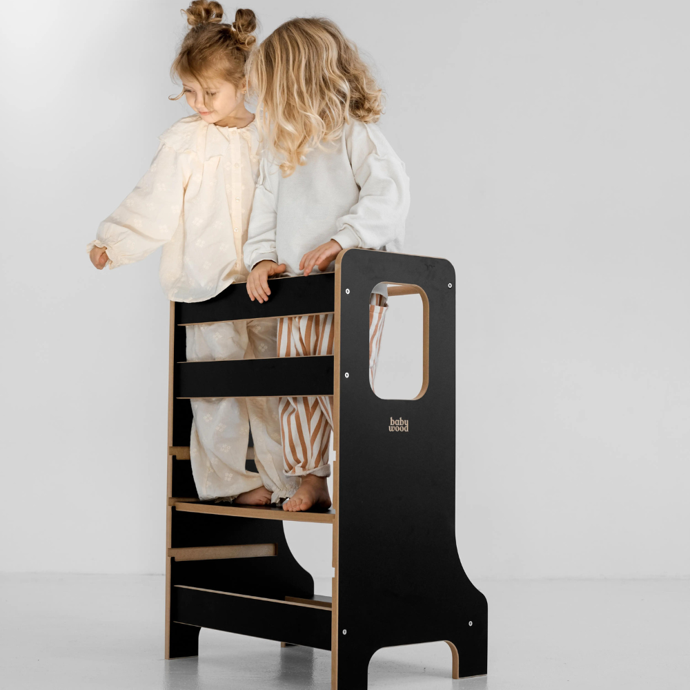 Mažos, vikrios rankutės nori prisidėti prie kasdienių darbų? O jei jų daugiau nei dvi? Montessori dvigubas bokštelis Liepa – juodas – tai puikus sprendimas dviem mažyliams, kurie nori mokytis, tyrinėti ir padėti virtuvėje kartu! Platesnis dizainas leidžia patogiai stovėti dviem vaikams, todėl maisto gaminimas ar kitos kasdienės užduotys taps dar smagesnės ir efektyvesnės.