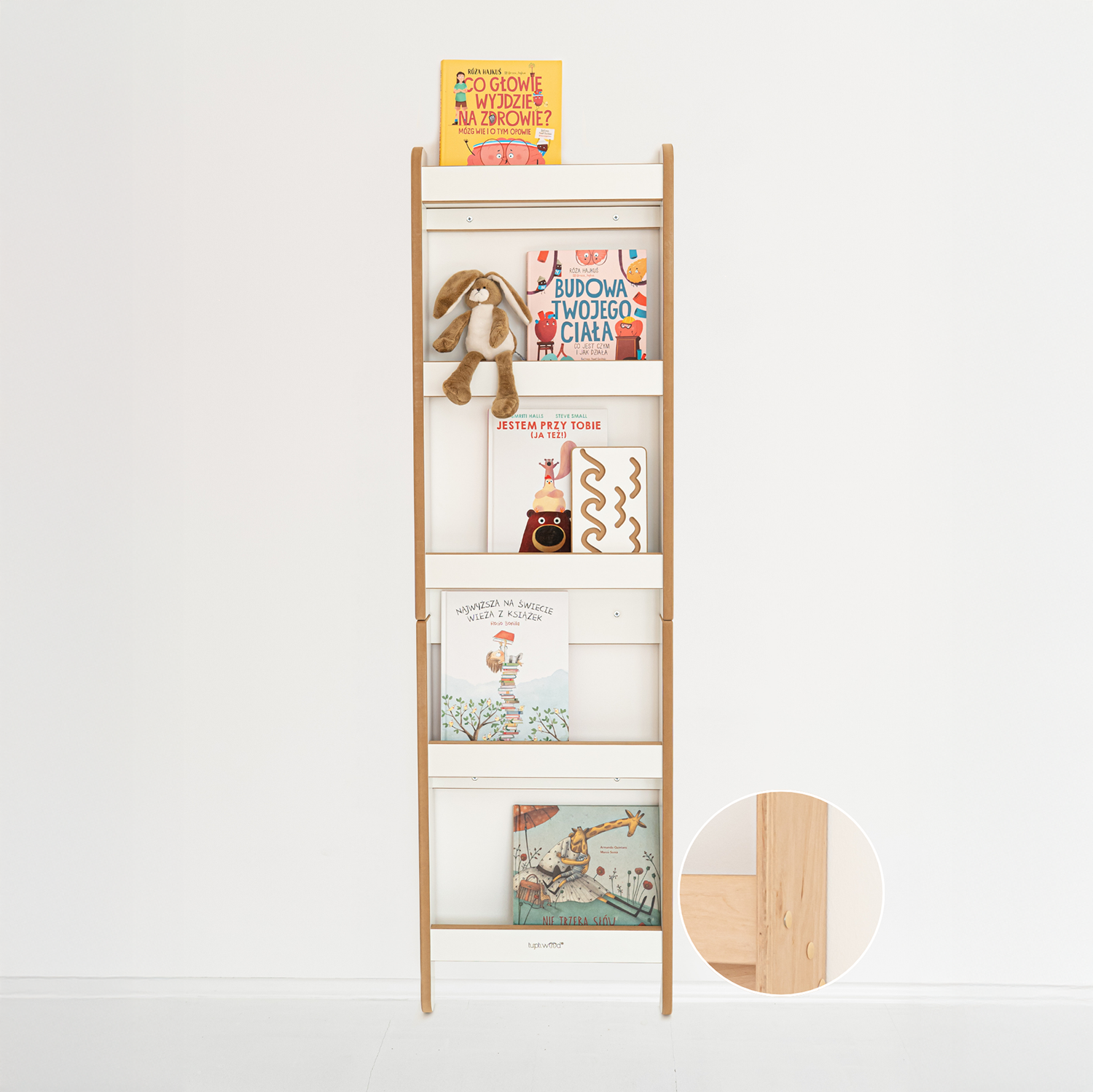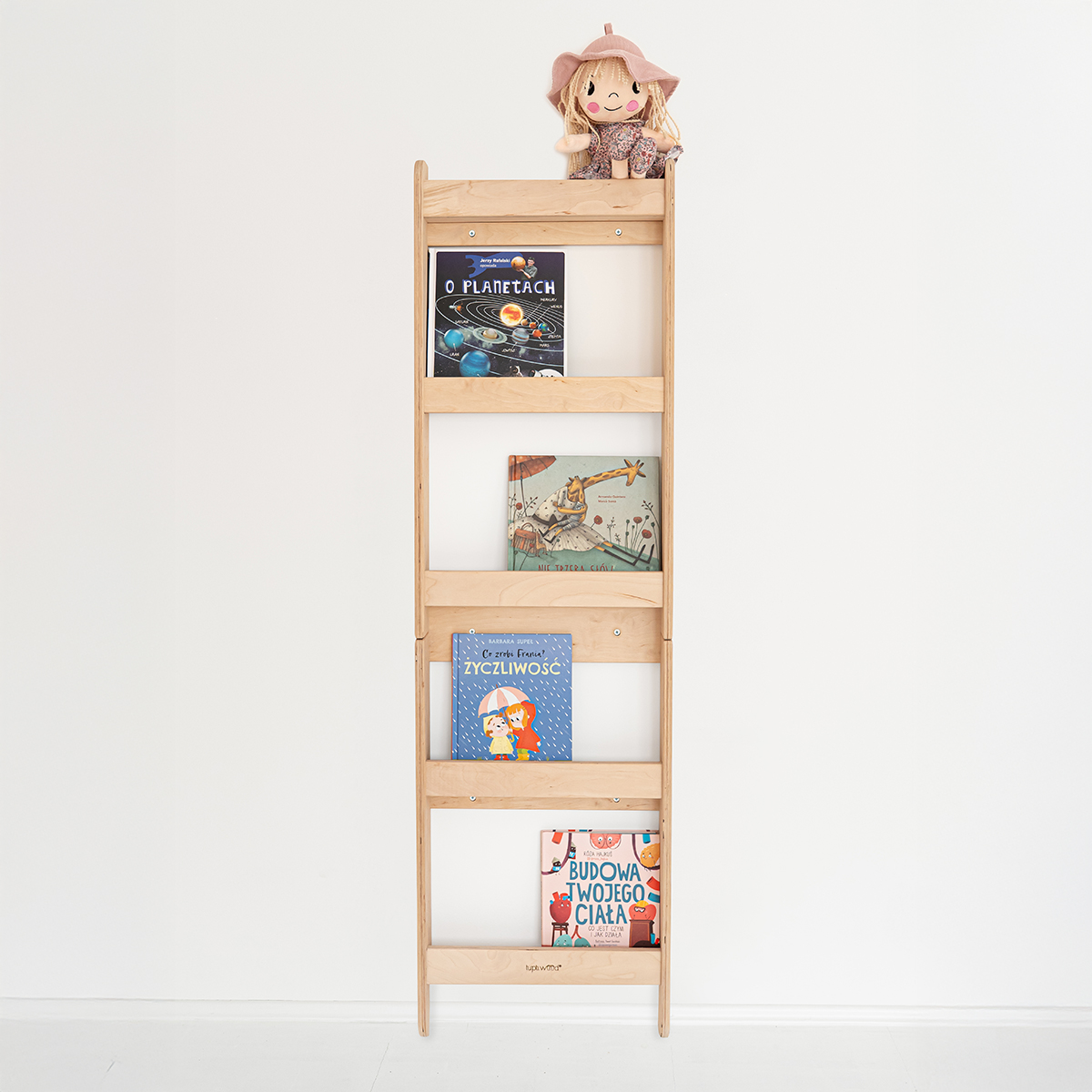 Montessori Sieninė Knygų Lentyna MAXI – tai praktiškas ir estetiškas sprendimas vaikų kambariui, kuriame knygos tampa natūralia kasdienybės dalimi. Tvirtinama prie sienos tinkamame aukštyje, ji leidžia vaikui pačiam pasiekti mėgstamas knygeles, pasirinkti jas pagal nuotaiką ir padėti atgal į vietą. Taip formuojasi savarankiškumas, tvarkos įprotis ir meilė skaitymui.
