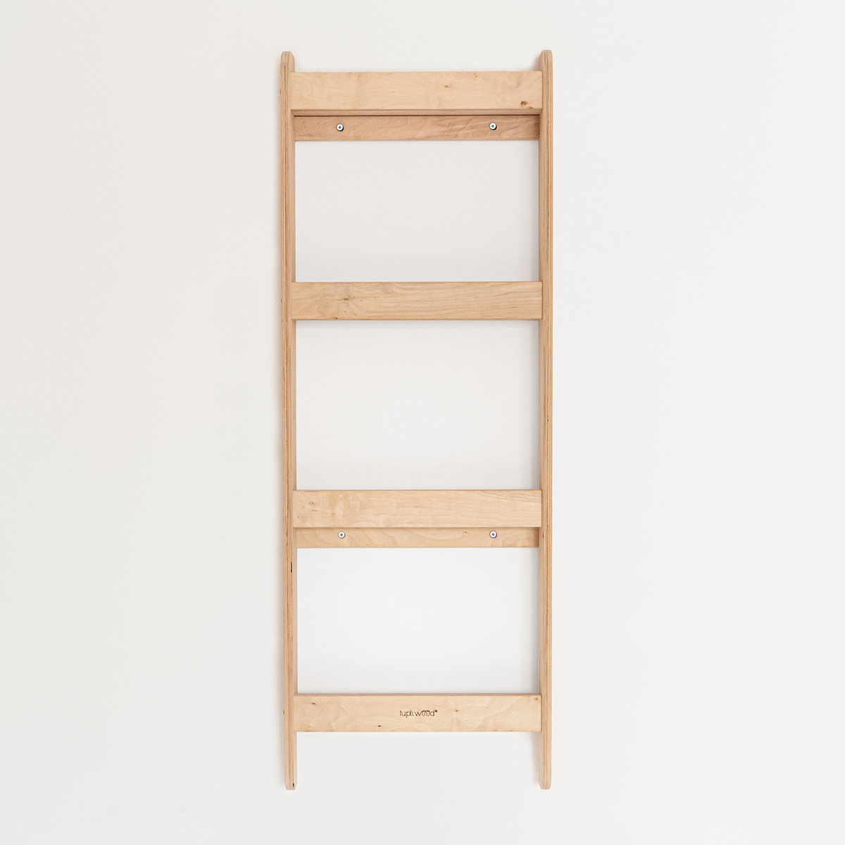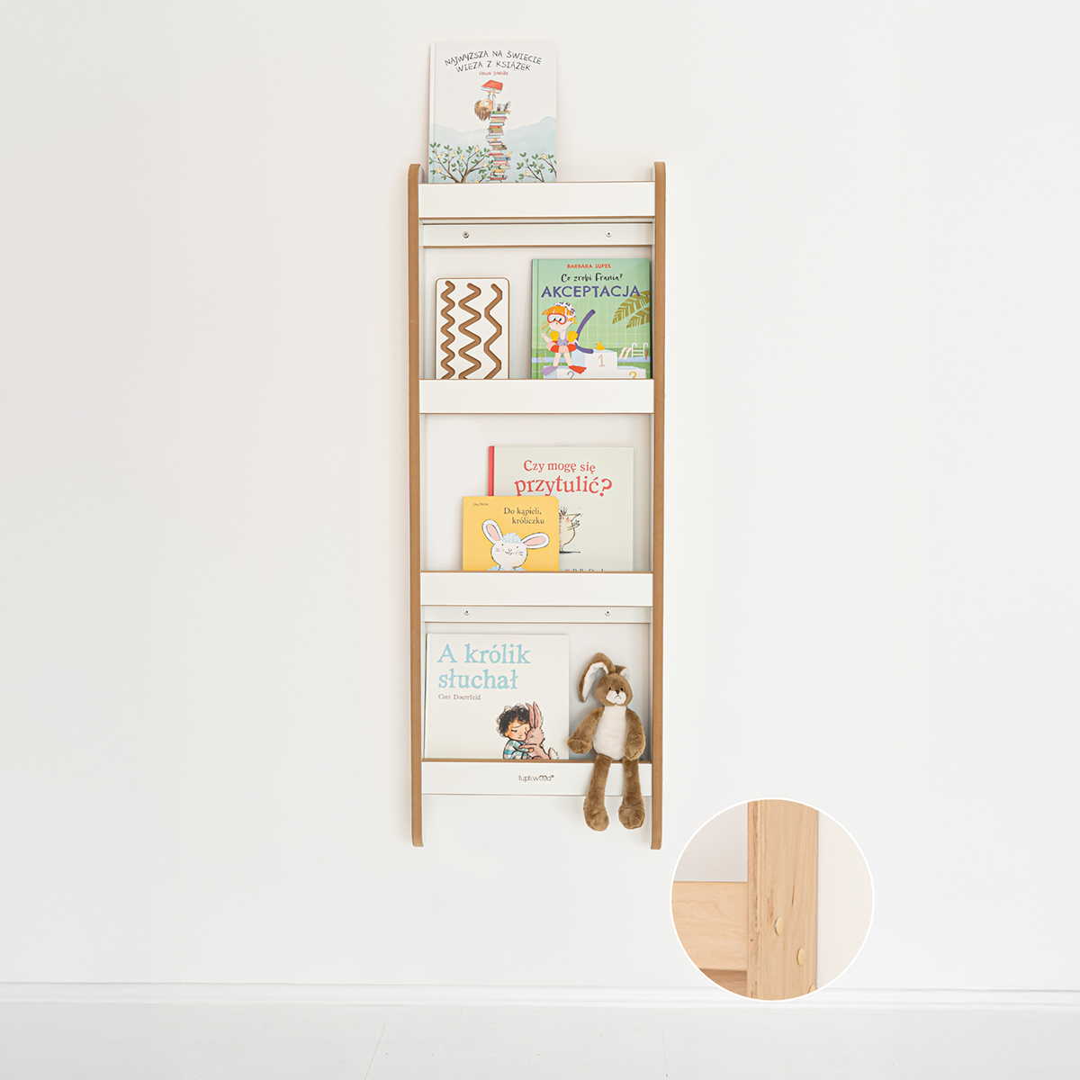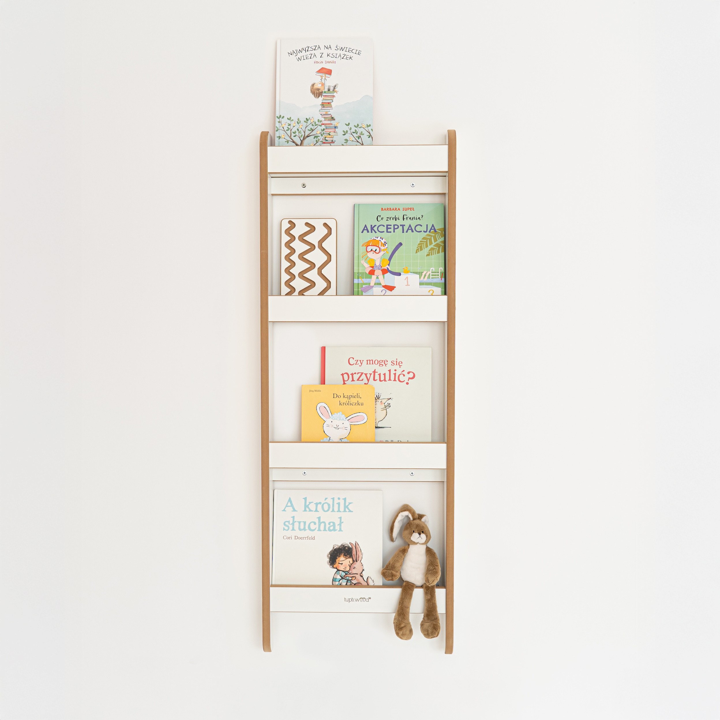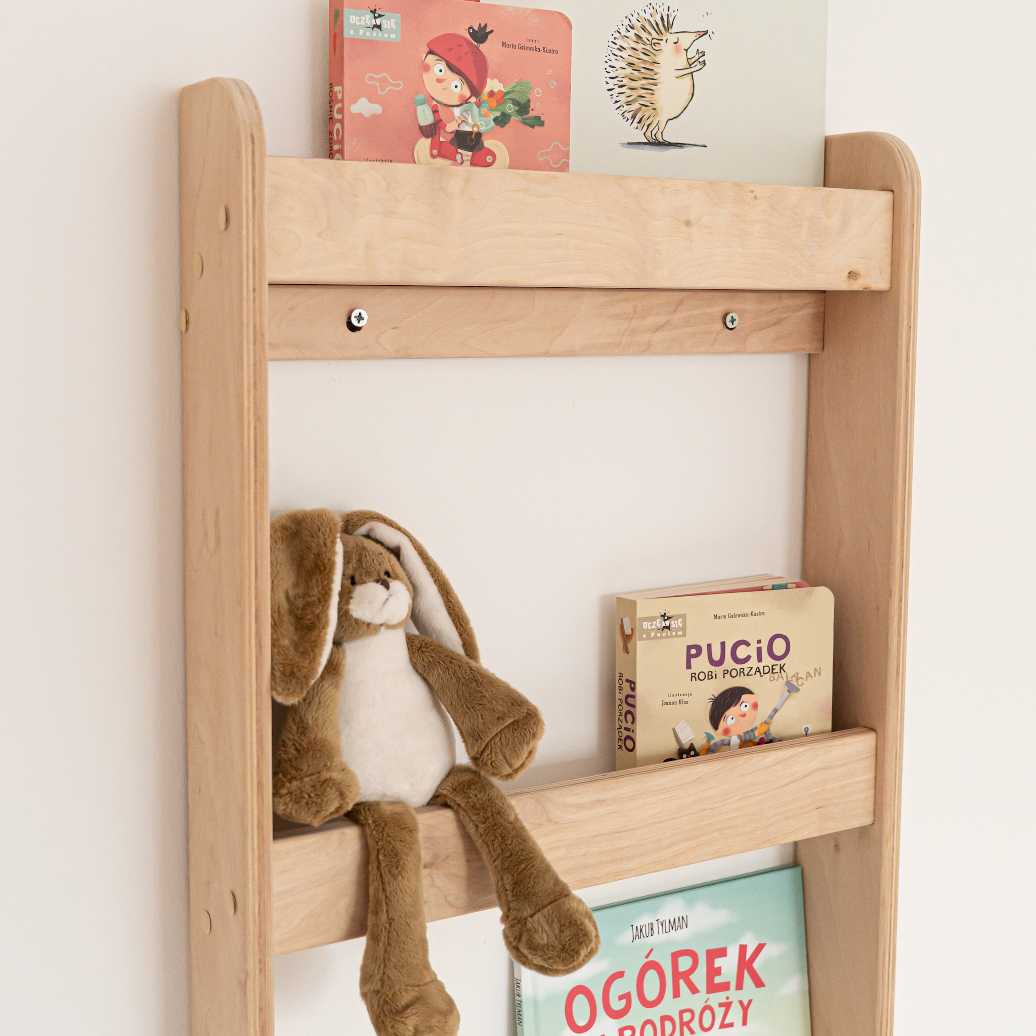 Montessori Sieninė Knygų Lentyna MIDI – tai praktiškas ir estetiškas sprendimas vaikų kambariui, kuriame knygos tampa natūralia kasdienybės dalimi. Tvirtinama prie sienos tinkamame aukštyje, ji leidžia vaikui pačiam pasiekti mėgstamas knygeles, pasirinkti jas pagal nuotaiką ir padėti atgal į vietą. Taip formuojasi savarankiškumas, tvarkos įprotis ir meilė skaitymui.