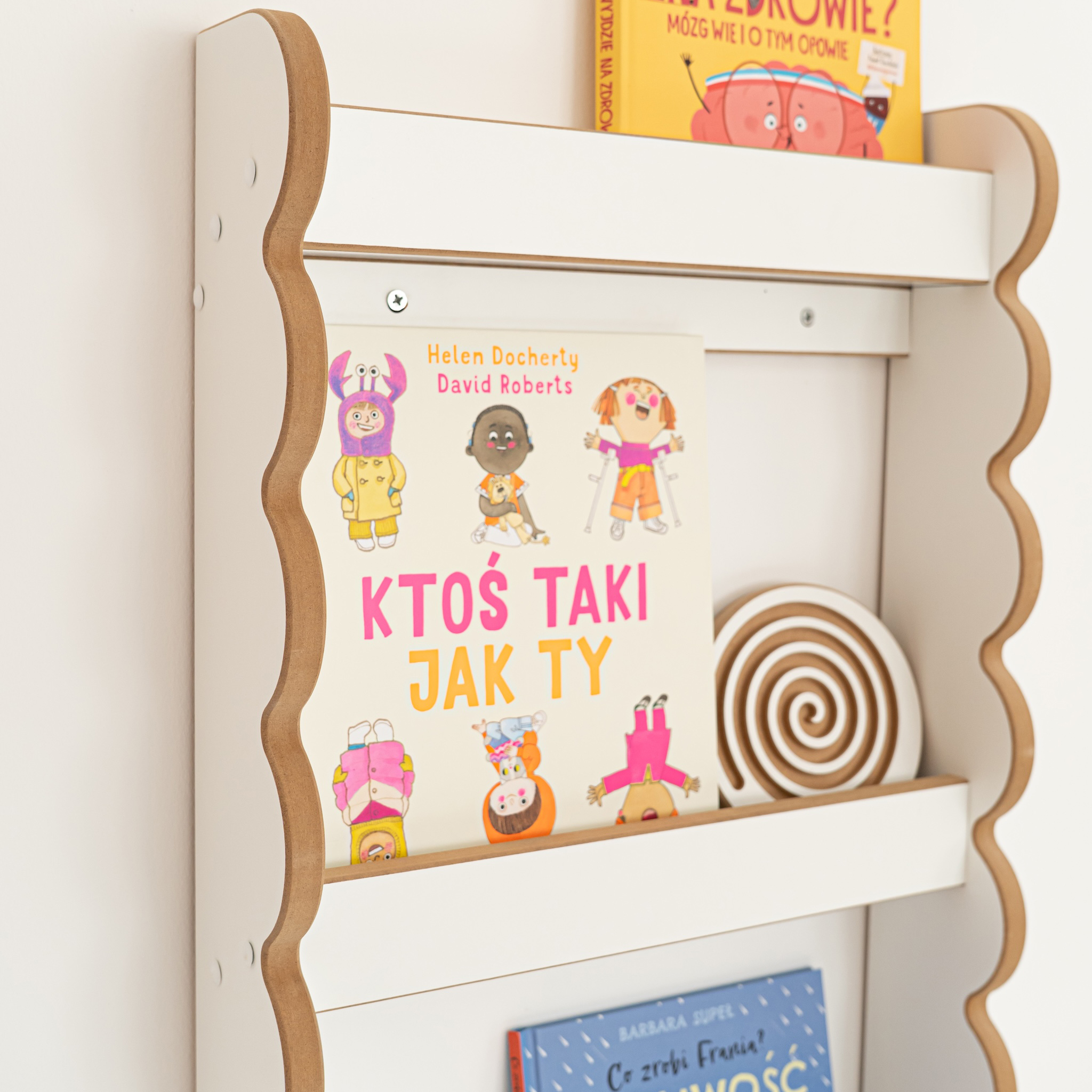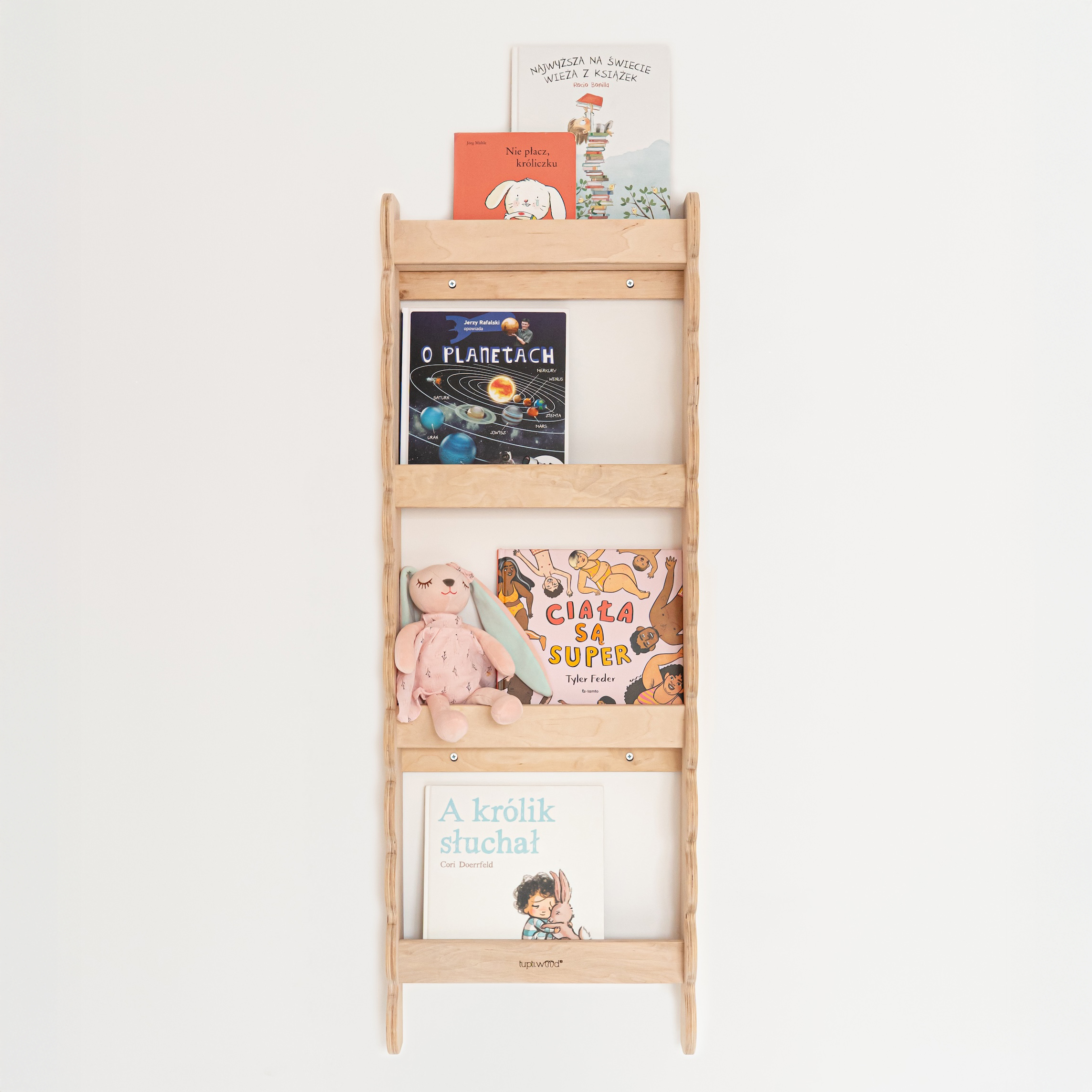 Keturi lentynos lygiai suteikia pakankamai vietos įvairaus dydžio knygoms – nuo plonų knygelių iki storesnių pasakų. Knygas galima laikyti viršeliais į priekį, o tai ypač svarbu mažiems vaikams: matomi viršeliai kelia smalsumą ir natūraliai skatina rinktis skaitymą. Lentyna puikiai tinka ne tik knygoms, bet ir mieloms smulkmenoms – žaislams, dekoracijoms ar mažiems vaikystės lobiams.