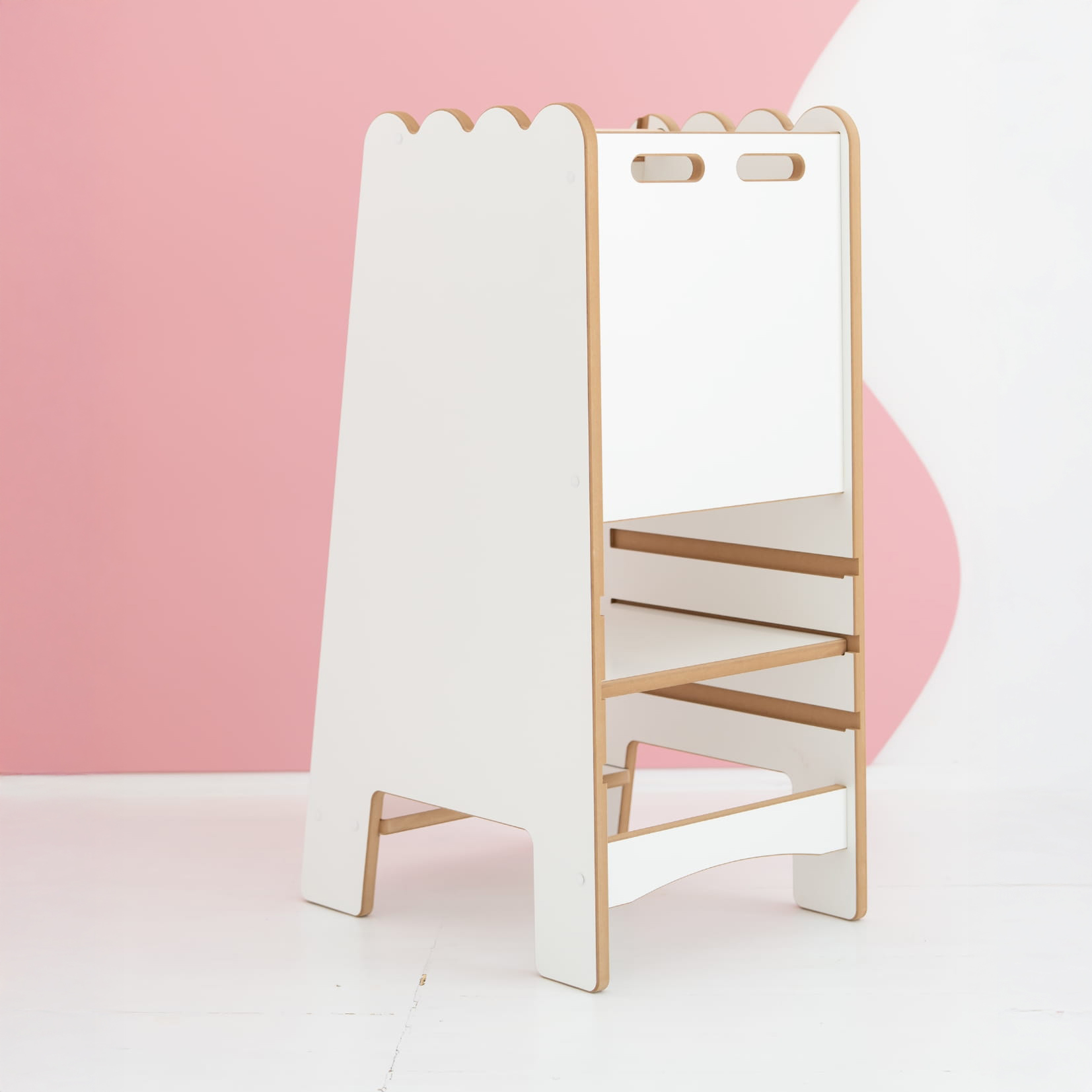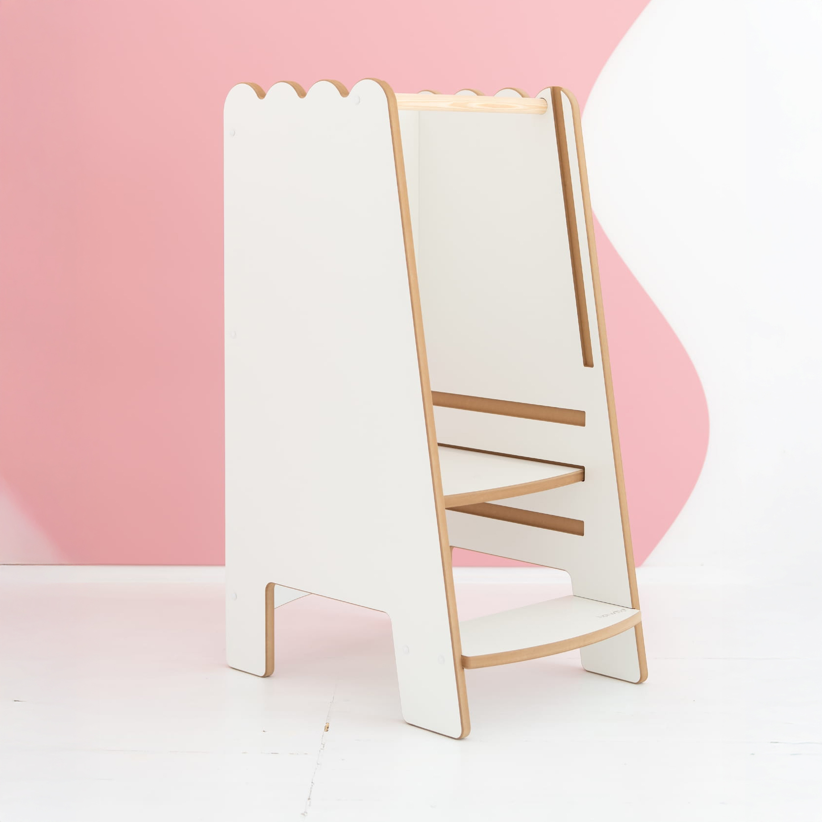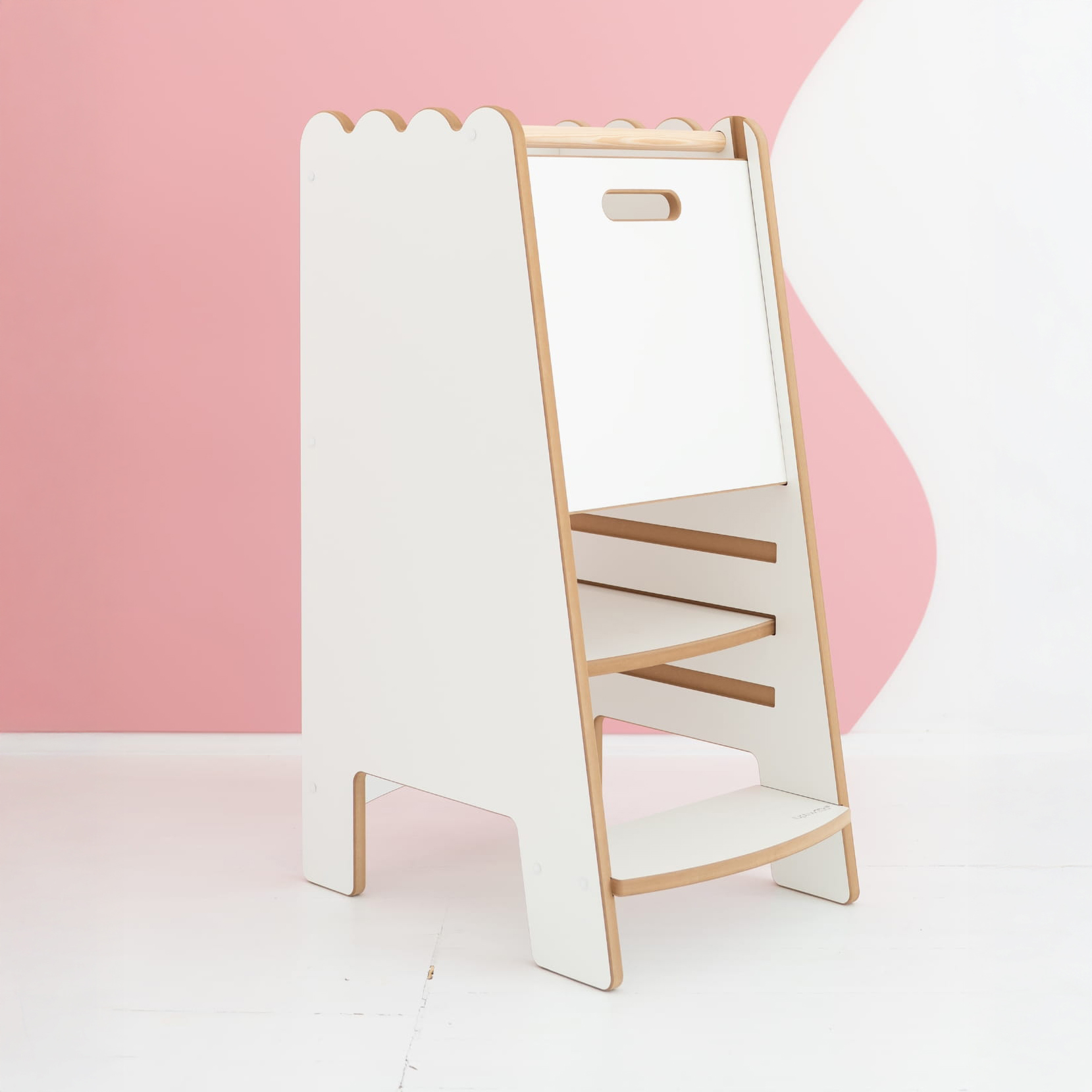 Montessori Virtuvės Bokštelis BUBBLE Safe Baltas. Saugiausias pagalbininkas mažoms rankytėms ir dideliems atradimams. Yra akimirka, kurią pažįsta visi tėvai: ant viryklės verda makaronai, orkaitėje kepa pyragas, o mažylis nori tik vieno – būti kartu, matyti, liesti, padėti. Montessori virtuvės bokštelis BUBBLE Safe sukurtas būtent tam. Tai ne tik baldas, bet ir saugi erdvė vaikui dalyvauti kasdieniuose šeimos ritualuose.