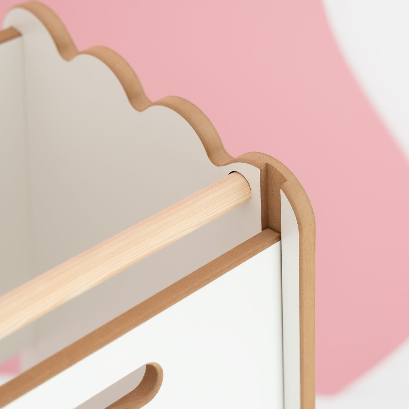 Išskirtinis šio modelio akcentas – žavinga banguota detalė viršuje. Ji suteikia švelnumo, žaismingumo ir puikiai įsilieja į modernius vaikų interjerus. Tai tas mažas dizaino elementas, kurį iš karto pastebi ir vaikai, ir tėvai.