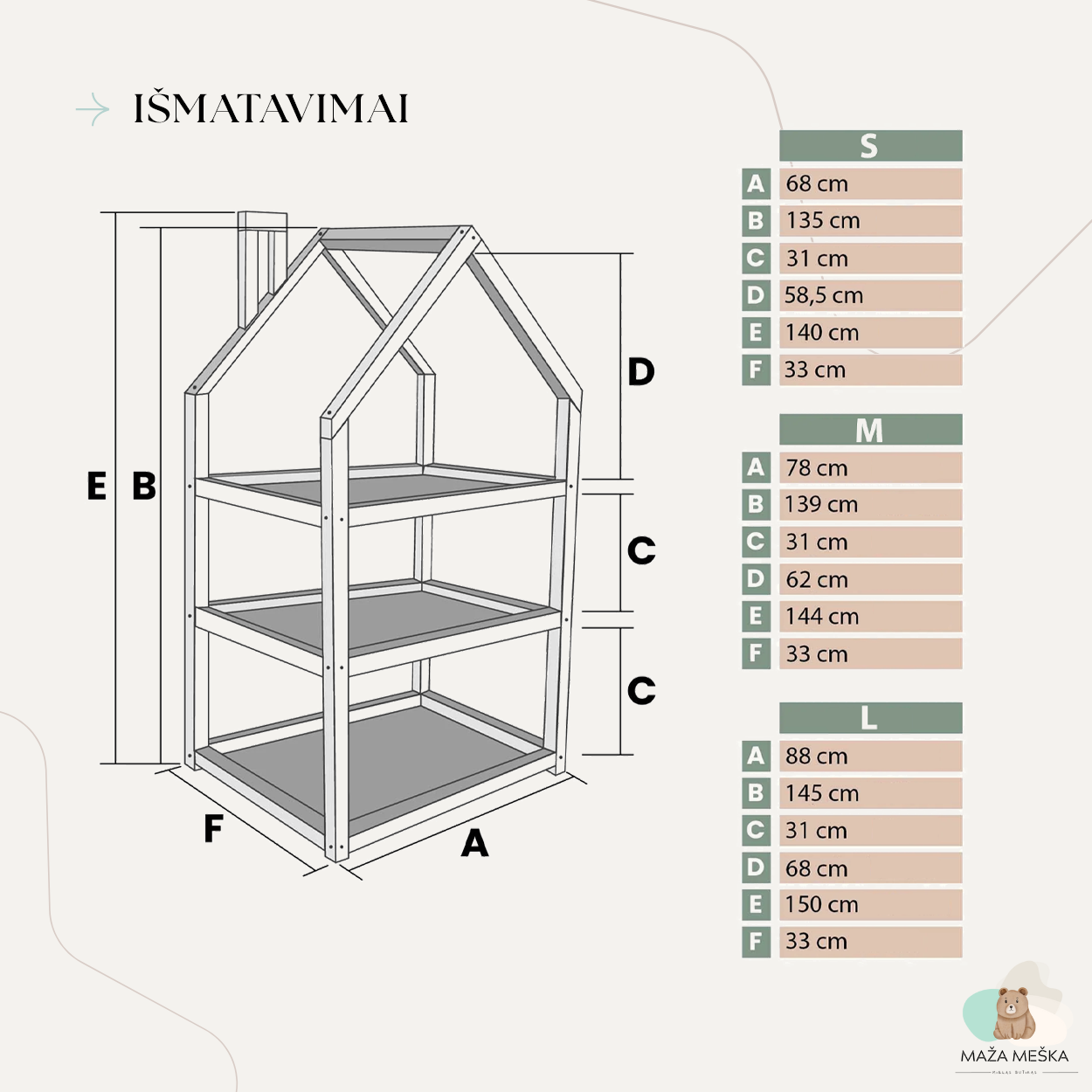 Namo formos dizainas yra ne tik funkcionalus, bet ir jaukus, leidžiantis kurti žaismingą bei draugišką atmosferą. Natūrali mediena suteikia tvirtumo ir ilgaamžiškumo, o jos estetika prisideda prie ramesnės, natūralesnės aplinkos kūrimo. Ši lentyna taps ne tik praktišku, bet ir ugdomuoju elementu Jūsų mažylio gyvenime – joje vaikas galės atrasti savarankiškumo džiaugsmą ir mokytis tvarkytis nuo pat mažens.