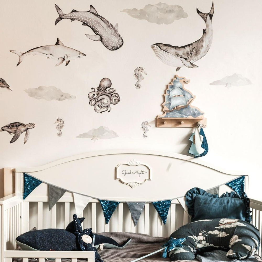 Ryklys, trys jūrų arkliukai, du vėžliai, aštuonkojis, bangininis ryklys ir žinoma pats banginis! Ši nuostabi grupelė 9 gyvūnų puikiai papuoš Jūsų sieną.