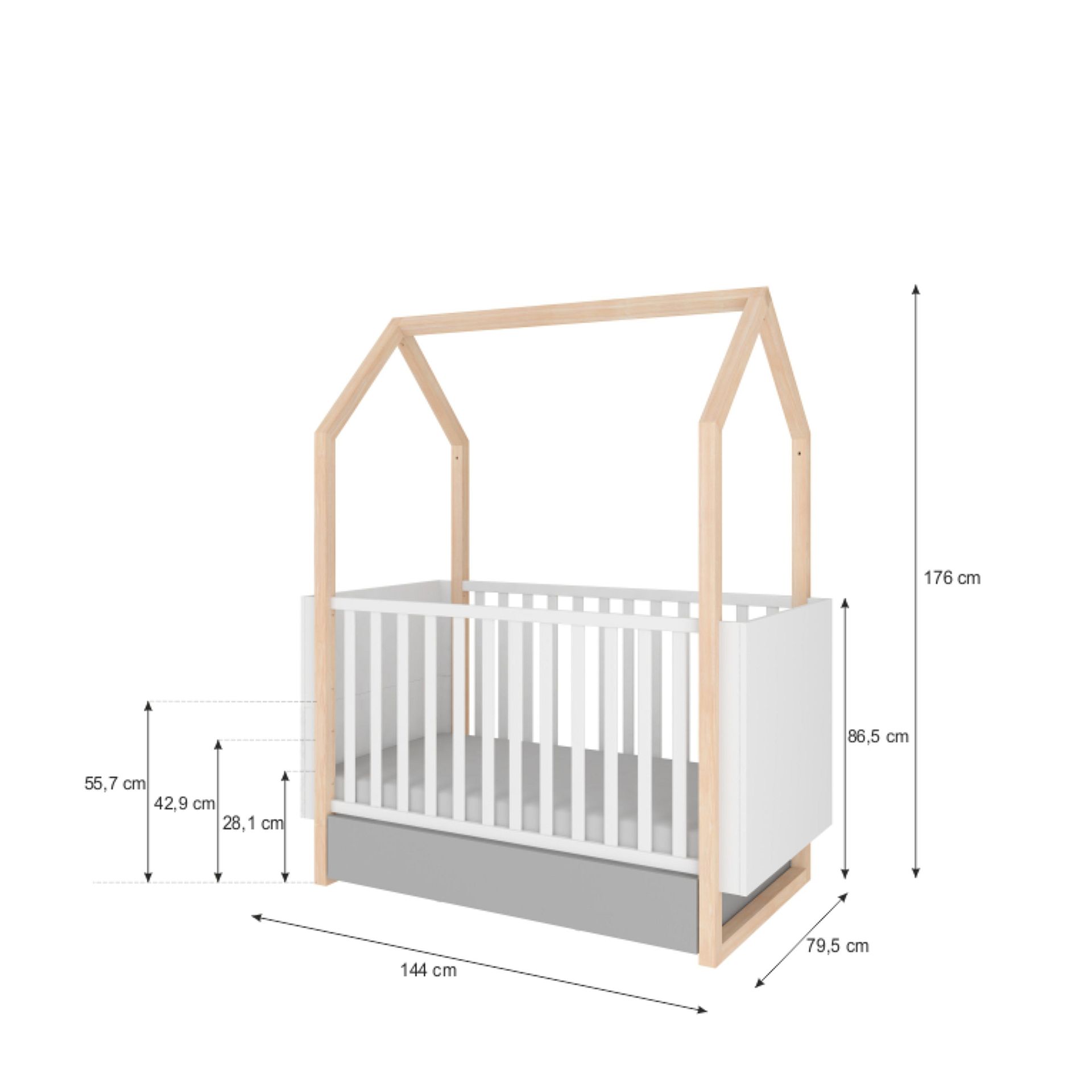 Lovelės čiužinio pagrindas reguliuojamas trimis aukščiais (55,6 / 42,8 / 25,2 cm), tad ji auga kartu su vaiku. Nuo kūdikio iki savarankiško mažylio. Vienoje pusėje esančios dvi išimamos grotelės leidžia vaikui savarankiškai įlipti ir išlipti iš lovos, ugdant nepriklausomybę. 👶