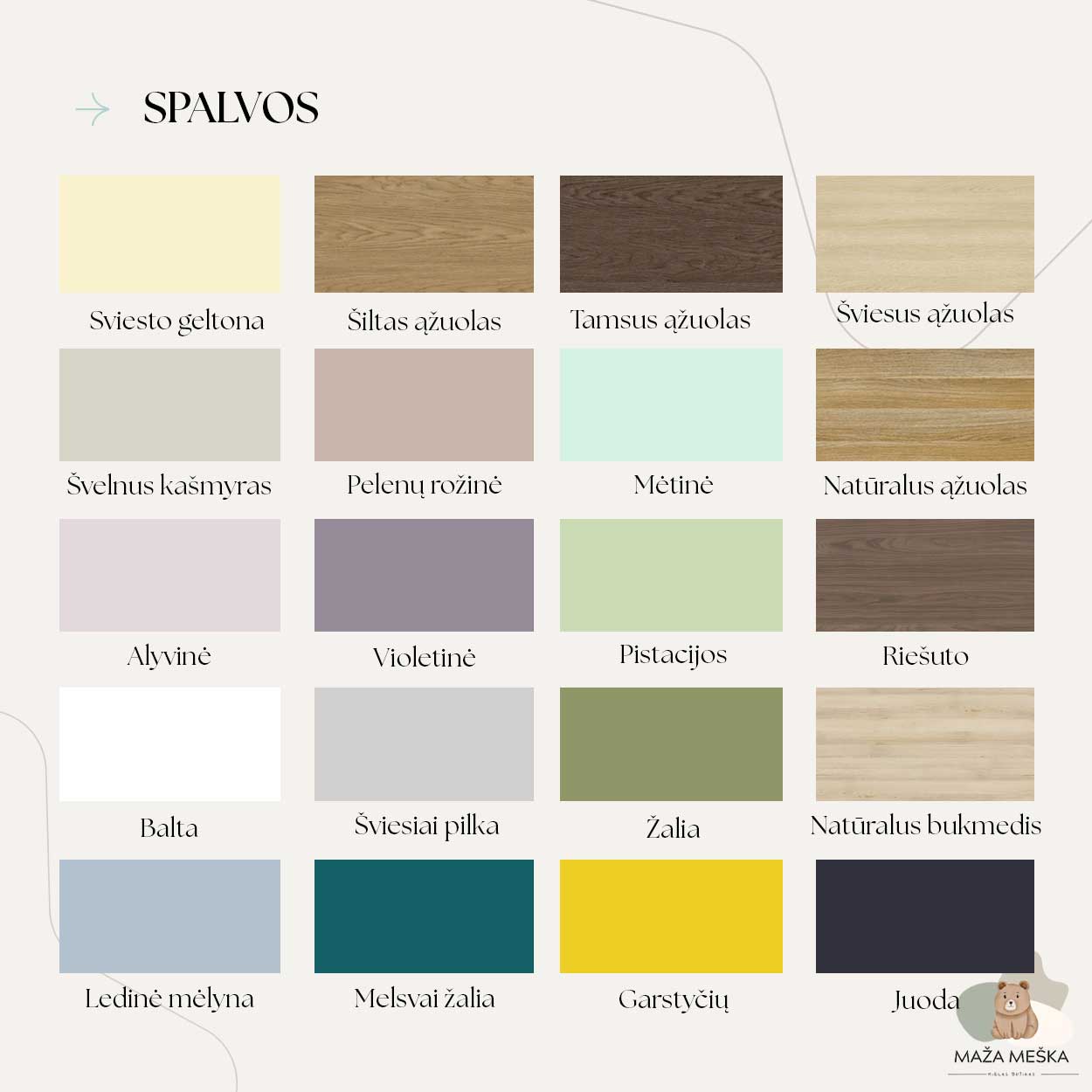 | Kojelių spalvos | Juoda, Balta, Bukmedis, Riešutas, Ąžuolas, Balintas ąžuolas |
