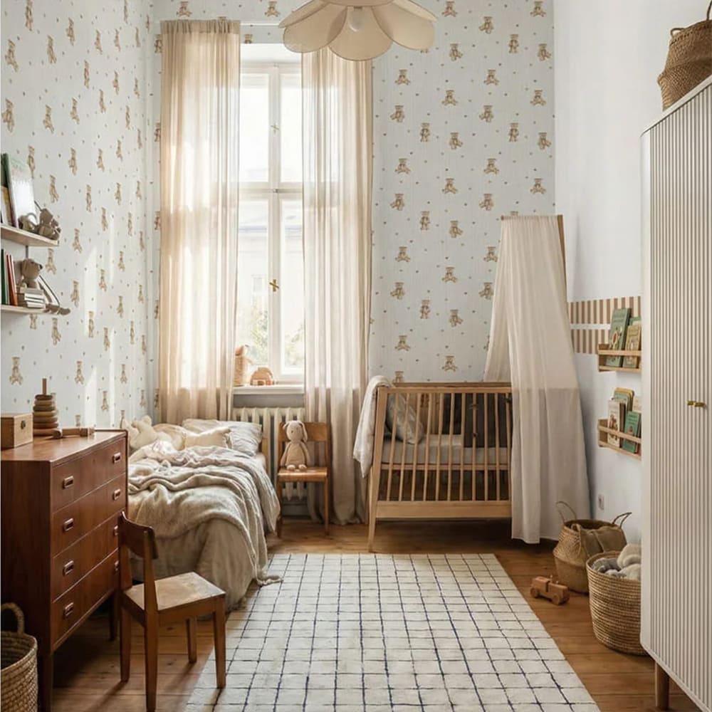 🧸 Meškučių dydis – apie 8–10 cm., todėl raštas atrodo proporcingas ir dailus ant sienos. Kokybiškos medžiagos ir apgalvotas dizainas užtikrina, kad tapetai ilgai išliks gražūs ir tinkami vaikų erdvei.