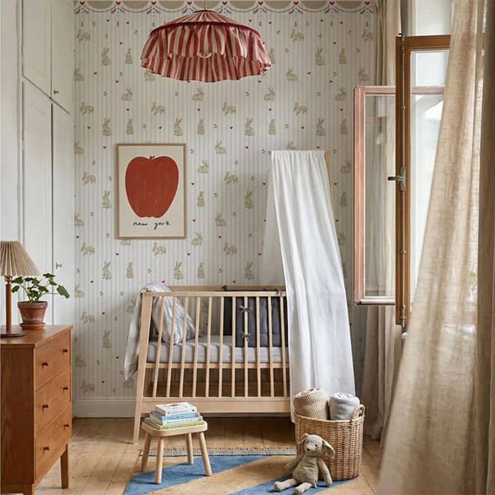 ⭐ Triušiukų motyvai yra 8–12 cm dydžio, todėl raštas atrodo proporcingas ir dailus ant sienos. Kokybiškos medžiagos ir apgalvotas dizainas užtikrina, kad tapetai ilgai išliks gražūs ir tinkami vaikų erdvei.