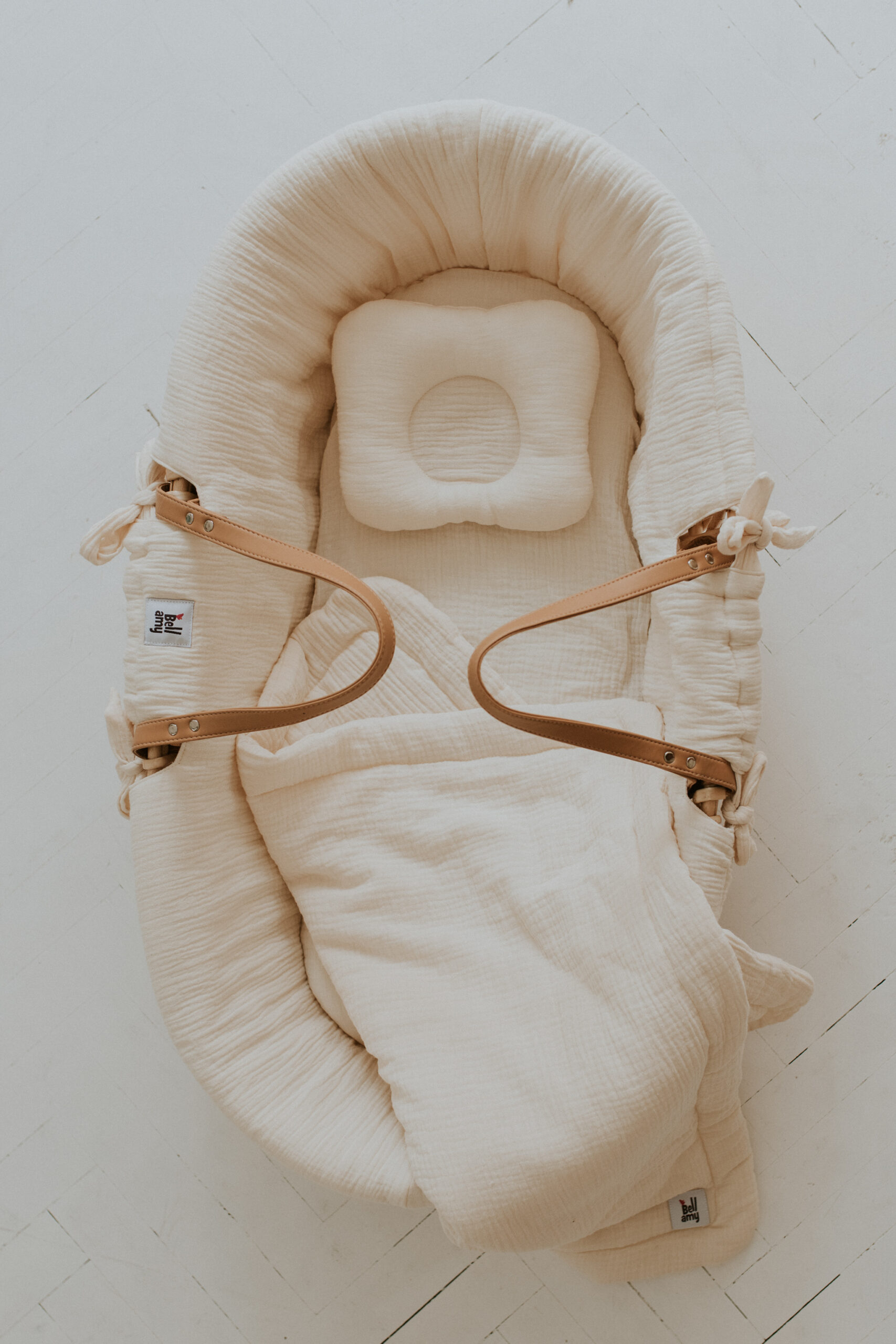 Komplektą sudaro patalynė su užpildu, paklodė bei pagalvėlė su specialia įduba galvai.