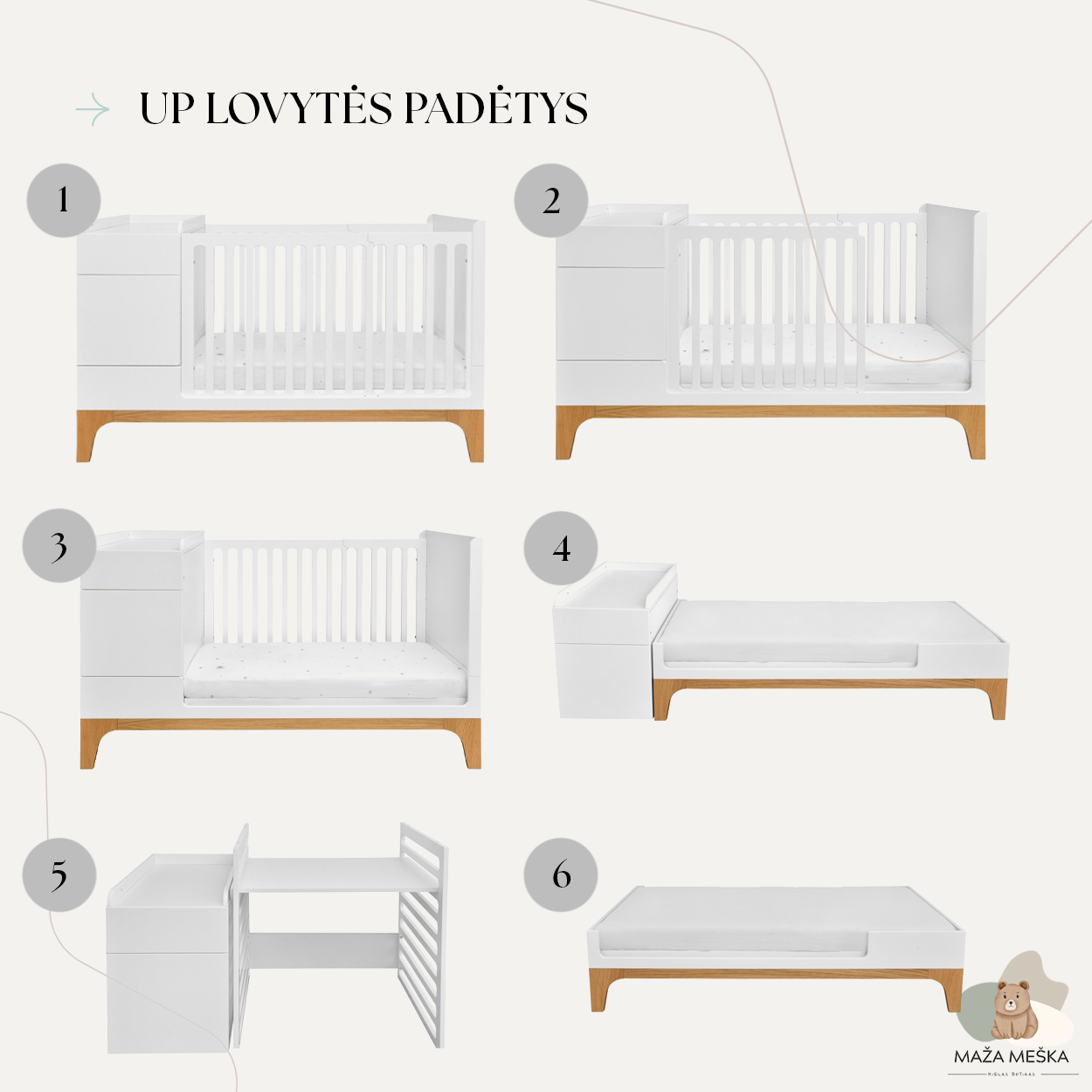 Kūdikystėje – tai saugi ir jauki vieta miegui, poilsiui ir žaidimams. Tėvams – praktiška erdvė su vieta daiktams laikyti. Lovytės čiužinio pagrindas reguliuojamas trimis aukščiais (60,5 / 47,8 / 29 cm), kad būtų patogu tiek mažyliui, tiek prižiūrinčiam suaugusiajam. 👶
