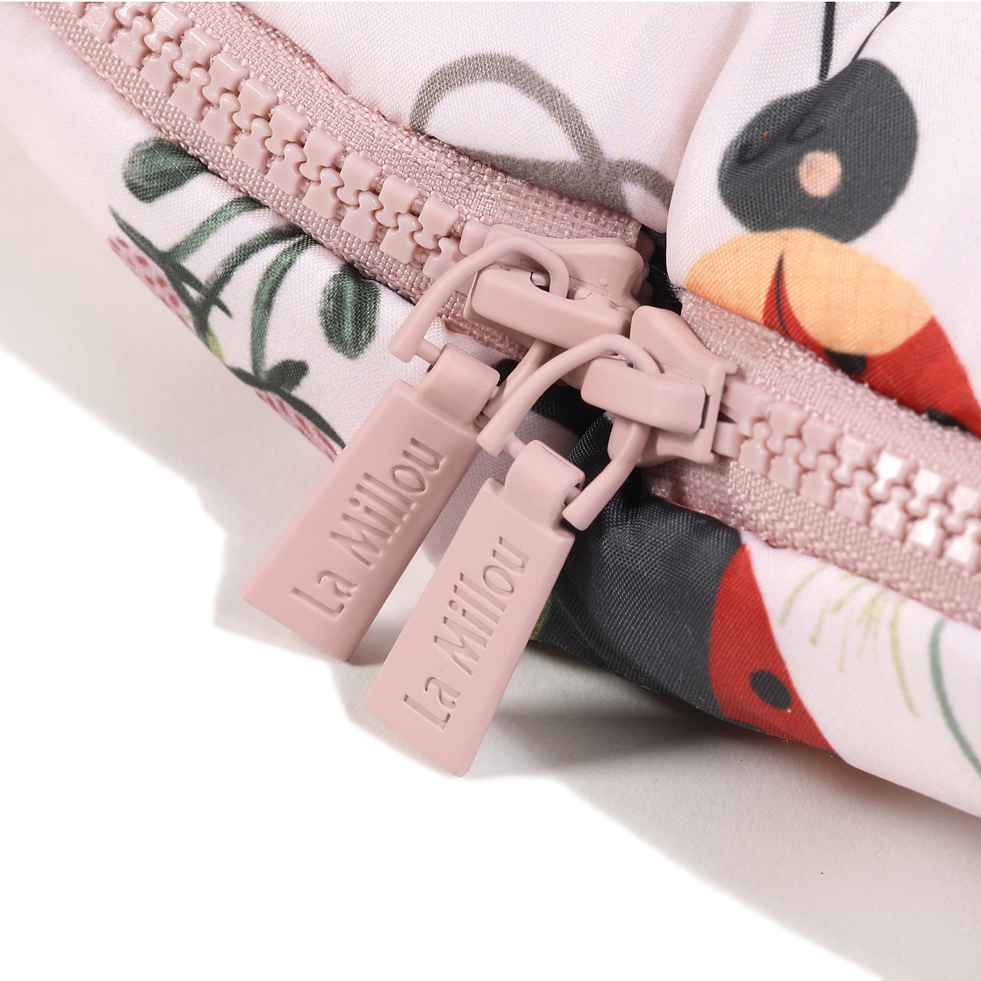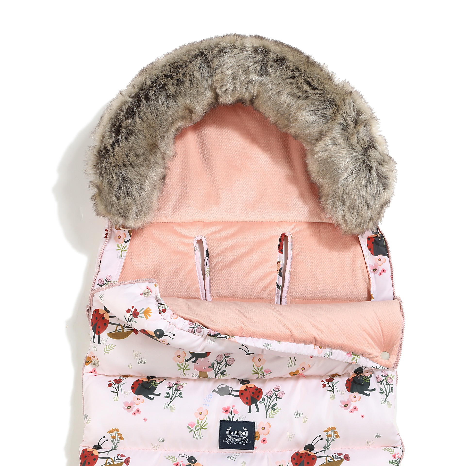 Miegmaišio šonai turi aukštos kokybės užtrauktukus su patogiomis gumytėmis. Užtrauktukai atidaromi iš viršaus ir apačios, todėl galima reguliuoti ventiliaciją arba visiškai nuimti dangą, sukuriant šiltą ir minkštą įdėklą vežimėliui. Šonų atitraukimas leidžia miegmaišį patogiai išplėsti ir pritvirtinti su spaustukais. Nugaros pusėje esantys angos tinka 5 taškų saugos sistemai daugumoje vežimėlių. Papildomas audinio sluoksnis ant gobtuvo nugaros užtikrina, kad miegmaišis nepaslystų vežimėlio nugarėlėje.