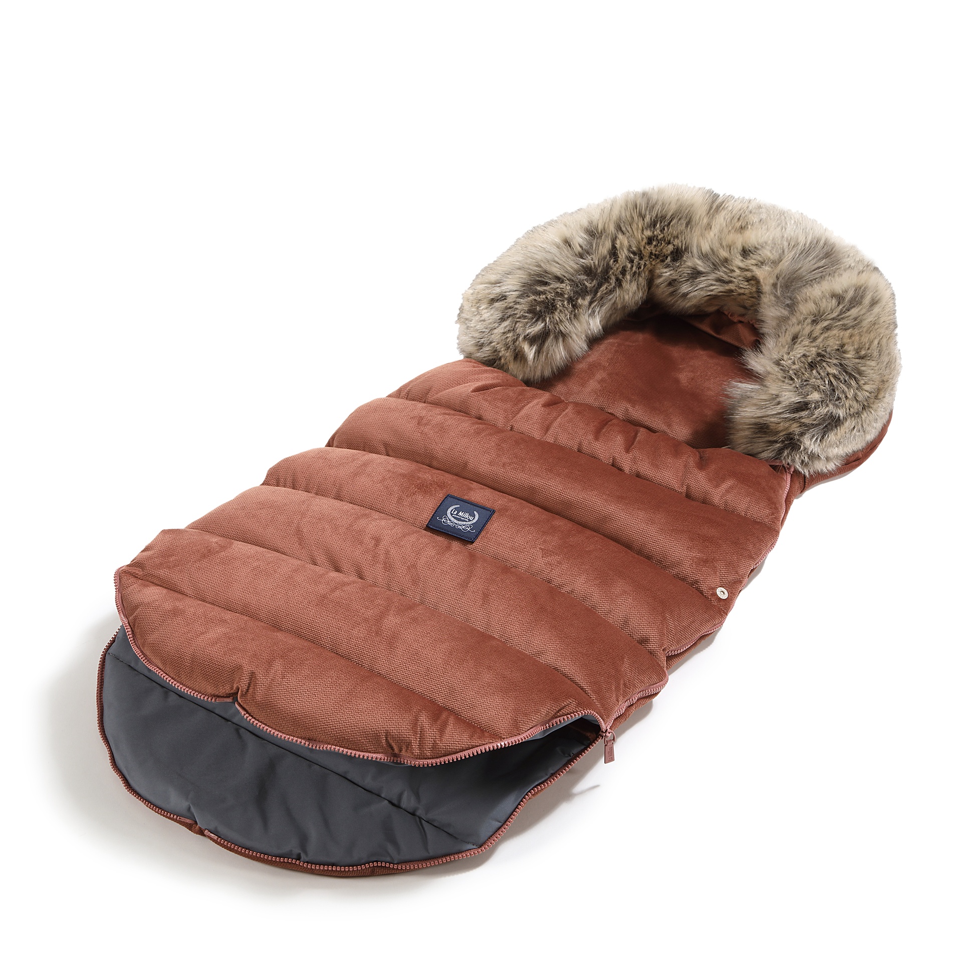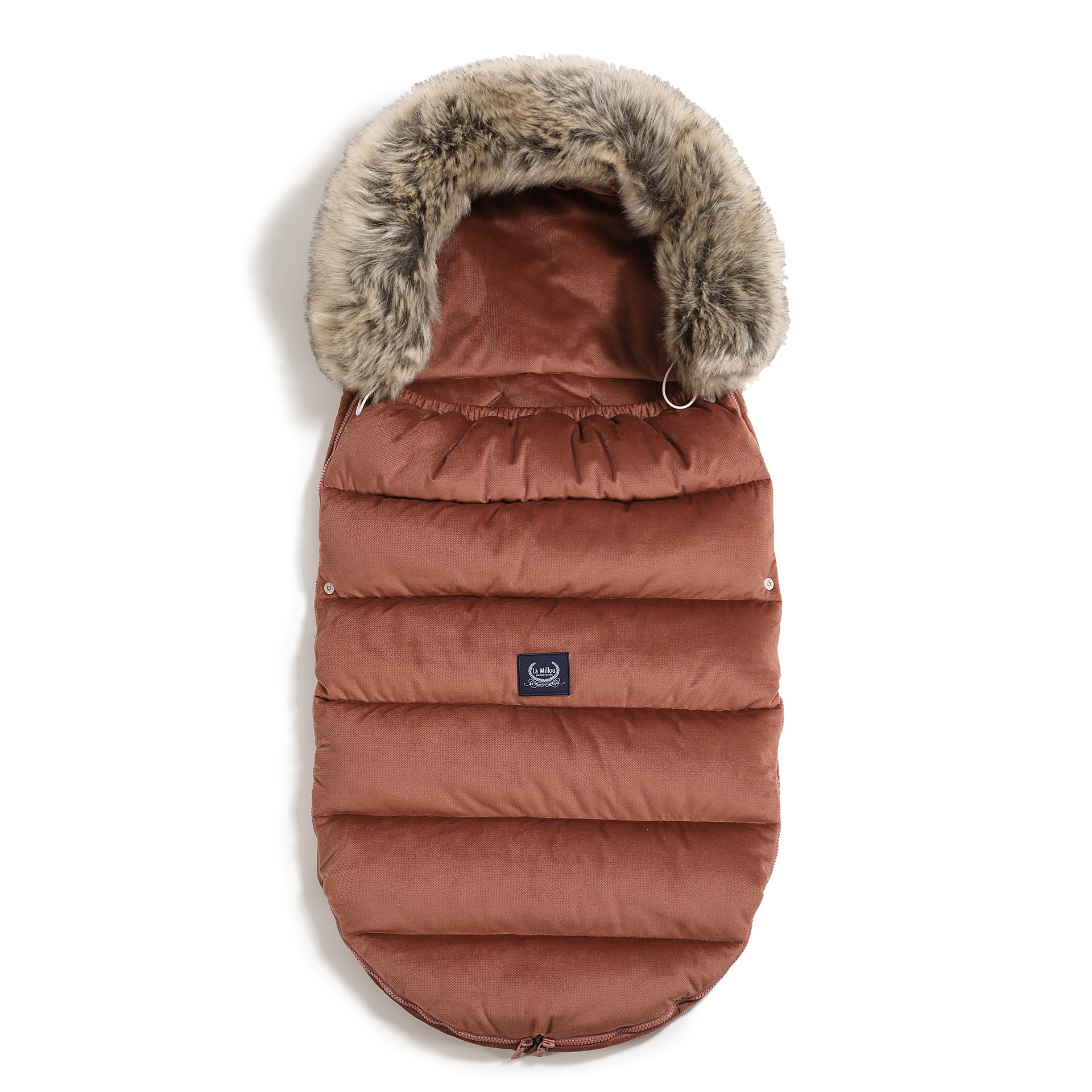 Galvą saugo šilta gobtuvo dalis, papuošta stilingu netikru kailiu, kurį galima nuimti pagal poreikį. Gobtuvas turi siūtas raišteles, leidžiančias reguliuoti dydį pagal vaiko galvą. Viršutinėje dalyje naudojamas pūkuotas, antialerginis užpildas, kuris suteikia papildomą šilumą ir komfortą. Apatinė miegmaišio dalis padengta matiniu poliuretano audiniu, kuris leidžia lengvai nuvalyti nešvarumus.