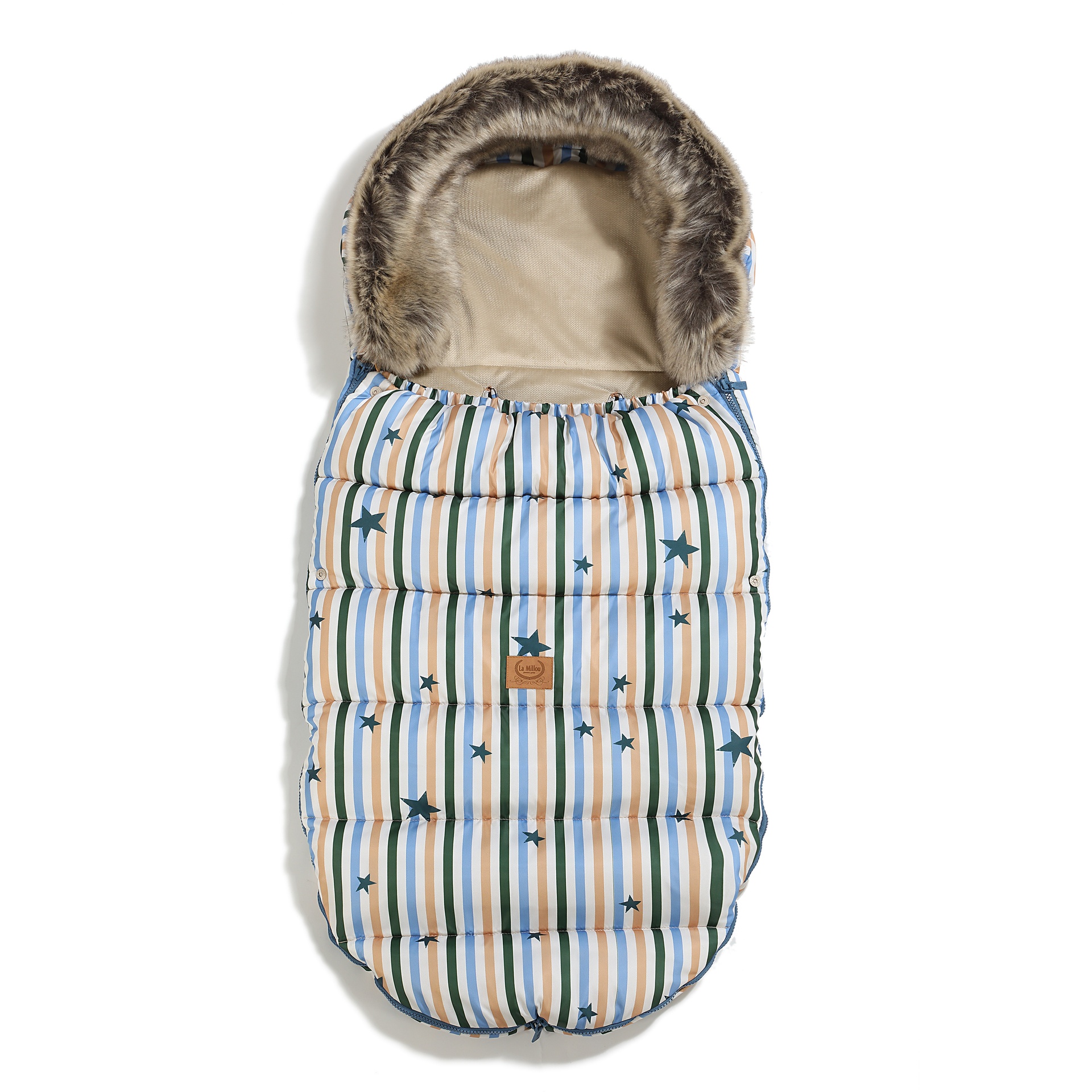 Galvą saugo šilta gobtuvo dalis, papuošta stilingu netikru kailiu, kurį galima nuimti pagal poreikį. Gobtuvas turi siūtas raišteles, leidžiančias reguliuoti dydį pagal vaiko galvą. Viršutinėje dalyje naudojamas pūkuotas, antialerginis užpildas, kuris suteikia papildomą šilumą ir komfortą. Apatinė miegmaišio dalis padengta matiniu poliuretano audiniu, kuris leidžia lengvai nuvalyti nešvarumus.